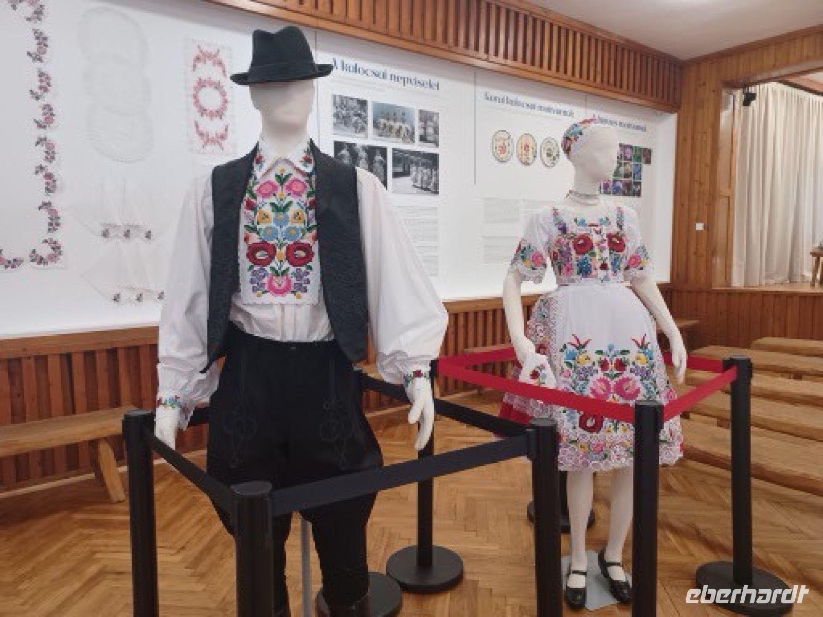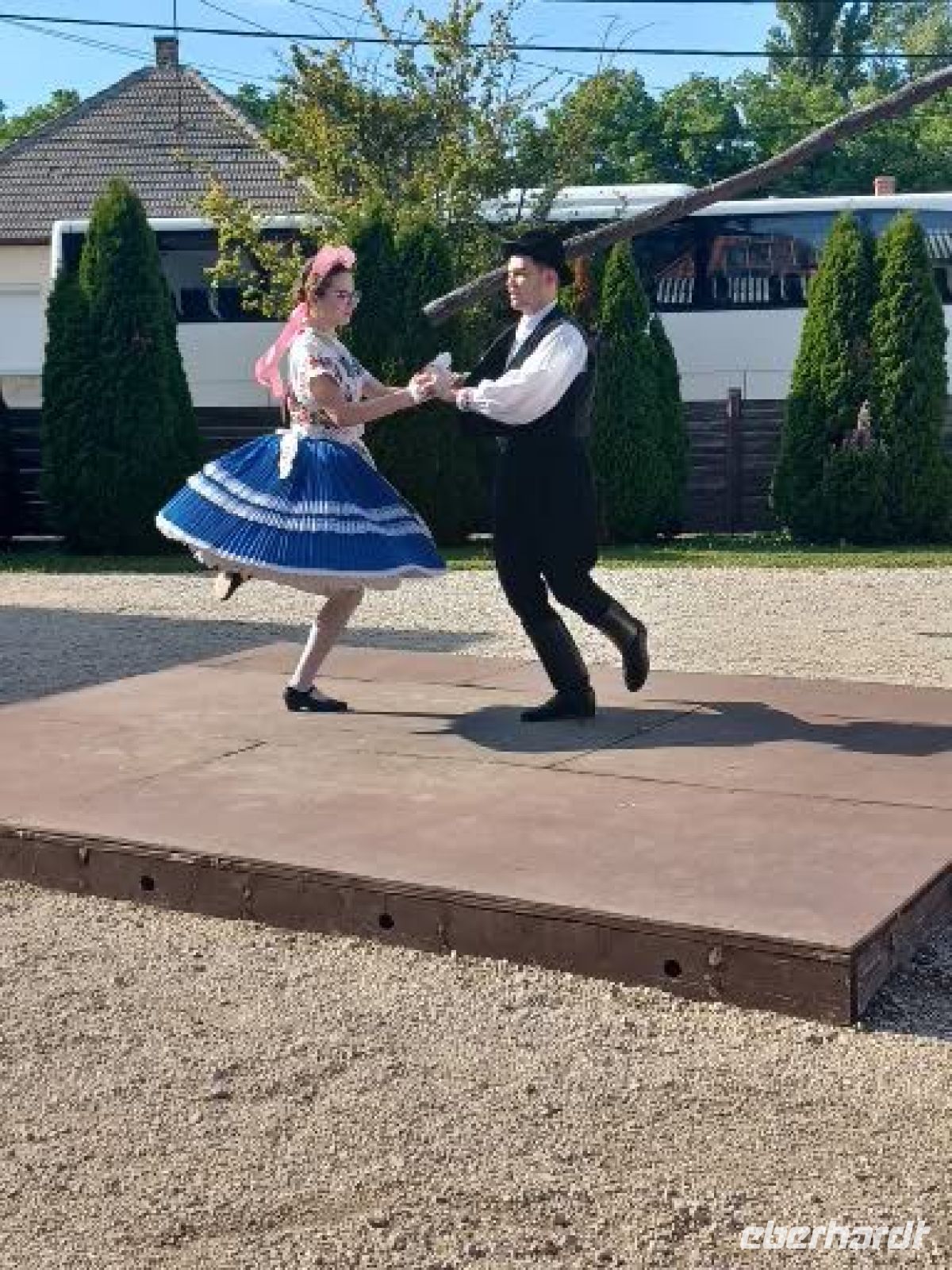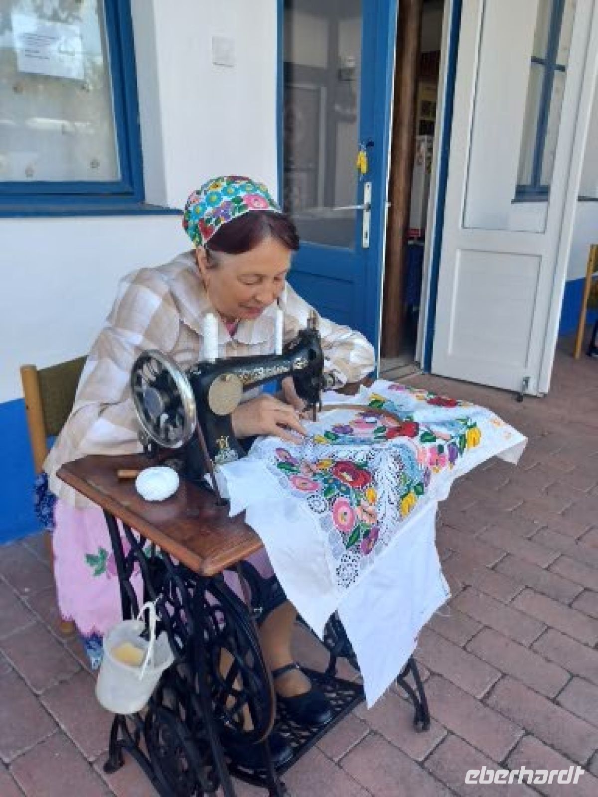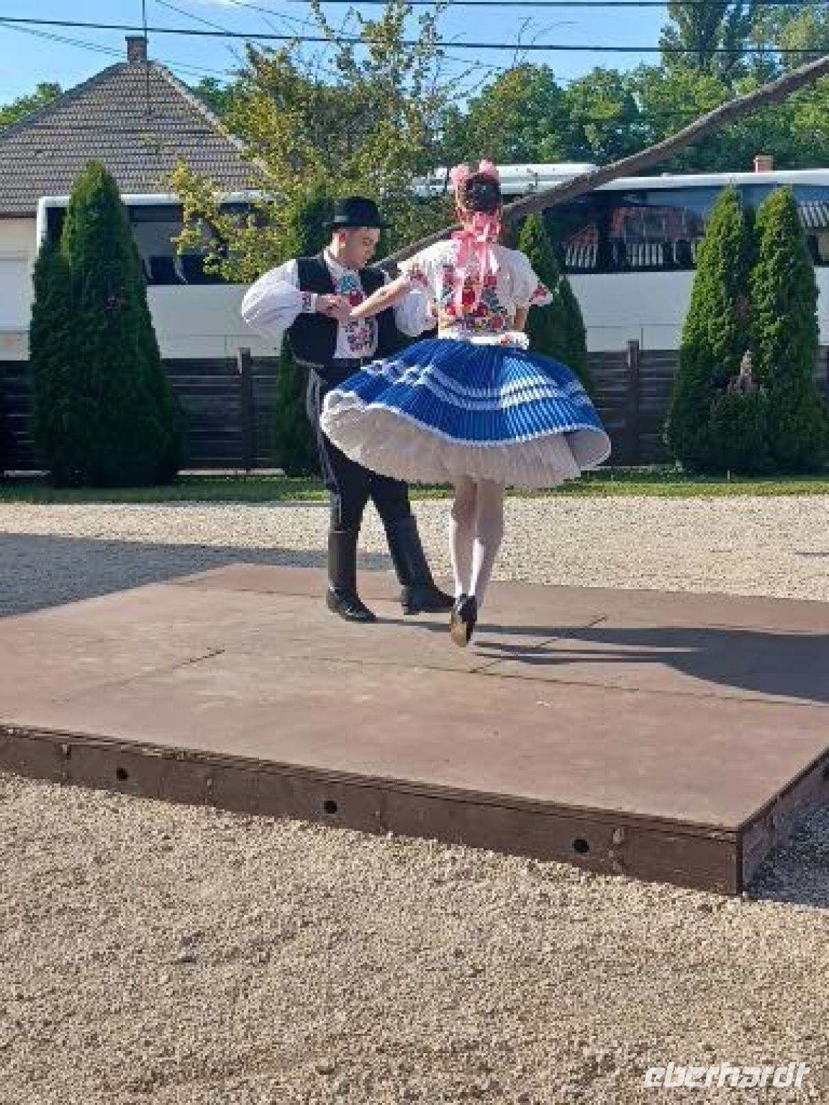 Die Weiterfahrt führt direkt nach Kalocsa Stadt, die auch bekannt ist für ungarische Volkskunst. Ein Trachtenpaar begrüßt uns am Museumseingang, Schaukunsthandwerk (Stickerei u. Eierbemalung) werden durch jeweils eine Dame aus dem Ort demonstriert. Das junge Trachtenpaar bietet eine Tanzvorführung, die Trachten werden erläutert u. der Reifrock der Dame entpuppt sich mit zahlreichen Unterröcken. Ein sehr lebendiger Museumsbesuch, der uns gefällt.