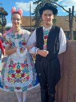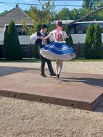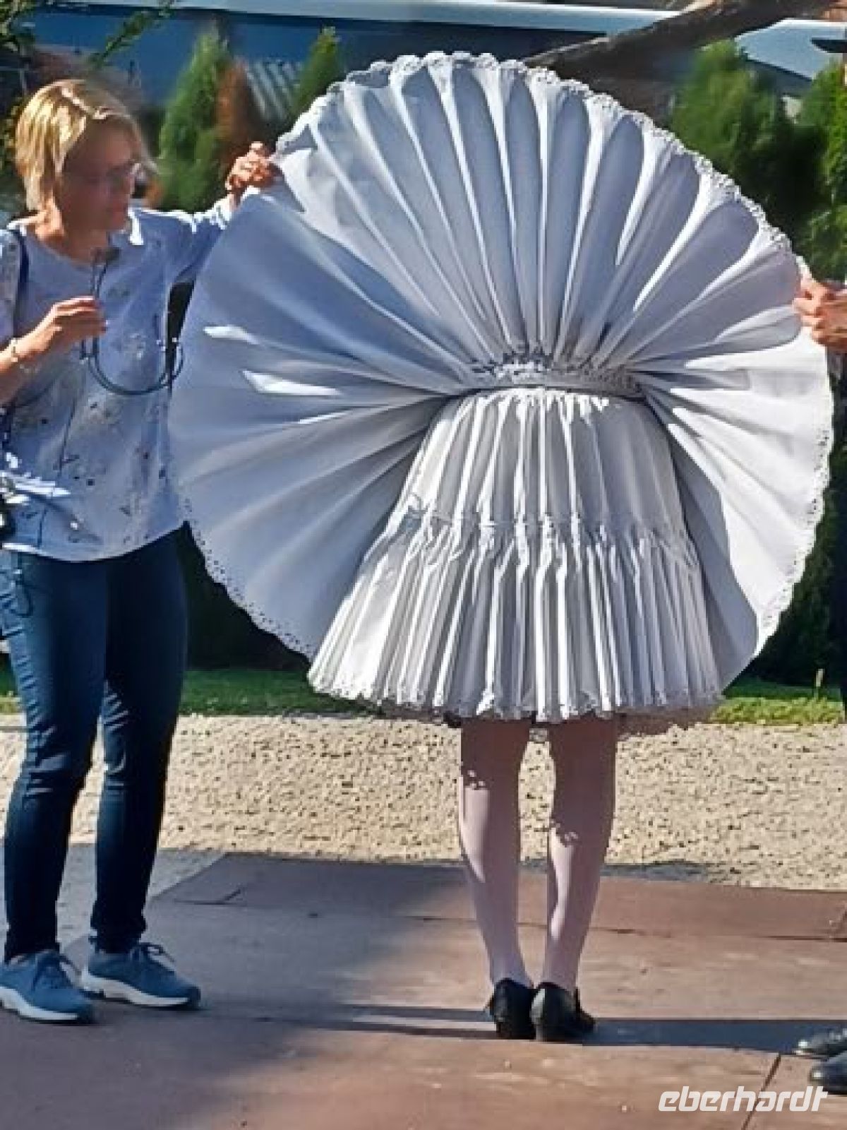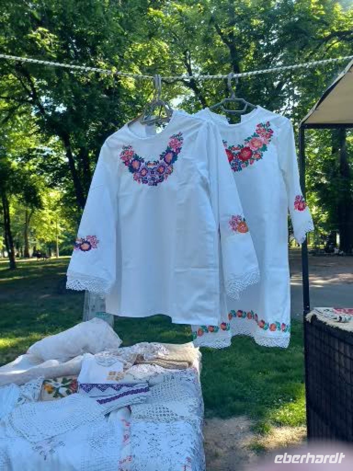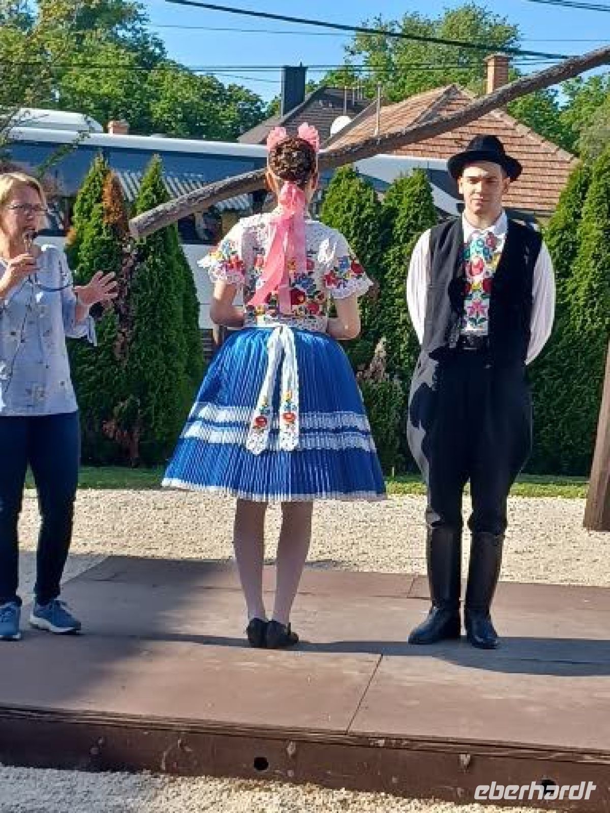 Die Weiterfahrt führt direkt nach Kalocsa Stadt, die auch bekannt ist für ungarische Volkskunst. Ein Trachtenpaar begrüßt uns am Museumseingang, Schaukunsthandwerk (Stickerei u. Eierbemalung) werden durch jeweils eine Dame aus dem Ort demonstriert. Das junge Trachtenpaar bietet eine Tanzvorführung, die Trachten werden erläutert u. der Reifrock der Dame entpuppt sich mit zahlreichen Unterröcken. Ein sehr lebendiger Museumsbesuch, der uns gefällt.