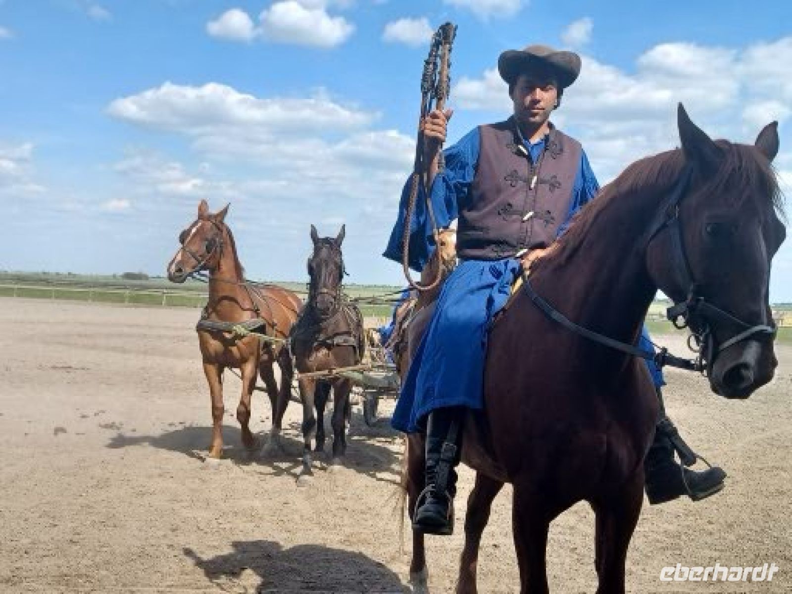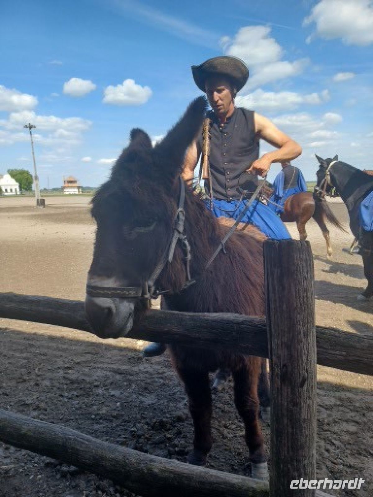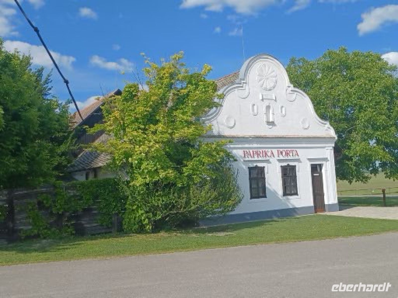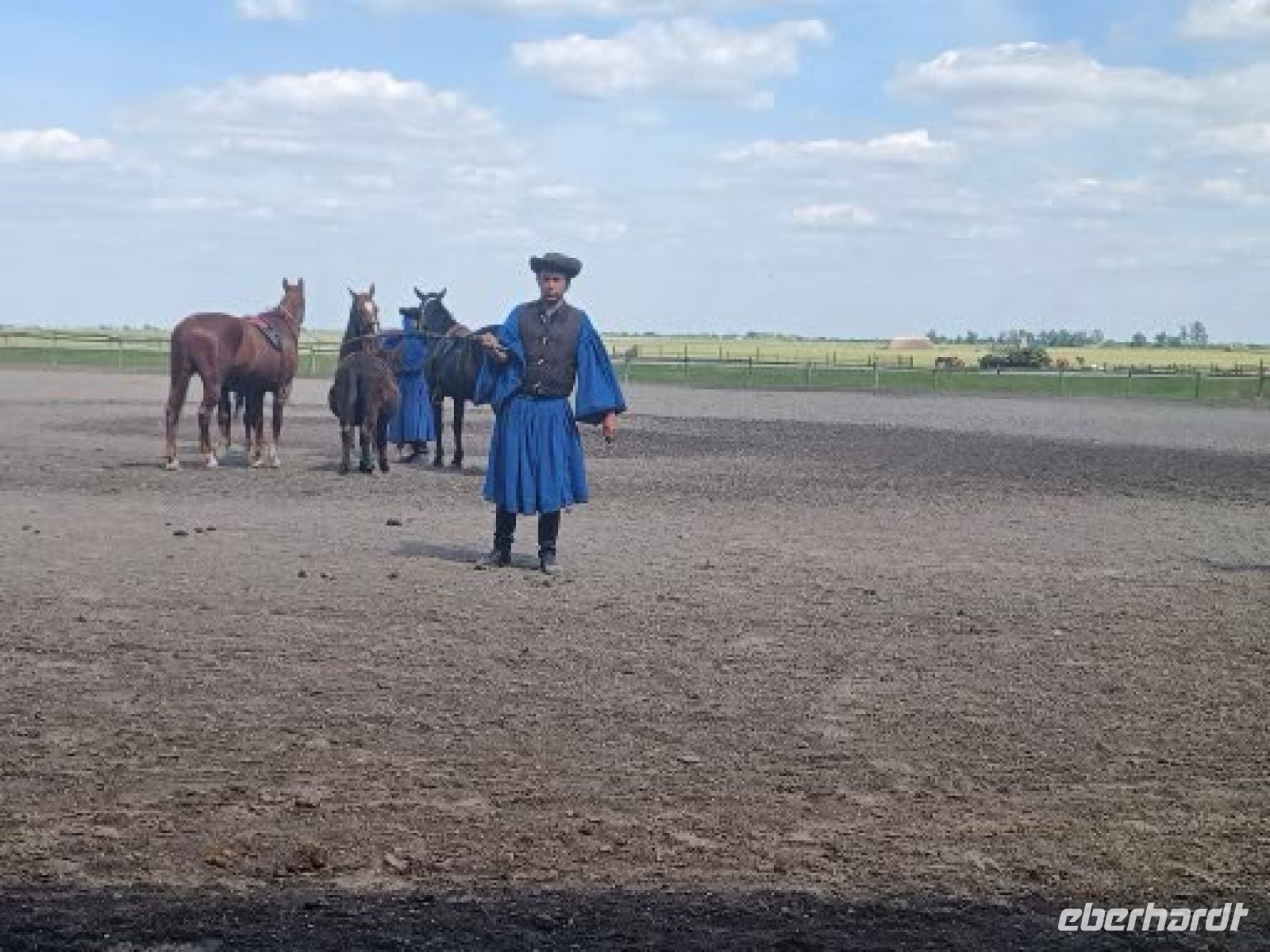 Wie ergeht es den anderen 16 Gästen, die den Ausflug in die Puszta gewählt haben? Der Weg ist das Ziel...wir fahren durch einen Teil der ungarischen Tiefebene u. erfahren von der Gästeführerin, Viktoria, über Probleme der Landwirtschaft, des Klimawandels, wie Trockenheit. Auch der Fachkräftemangel ist ein durchgehendes Problem in Südosteuropa. All diese Themen führen letztlich dazu, dass Ungarn als bekanntes Lebensmittelexportland nun auch Lebensmittel importieren muss. Viktoria stimmt uns über die Besonderheiten der Puzsta ein bis wir schließlich in Kalocsa, die berühmte Paprikagegend mit der Bacos Puszta, erreichen. Pferde -u. Kutschenvorführungen werden von Gästeführern kommentiert; ebenfalls der Besuch des Paprikamuseums. Es bietet sich die Gelegenheit zur Besichtigung der Stallungen u. zum Erwerb von traditionellen ungarischen Produkten. Schmalzbrote u. Getränkesäfte sowie Wein- u. Marillenschnaps (Barask Palinka) werden verkostet. Nun dürfen wir selbst die Kutschen besteigen, u. werden über Weiden direkt zu den Rindern, Schafen u. Pferden gefahren. Alle Tiere werden in Freilandzucht gehalten. An der Kutschfahrt nehmen bei schönem Wetter alle Gäste teil.