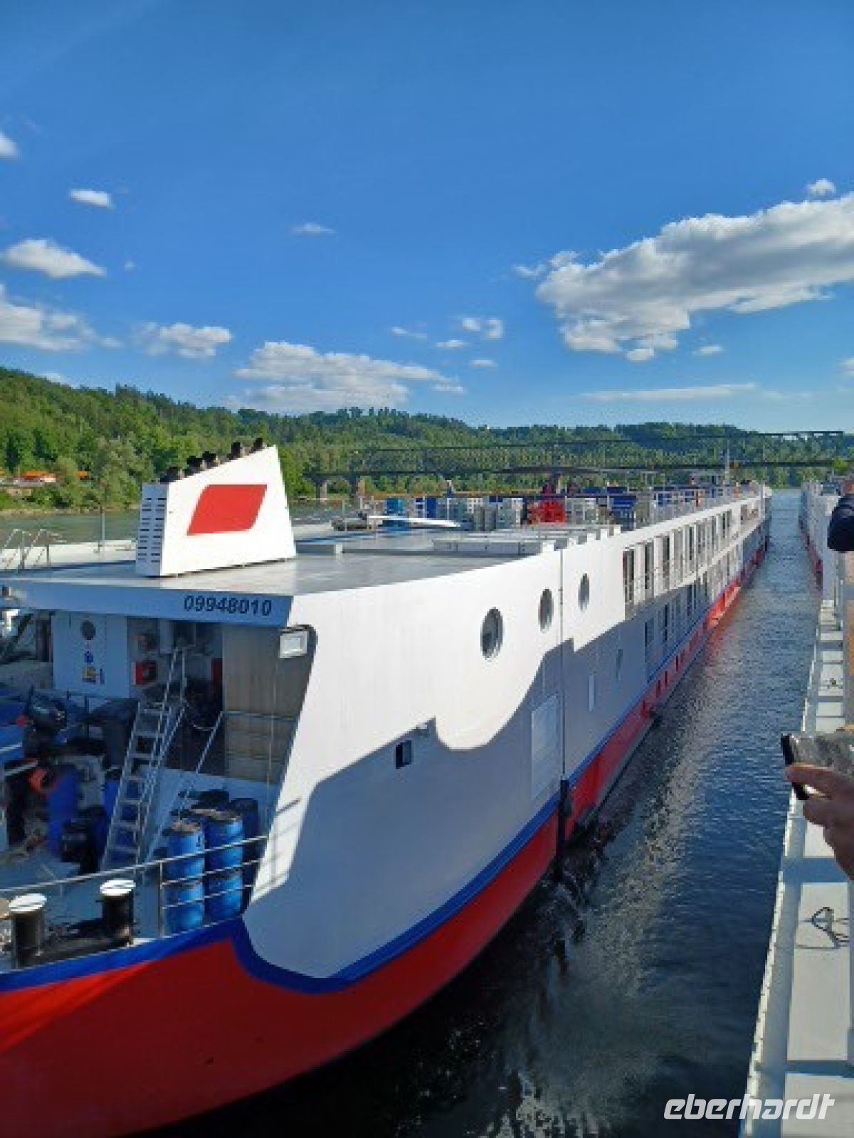 Wir starten ab Dresden: eine Chauffeurin lenkt den Bus die 1. halbe Strecke. Beata teilt sich die Route bis Passau mit Mario, u. wir fühlen uns gut umsorgt. Ein Geburtstagskind haben wir auch. Zwei weitere werden während der Schiffsfahrt folgen. In Passau haben wir Gelegenheit, den Dom u. die Altstadt zu besuchen oder an der Donau zu spazieren. In Lindau erwartet uns die MS Viktoria ab 15 Uhr zum Einchecken, und bald ertönt die Nicko Auslaufmusik, die uns bei Verlassen der Häfen auf der Reise begleiten wird. Das Schiff routiert einmal um sich selbst, um in die richtige Fahrtrichtung zu kommen. 28 Eberhardtgäste hoffen auf stetig Wasser unterm Kiel u. auf gutes Sonnendeckwetter für die Reise.
