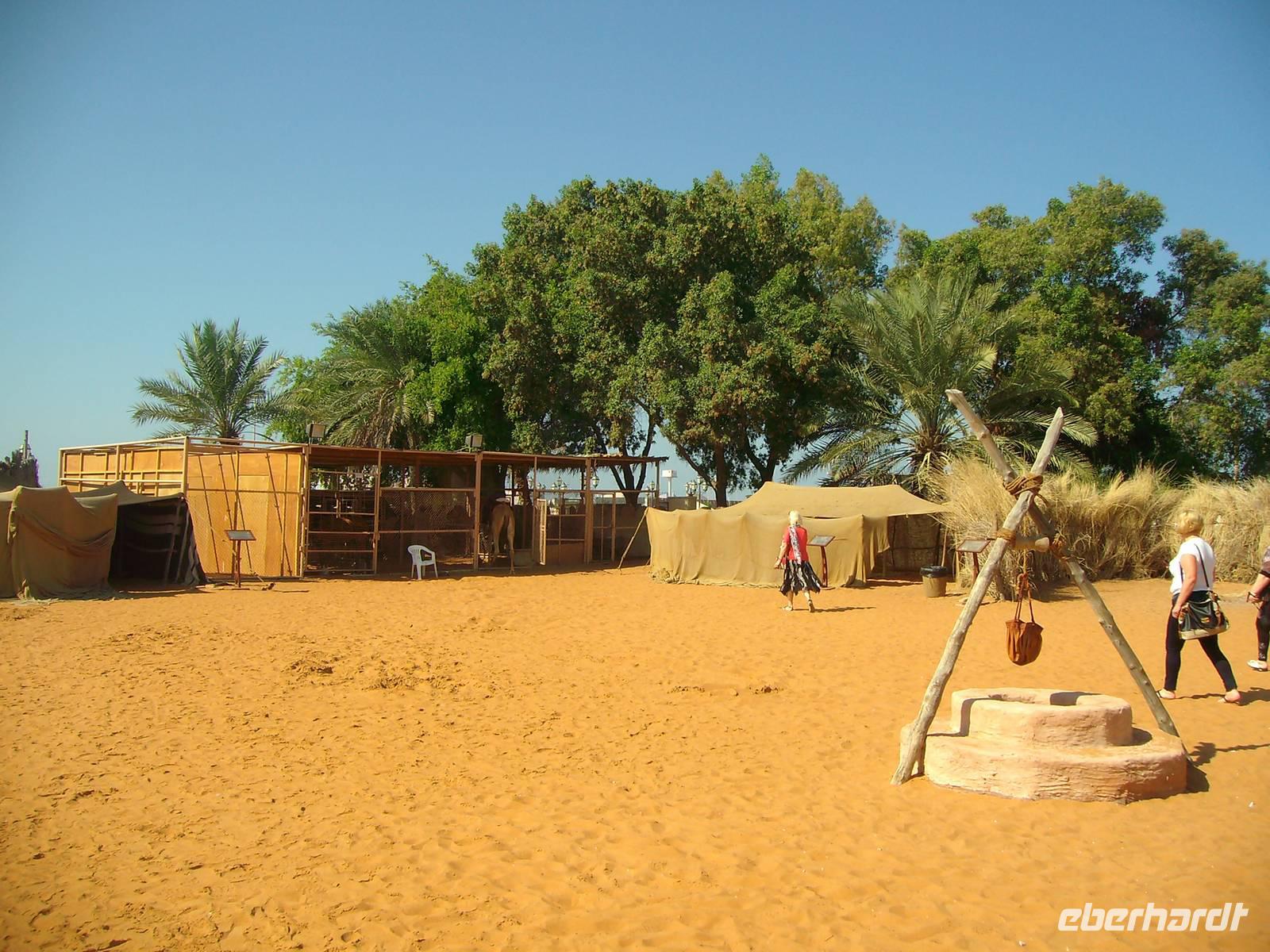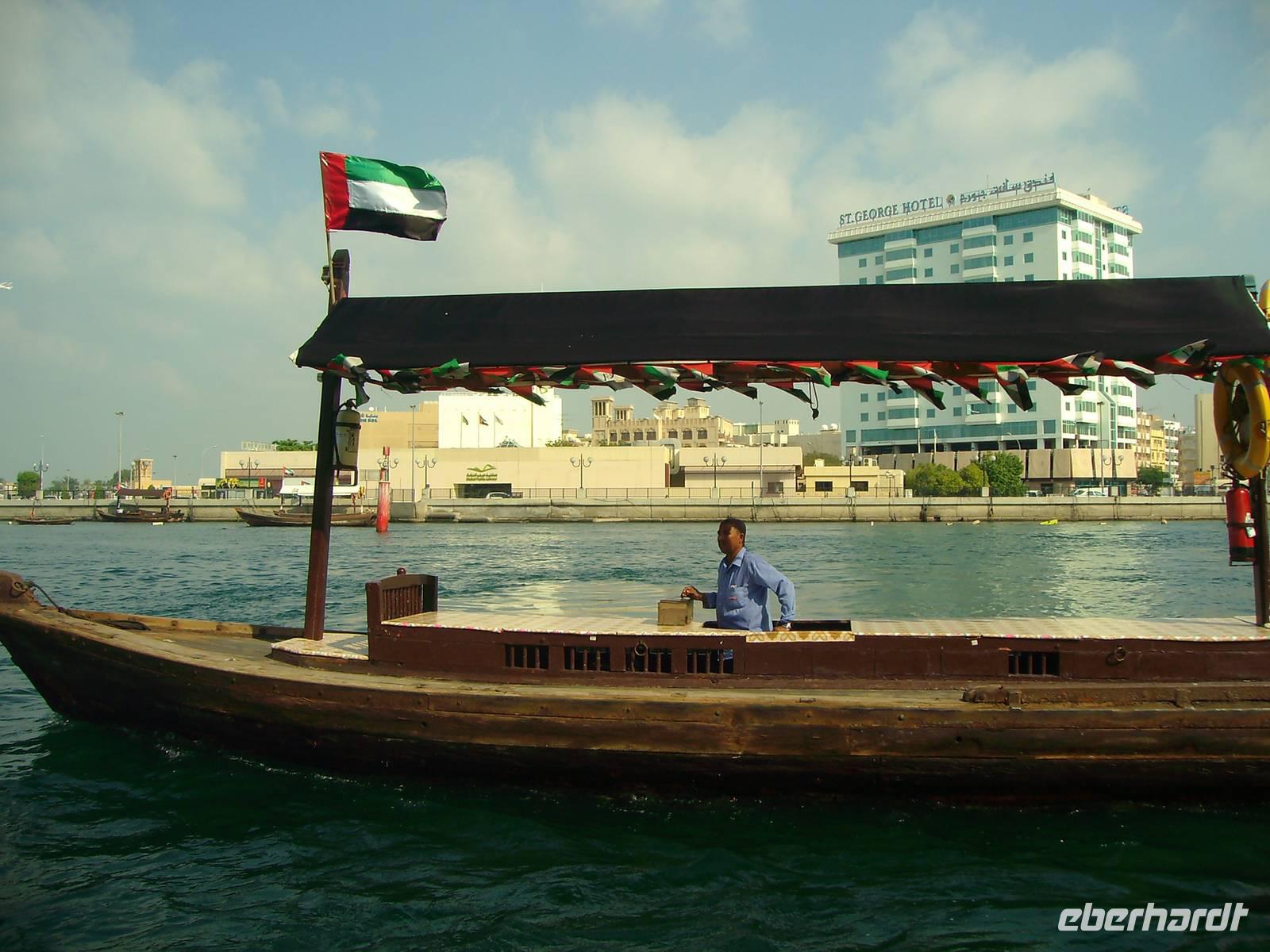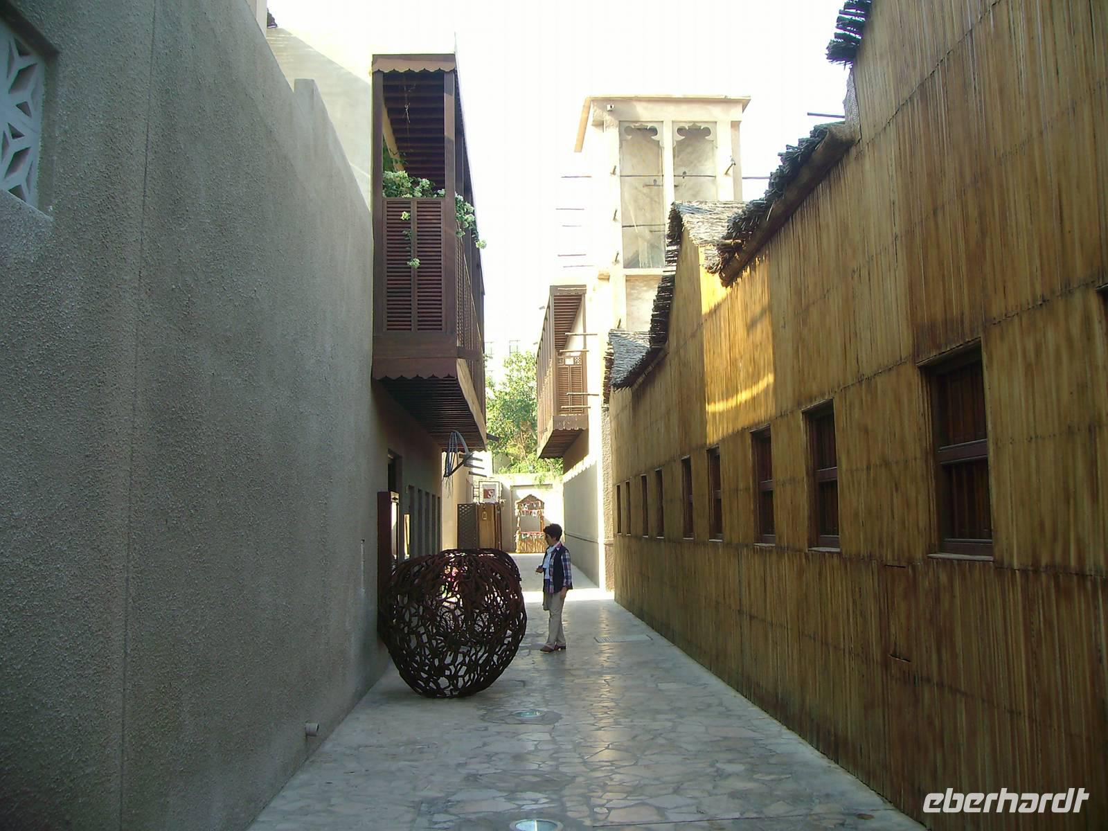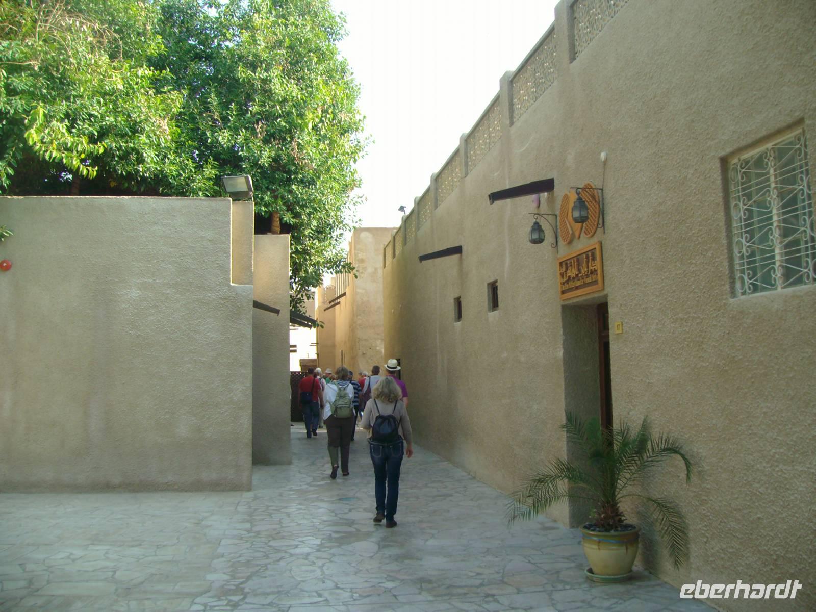 Nach einem reichhaltigen Frühstück im Hotel spazierten wir ganz gemütlich zum Dubai-Museum. Das Gebäude, in dem das Museum untergebracht ist, ist eines der ältesten Gebäude der Stadt und neben dem Museum selbst eine Sehenswürdigkeit. Nahe dem Creek auf der Bur Dubai-Seite befindet sich das Al-Fahidi-Fort, das 1799 erbaut und in dem 1970 das Dubai Museum eröffnet wurde. Das Museum zeigt wie das Leben in Dubai vor dem Ölboom ursprünglich aussah. Die Ausstellungsstücke reichen von Kunsthandwerk über Ausgrabungsfunde sowie Boote, Waffen und Ausrüstungen für Perlentaucher. Anschließend besuchten wir, außerhalb unseres eigentlichen Programms, eines der ältesten Stadtviertel Dubais. Das sogenannte Bastakia Viertel, historisches Zentrum von Dubai und nach dem Jahr 2000 komplett restauriert, vermittelte uns stimmungsvolle Eindrücke aus vergangenen Zeiten. Alte Häuser, deren Windtürme zum Teil noch vollständig erhalten sind, haben hier den "Bauboom" überlebt. Beim Spaziergang durch die verwinkelten und malerischen Gassen (Sikkas) kann man übrigens auch einige leer stehende Häuser innerhalb des Viertels besuchen. Weiter führte uns unser Spaziergang über den traditionellen Old-Souk, wo es eine große Auswahl an Stoffen, Kleidern, Gewändern und Haushaltsgeräten gibt. Schließlich erreichten wir den Dubai Creek, einen ca. 11 Kilometer langer Wasserarm, auf welchem immer geschäftiges Treiben herrscht und beide Stadthälften - das historische Bur Dubai und das insgesamt moderne Deira - zusammenhält. Wir wollten von Bur Dubai nach Deira und nahmen uns hier eine Abra, ein hiesiges Wassertaxi, für die Überfahrt. Was für Venedig die Gondel, ist für Dubai nämlich die Abra! Zugegeben, der Vergleich hinkt etwas, aber auch Dubai ist ohne die Abra nicht denkbar. Die Abra ist ein Wassertaxi für bis zu 20 Personen und wirkt vielleicht auf den ersten Blick für einen Urlauber nicht immer vertrauenswürdig. Das täuscht aber, denn für jede Abra gelten strenge Sicherheits-Vorschriften - es gibt Schwimmwesten, Rettungsbojen, Erste-Hilfe-Kästen und Feuerlöscher! Der „Kapitän" sitzt meist auf einem alten Autositz in der Mitte des Bootsrumpfes vor seinem Lenkrad, durch das er geschickt mit einem undurchschaubaren Geflecht von Seilen und Rollen das hölzerne Ruder steuert. Leider ist die Überfahrt ein Vergnügen von nur wenigen Minuten, begleitet von Rempeleien der Boote, wenn zu viele gleichzeitig an- oder ablegen. Keine Angst, das gehört ganz einfach zu einer Abra-Fahrt dazu! Auf der anderen Seite des Dubai Creeks und somit in Deira angekommen, ging es gleich zu einem weiteren traditionellen Markt, dem farbenprächtigen Gewürz- Spice Souk. Er ist mit seinen duftenden Gewürzen ein absolutes Muss, denn einen solchen Markt wird man in Europa so nicht ein zweites Mal finden! Hier duftet es überall sehr verführerisch und allerlei Gewürze werden aus offenen Säcken verkauft. Immer wieder wird Dubai auch als "Glitzerwelt" beschrieben. Zwar glitzert es überall, aber das einzig wahre Glitzern kann man nur im Gold-Souk erleben, den wir nunmehr besuchten. Zu Recht hat dieser Souk auch den Beinamen "City of Gold" bekommen, denn alles, was man hier sieht, ist pures Gold, und zwar in solchen Mengen, dass der Besucher des Souks regelrecht davon erschlagen wird. Gegen Mittag waren wir vorerst mit ersten interessanten Eindrücken im Hotel zurück, um uns auf das nächste Highlight der Reise, die Wüstensafari einzustimmen.