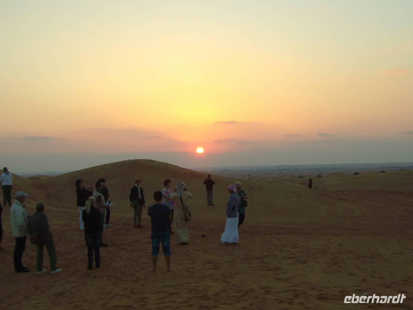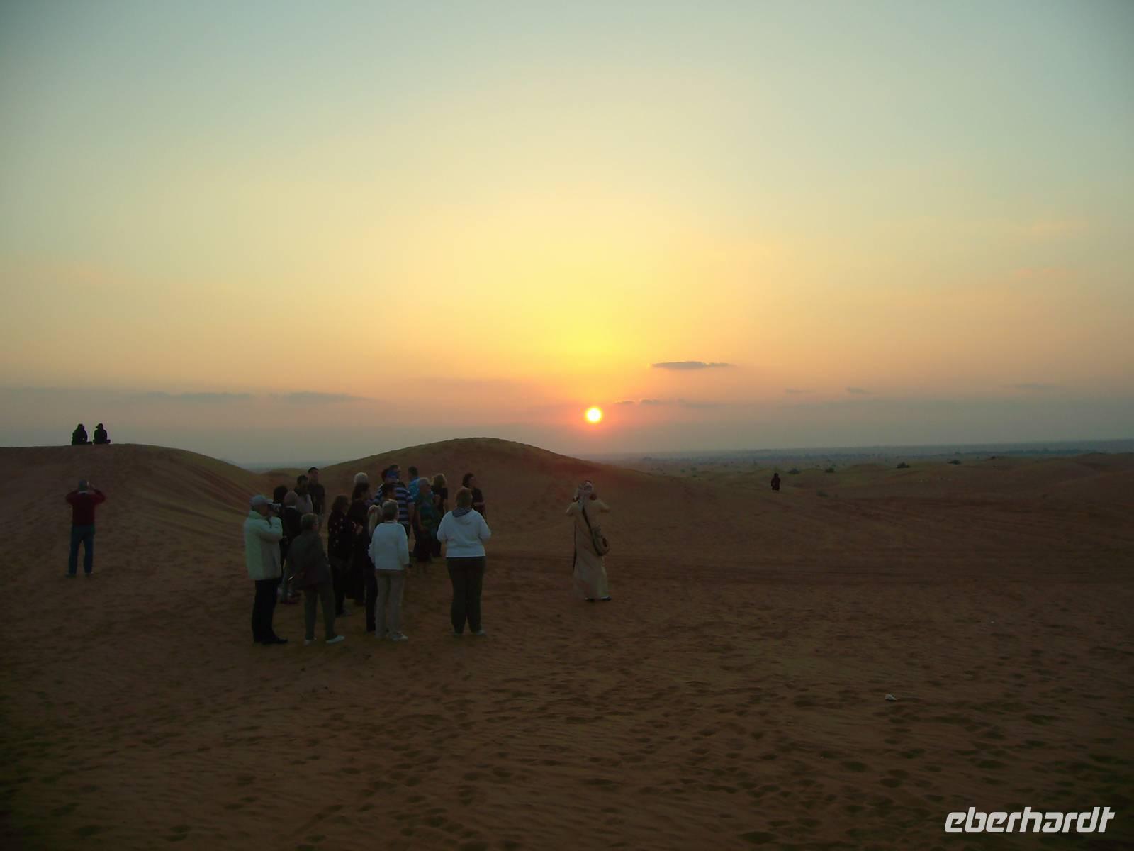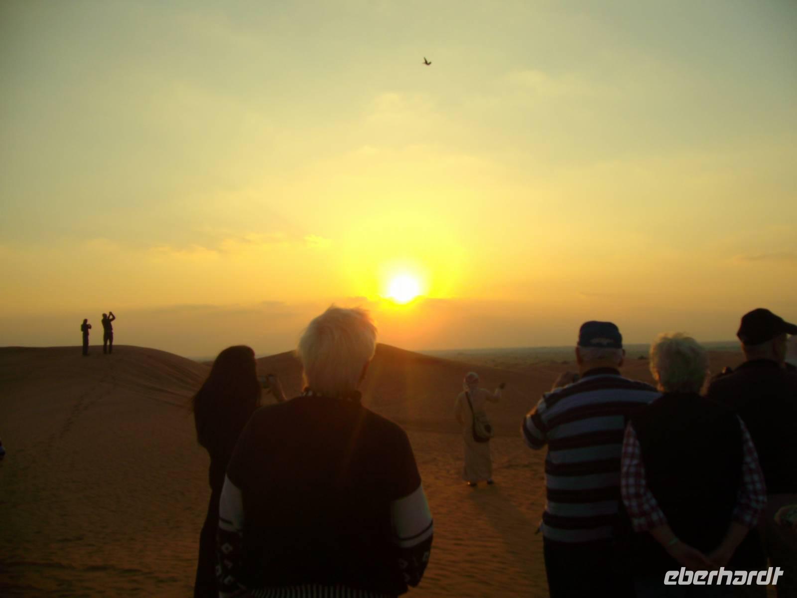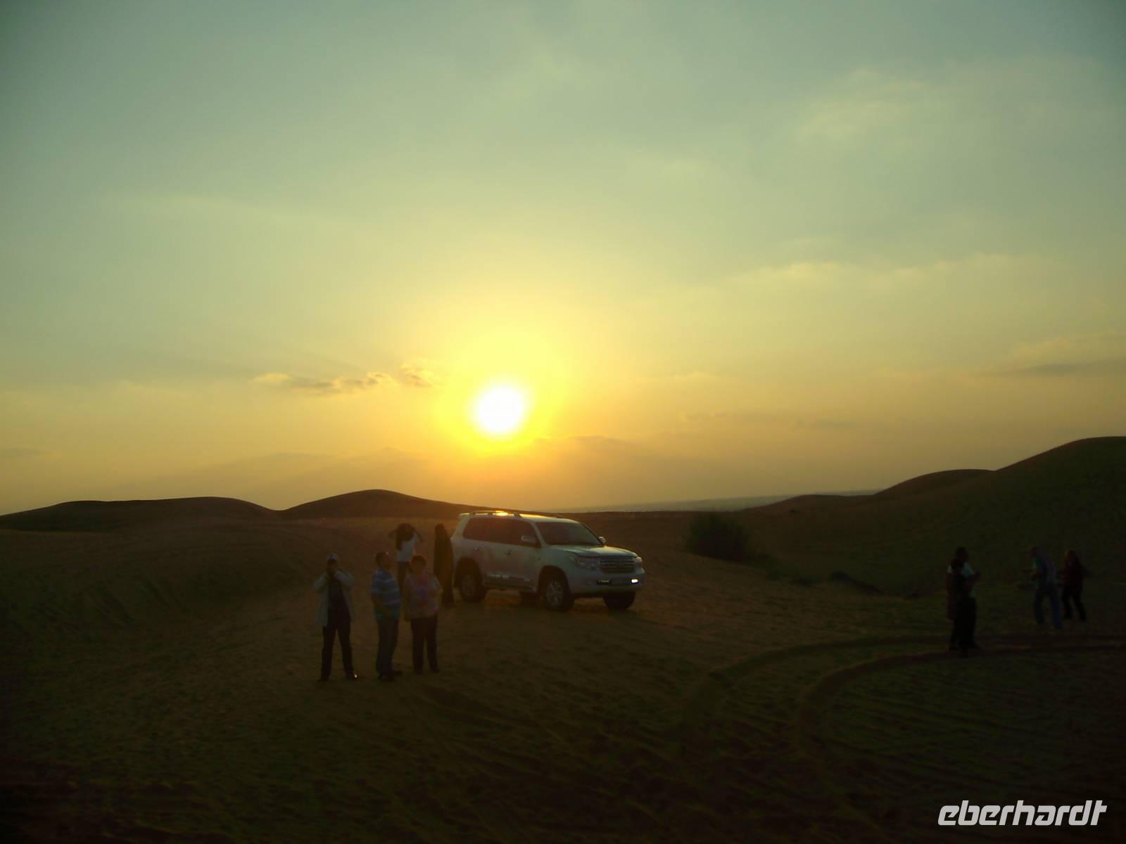 Gestartet wurde am frühen Nachmittag, wo wir von Jeeps am Hotel abgeholt wurden und dann ging von hier aus etwa 45 Minuten auf der Autobahn, bis unsere Jeeps in Richtung Wüste abzweigten und kurz am Sammelpunkt verharrten. Da immer mehrere Jeeps eines jeden Veranstalters gleichzeitig unterwegs sind, sammeln sich hier erst einmal alle vor der eigentlichen Wüstentour. Der Reifendruck wird auf ein Minimum abgelassen, um ein stecken bleiben des Fahrzeugs im Sand zu vermeiden ... und dann ging es los...! Der Wüstenspaß dauerte gute 30 Minuten - es machte einen Heidenspaß, doch mehrere Stunden bräuchte so mancher solch eine Fahrweise allerdings nicht wirklich! Die Jeep-Fahrer fuhren immerhin mit bis zu 50km/h über den Kamm einer Düne, das hört sich zwar nicht viel an, ist aber in der Situation wirklich nicht ganz ohne! Als wir längst nicht mehr wussten, wo wir überhaupt waren, endete die Fahrt plötzlich auf einer Schnellstraße ... Kurzes Aufatmen und wieder ging es hinein in die Sanddünen, erneut stand ein kurzes Offroad-Stück bis zu einem Wüstencamp an. Hier fand heute eine Art BBQ mit Bauchtanz, Shisha, Henna und all dem typisch orientalischen Zeugs statt. Kurz nach 21 Uhr war das Wüsten-Abenteuer beendet und ein erlebnisreicher Tag ging zu Ende! Allein schon der Sonnenuntergang in der Wüste ist einmalig - einfach grandios...!