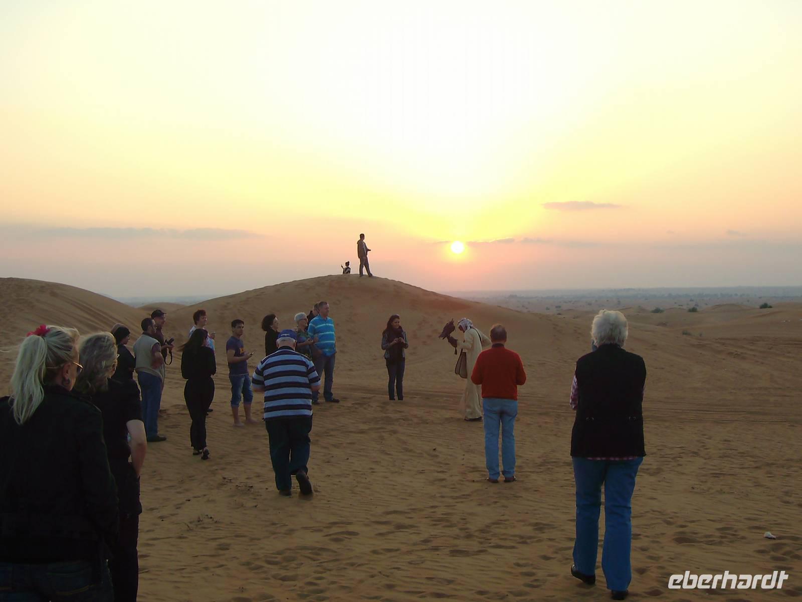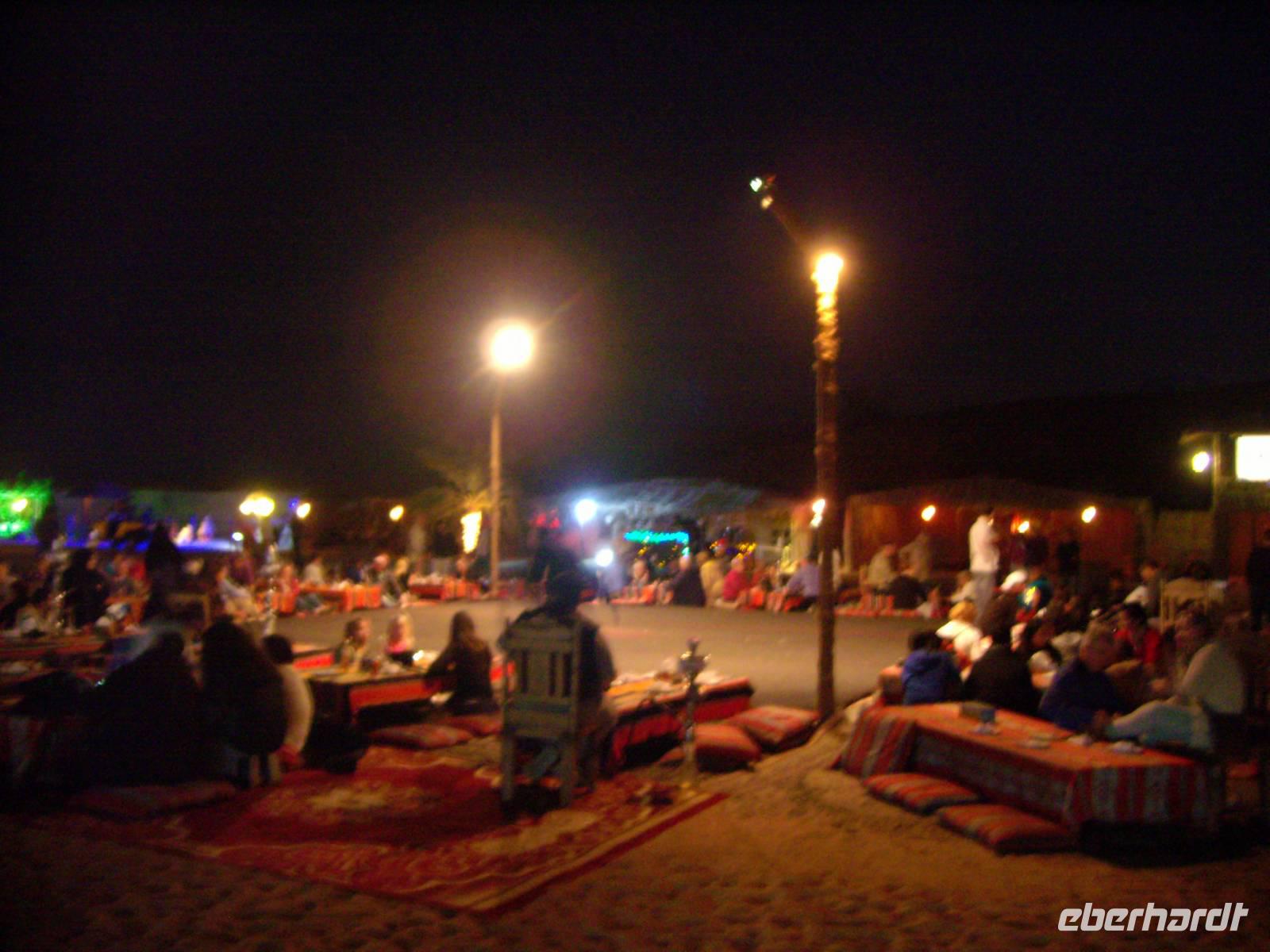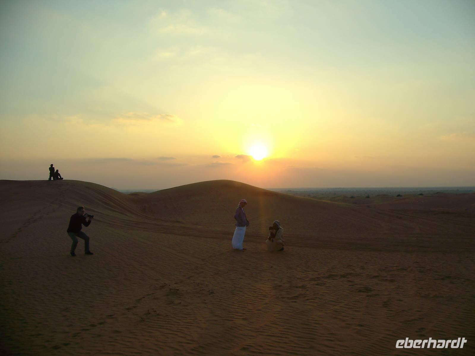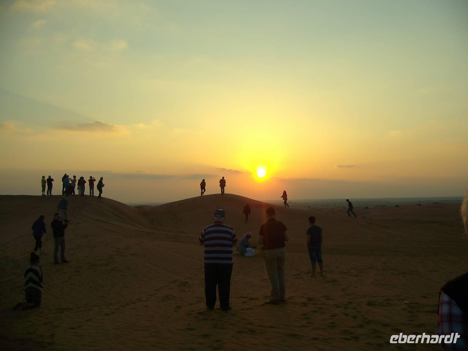 Gestartet wurde am frühen Nachmittag, wo wir von Jeeps am Hotel abgeholt wurden und dann ging von hier aus etwa 45 Minuten auf der Autobahn, bis unsere Jeeps in Richtung Wüste abzweigten und kurz am Sammelpunkt verharrten. Da immer mehrere Jeeps eines jeden Veranstalters gleichzeitig unterwegs sind, sammeln sich hier erst einmal alle vor der eigentlichen Wüstentour. Der Reifendruck wird auf ein Minimum abgelassen, um ein stecken bleiben des Fahrzeugs im Sand zu vermeiden ... und dann ging es los...! Der Wüstenspaß dauerte gute 30 Minuten - es machte einen Heidenspaß, doch mehrere Stunden bräuchte so mancher solch eine Fahrweise allerdings nicht wirklich! Die Jeep-Fahrer fuhren immerhin mit bis zu 50km/h über den Kamm einer Düne, das hört sich zwar nicht viel an, ist aber in der Situation wirklich nicht ganz ohne! Als wir längst nicht mehr wussten, wo wir überhaupt waren, endete die Fahrt plötzlich auf einer Schnellstraße ... Kurzes Aufatmen und wieder ging es hinein in die Sanddünen, erneut stand ein kurzes Offroad-Stück bis zu einem Wüstencamp an. Hier fand heute eine Art BBQ mit Bauchtanz, Shisha, Henna und all dem typisch orientalischen Zeugs statt. Kurz nach 21 Uhr war das Wüsten-Abenteuer beendet und ein erlebnisreicher Tag ging zu Ende! Allein schon der Sonnenuntergang in der Wüste ist einmalig - einfach grandios...!