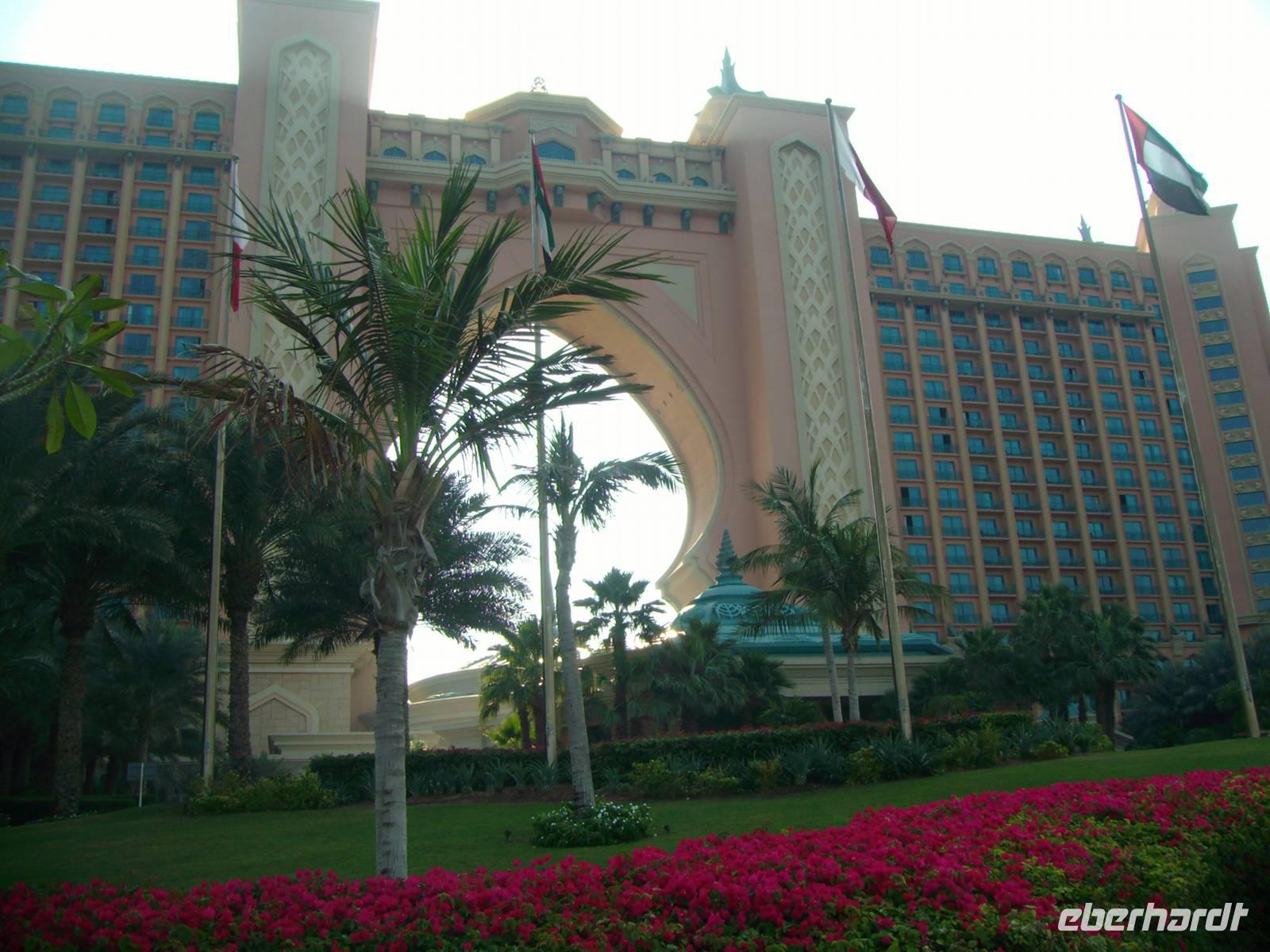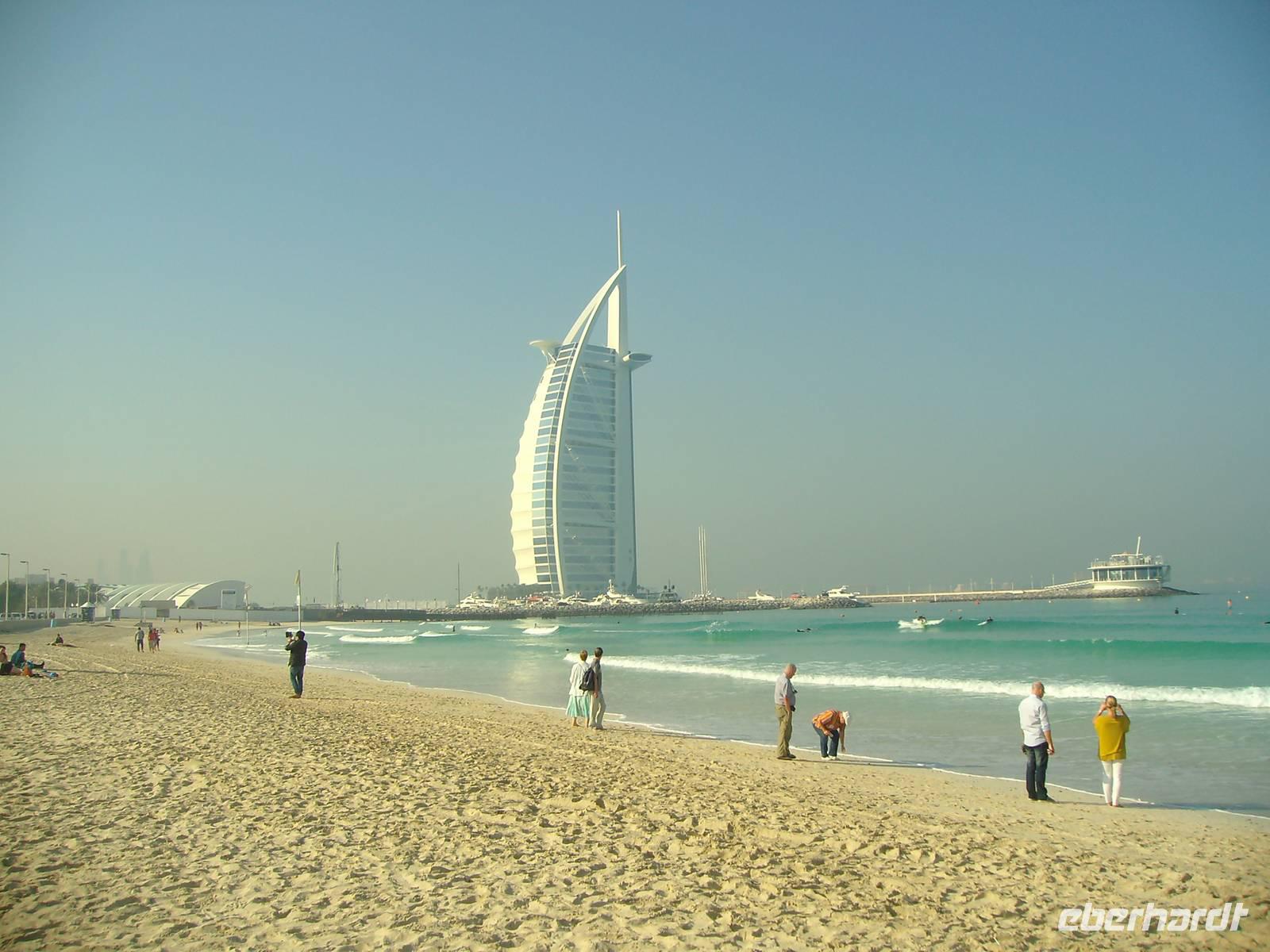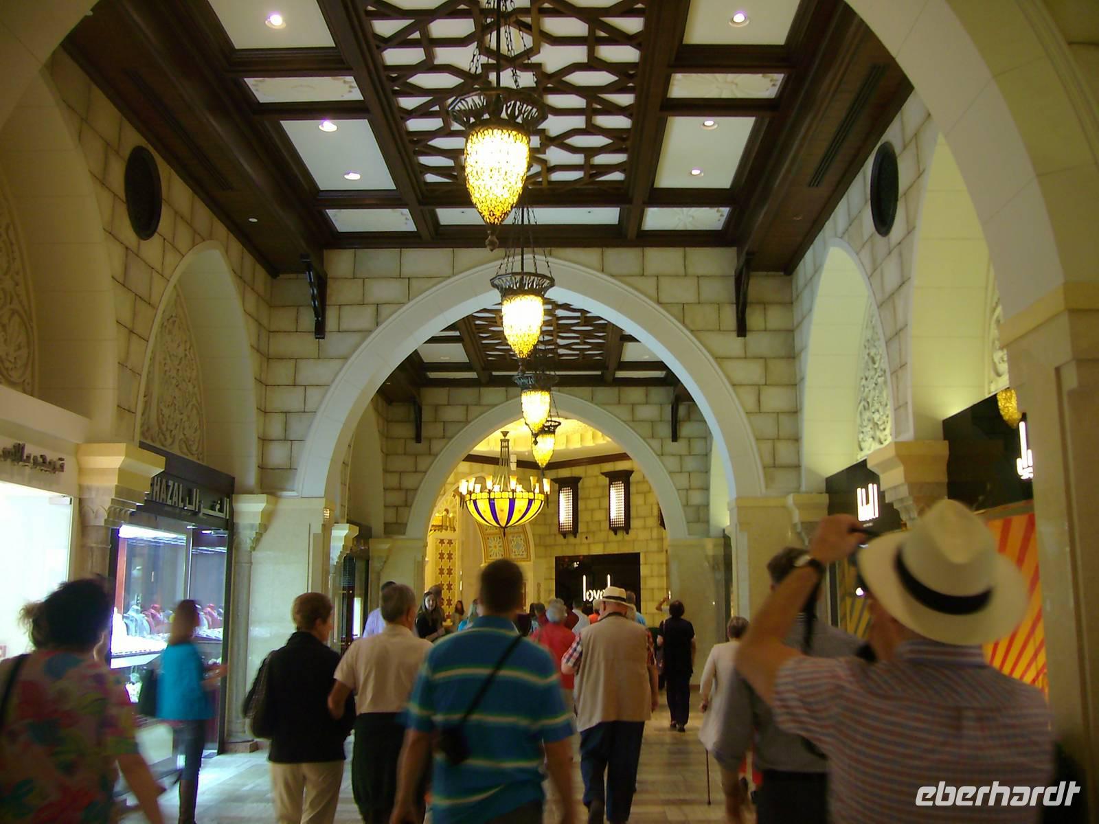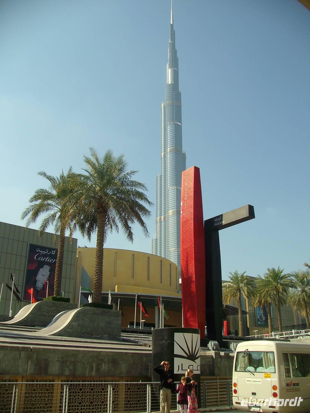 Heute erwartete uns eine Stadtrundfahrt durch das moderne Dubai. Vorbei an der Jumeirah Moschee gelangten wir zum berühmten Hotel "Burj al Arab", das mit seiner segelförmigen Silhouette ein Symbol des modernen Dubai ist. Ein Fotostopp am dortigen herrlichen Sandstrand und wenig später erreichten wir bereits die Palmeninsel - sogar im Weltraum soll sie zu erkennen sein! The Palm Jumeirah - das ist den Visionen von Scheich Mohammed Bin Rashid Al Maktoum zu verdanken, der die Idee hatte, die künstliche Palmeninsel vor Jumeirah in Dubai in ihrer beeindruckenden Form anlegen zu lassen. Ganze sieben Jahre (2001-2008) dauerte das 1,5 Milliarden US-Dollar teure Bauprojekt an, das heute zu den Highlights in Dubai gehört. Warum nicht direkt im Wasser, an der Küste, dachten sich die Investoren. Gesagt, getan. The Palm Jumeirah, die künstliche Palmeninsel, erstreckt sich über eine Fläche von 560 Hektar. Die Insel wurde in Form einer Palme angelegt, den Stamm, der eine Länge von 4 km aufweist, 17 Palmwedel und einen Halbmond. Die künstliche Palmeninsel bietet alles für einen anspruchsvollen Urlaub: Luxushotels, Villen, Appartements, Shoppingzentren, Freizeiteinrichtungen, Spa´s und Wellness-Center sowie Restaurants und Nachtclubs - man kommt aus dem Staunen einfach nicht mehr heraus! Zu den Highlights der künstlichen Palmeninsel zählt der renommierte Hotelkomplex "Atlantis The Palm", welcher direkt auf dem Sichelmond thront - auch hier legten wir übrigens einen Fotostopp ein. Entlang der Dubai Marina, einer neu entstandenen Wohngegend, begaben wir uns weiter zur Mall of the Emirates. Die Mall of the Emirates ist ganz einfach gigantisch und einfach ein Knüller! Man findet hier den Cinestar-Kinokomplex, ein riesiges Spielautomaten- und Vergnügungszentrum mit Bowlingbahnen, und natürlich unzählige Geschäfte. Des Weiteren wartet hier eine absolute Attraktion auf - "Ski Dubai", wo man als Besucher zwischen Skifahren, Snowboarden, Rutschen oder Schneeballschlachten im Snow Park wählen kann - einfach unglaublich, aber dennoch wahr! Das nächste Einkaufszentrum der Superlative erwartete uns nun - die Dubai Mall, welche alles bietet, was das Shopping-Herz begehrt. Auch wenn man nicht einkaufen will, gibt es reichlich zu bestaunen. Es ist schon gigantisch, was es dort alles zu finden, zu sehen und zu bestaunen gibt: einen großen Wasserfall, Wasserspiele und eine Eislaufbahn, um nur drei Sachen zu nennen.