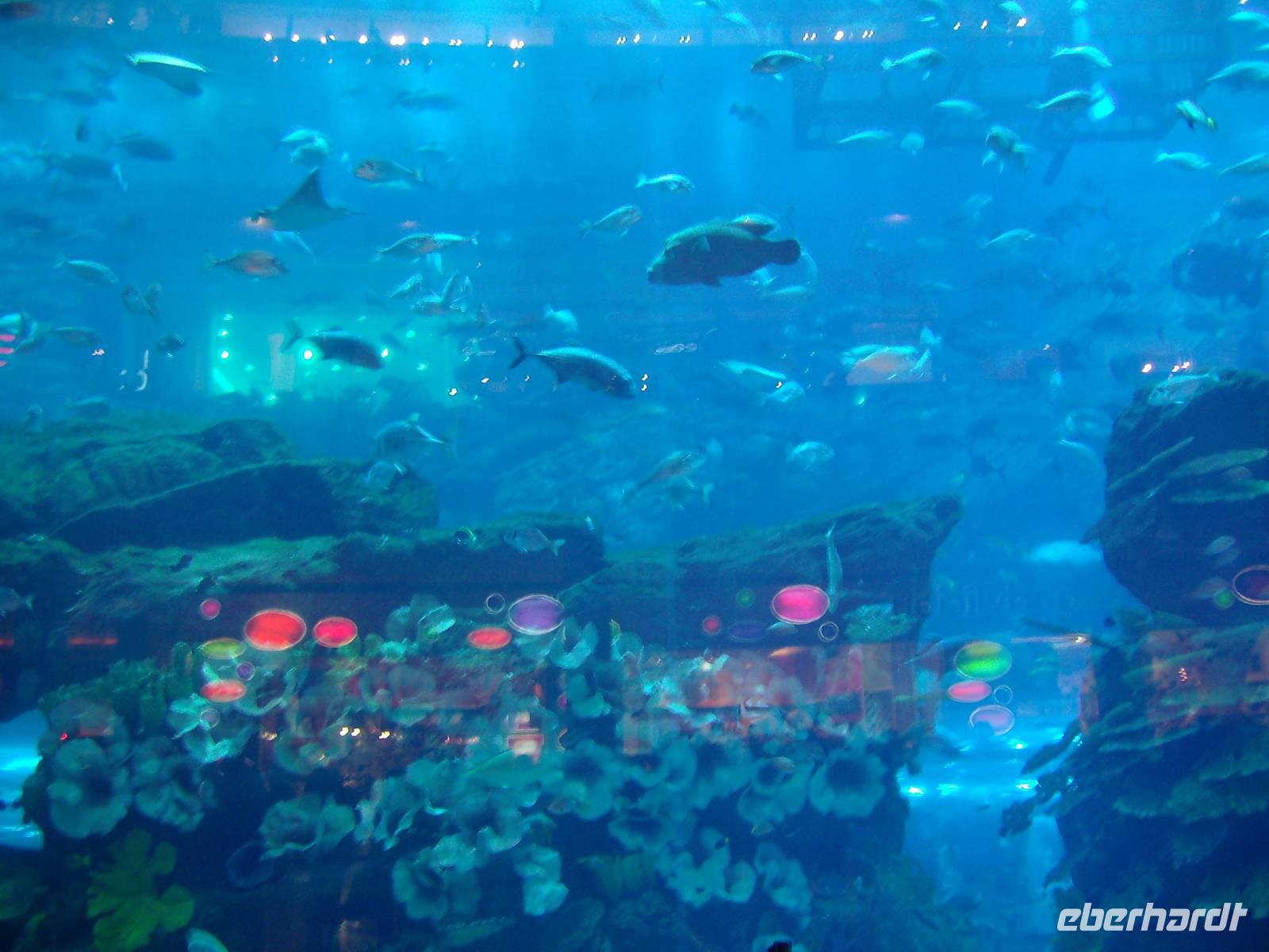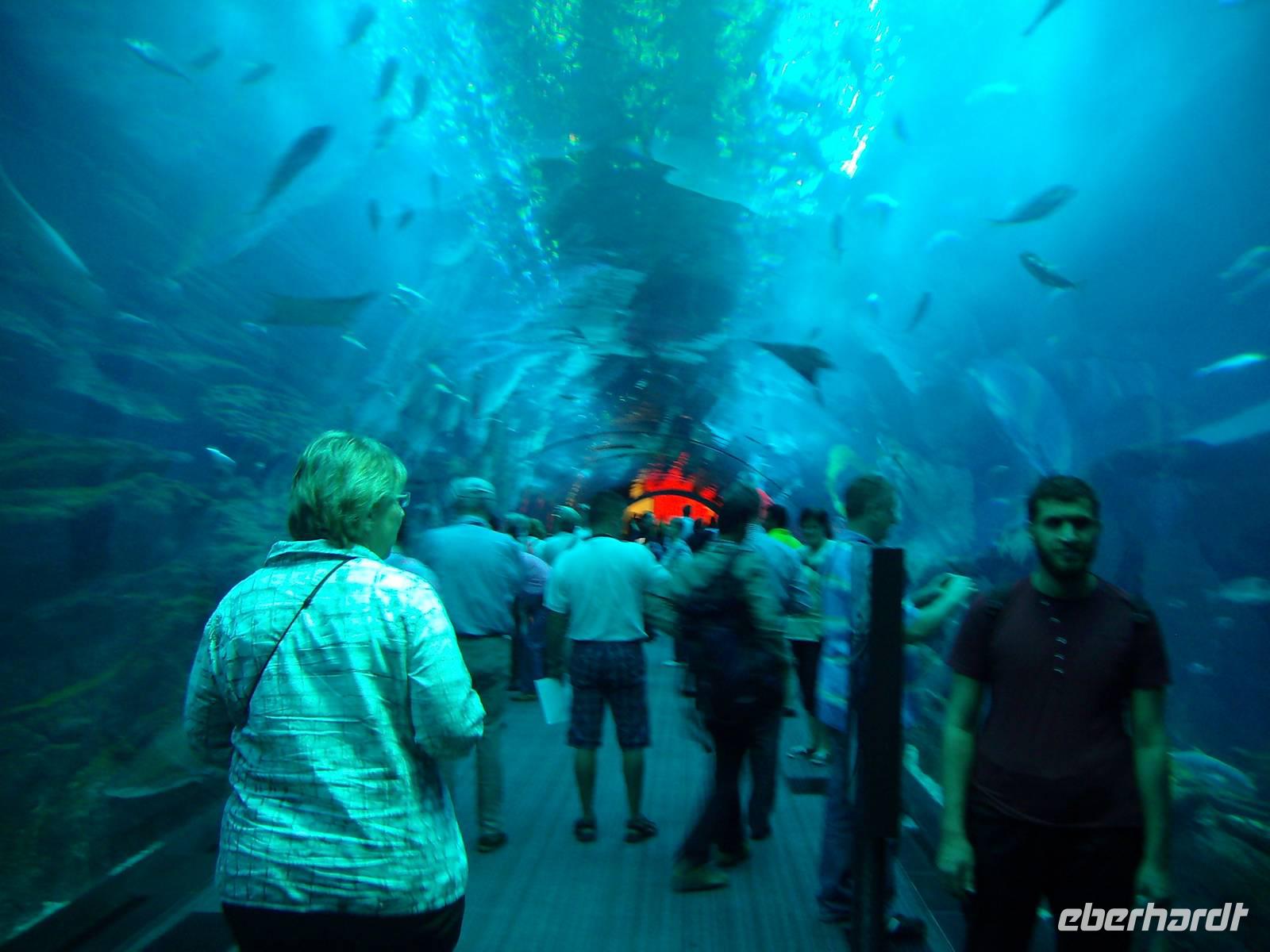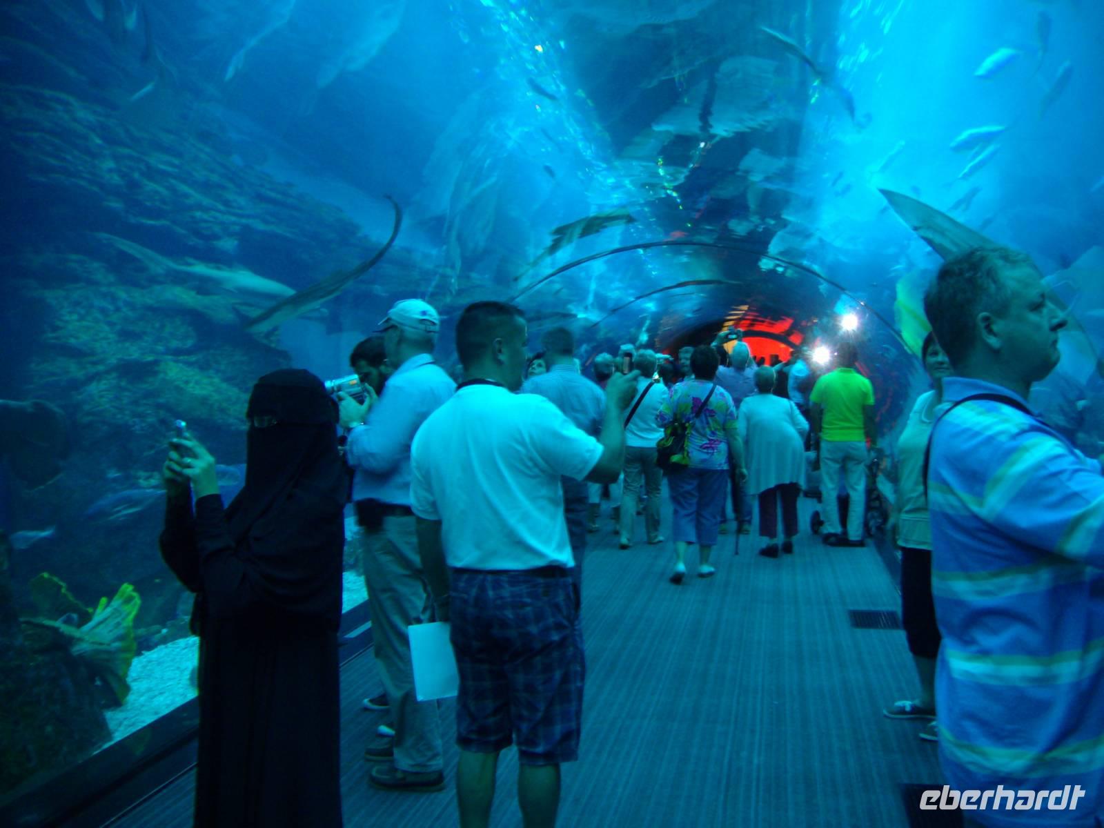 Die Dubai Mall war auch unserer Ausgangspunkt für die Fahrt auf den Burj Khalifa, dem höchsten Gebäude der Welt. Er ist 828 Meter hoch und wurde im Januar 2010 eröffnet. Wir genossen die Auffahrt zur Aussichtsplattform im 124. Stockwerk, die wir mit einem der schnellsten Aufzüge der Welt erreichten. Der Blick von oben ist atemberaubend! Nach diesem Test auf Höhentauglichkeit (alle haben bestanden!) erlebten wir am Mittag die große Wassershow zu Füßen des Burj Khalifa, die zu wechselnden Musikklängen gezeigt wird. Zum Abschluss hatten wir nun noch die Unterwasserwelt in der Dubai Mall direkt vor Augen - wir besuchten abschließend das "Aquarium und den Unterwasserzoo". Das Aquarium ist weltweit eines der größten seiner Art und wird im Guinness Buch der Rekorde mit seiner 'Größten Acrylplatte der Welt' angeführt. Hier findet man 33.000 Wassertiere mit mehr als 220 Tiergattungen, darunter auch Haie und Rochen. Der gläserne Durchgangstunnel ermöglicht eine unglaublich nahe Begegnung mit der faszinierenden Unterwassertierwelt! Jetzt wurde es so langsam Zeit, die AIDAdiva erwartete uns am Nachmittag und somit fuhren wir von der Dubai Mall direkt zum Hafen Port Rashid, wo die AIDAdiva bereits vor Anker lag. Wir checkten ein und genossen den Rest des Tages bereits an Bord! Besonders sehenswert war die abendliche Laser-Show an Bord, die uns auf die kommenden Tage im Orient einstimmen sollte!