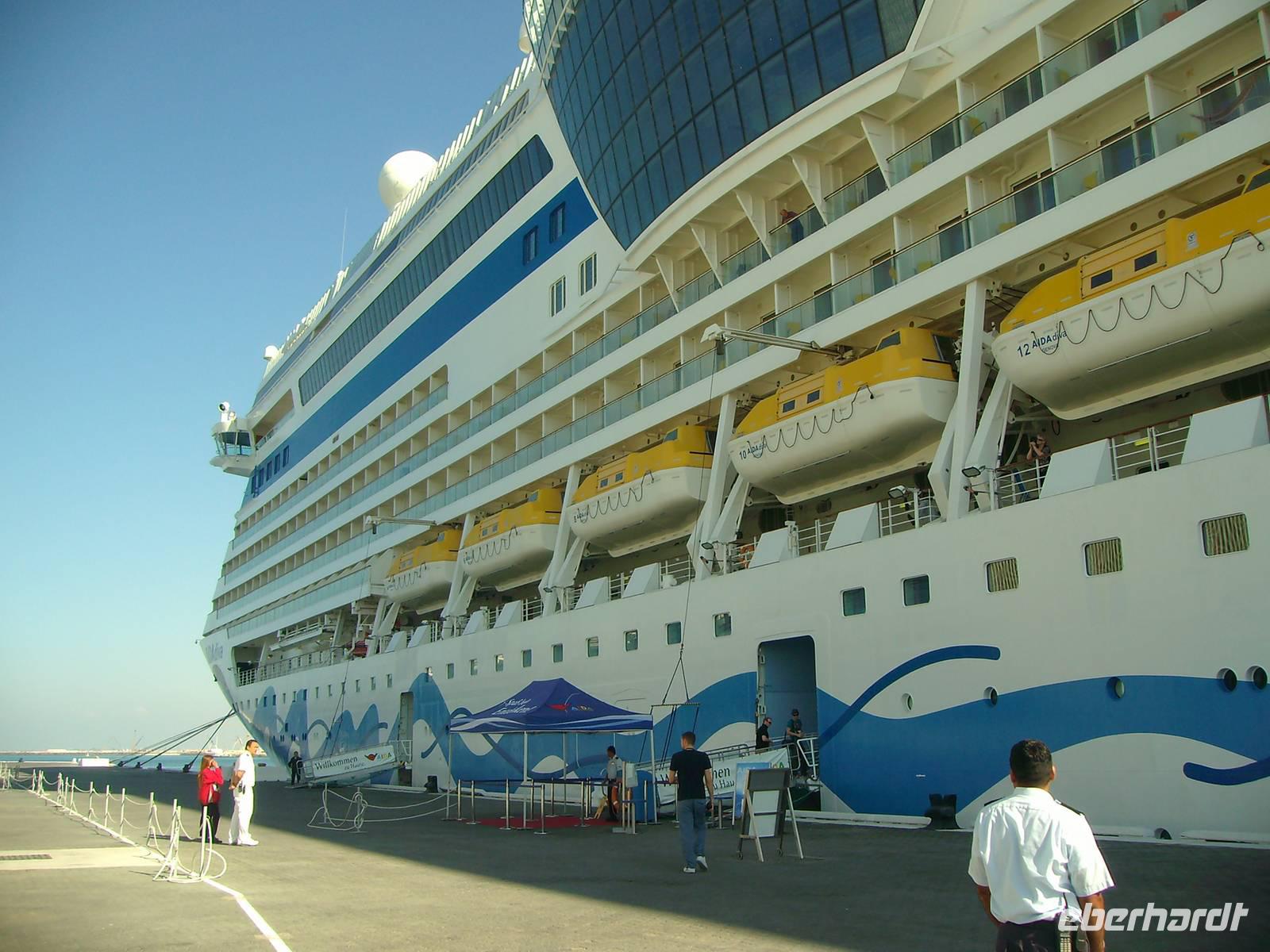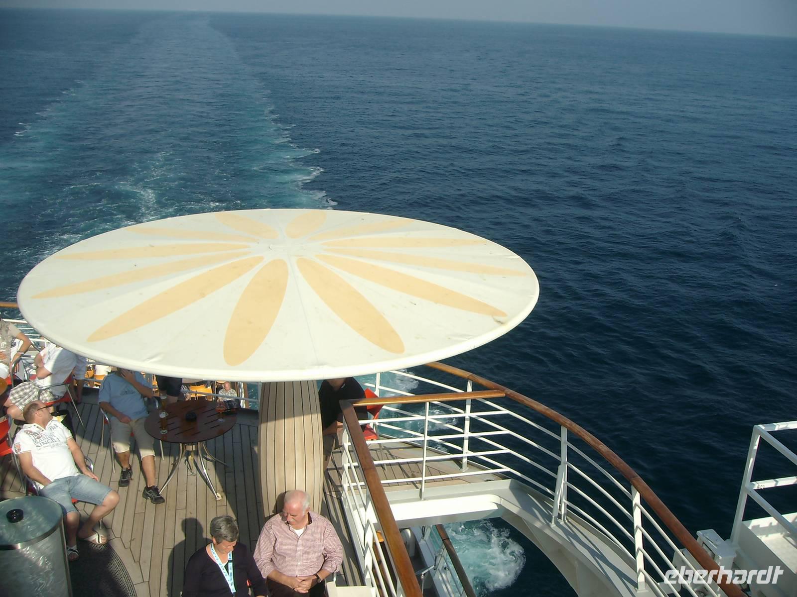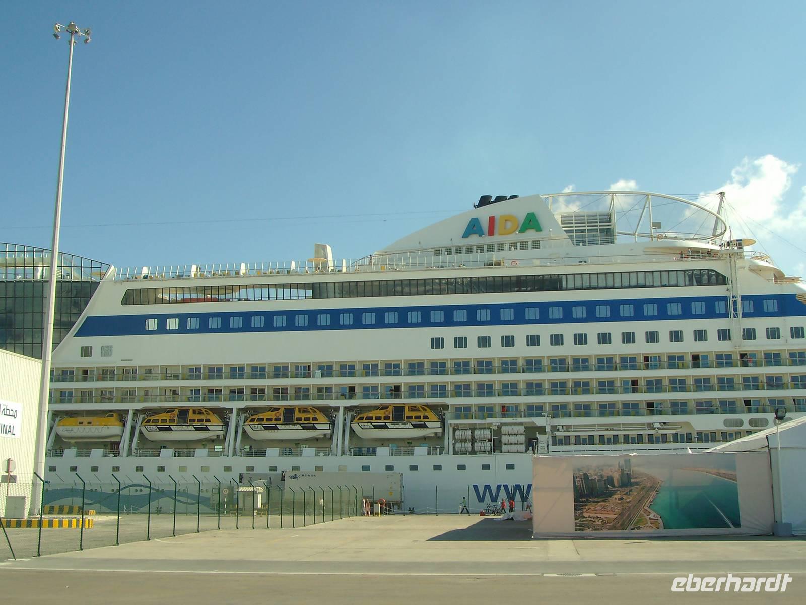 Bevor die AIDAdiva den Hafen von Dubai verlassen konnte, mussten wir an der obligatorischen Seenot-Rettungsübung teilnehmen, übrigens Pflichtprogramm für alle Passagiere! Mit Schwimmwesten ausgestattet, wurden wir mit den Sicherheitsbestimmungen an Bord vertraut gemacht. 11 Uhr hieß es dann endlich - Leinen los, denn bis in den Oman lagen reichlich 600 Kilometer vor uns! In diesem Zusammenhang wurden alle Gäste unserer Gruppe zu einem Eberhardt-Sektempfang in der AIDA-Lounge eingeladen und gemeinsam wurde auf die bevorstehenden 7 Tage angestoßen! Anschließend nahmen wir an einem eigens für uns organisierten Schiffsrundgang teil, wo wir uns mit den Annehmlichkeiten an Bord vertraut machen konnten. Nun hatte man die Qual der Wahl, denn jetzt konnte jeder ganz individuell den heutigen Tag auf See gestalten! Die AIDAdiva bietet hierzu vielfältige Möglichkeiten zur Freizeitgestaltung an - u. a. das Pool-Deck (bei 25 Grad Außentemperatur sehr angenehm!), den Wellness-Bereich, eine Bibliothek, zahlreiche Bars, diverse Vorträge und abendliche Shows! Nicht zuletzt wurden wir den ganzen Tag in den verschiedenen Restaurants mit schmackhaften Speisen verwöhnt - absolut lecker!