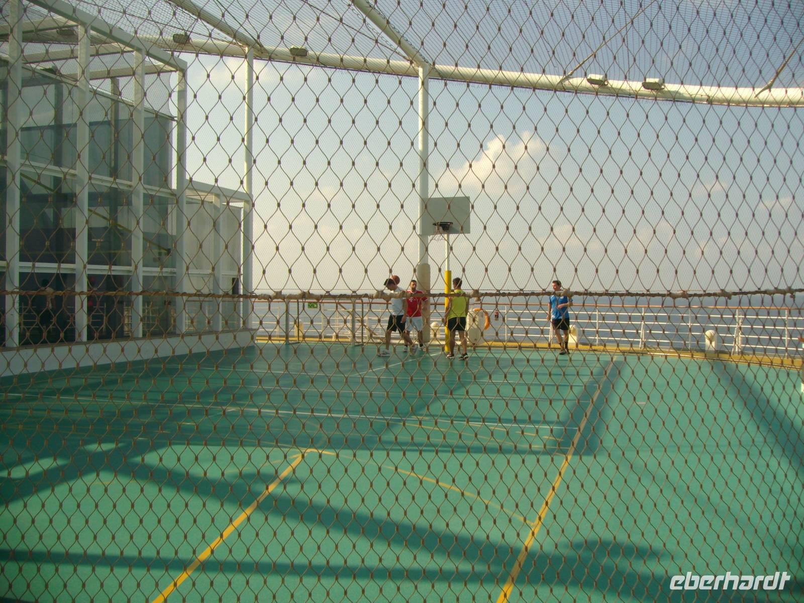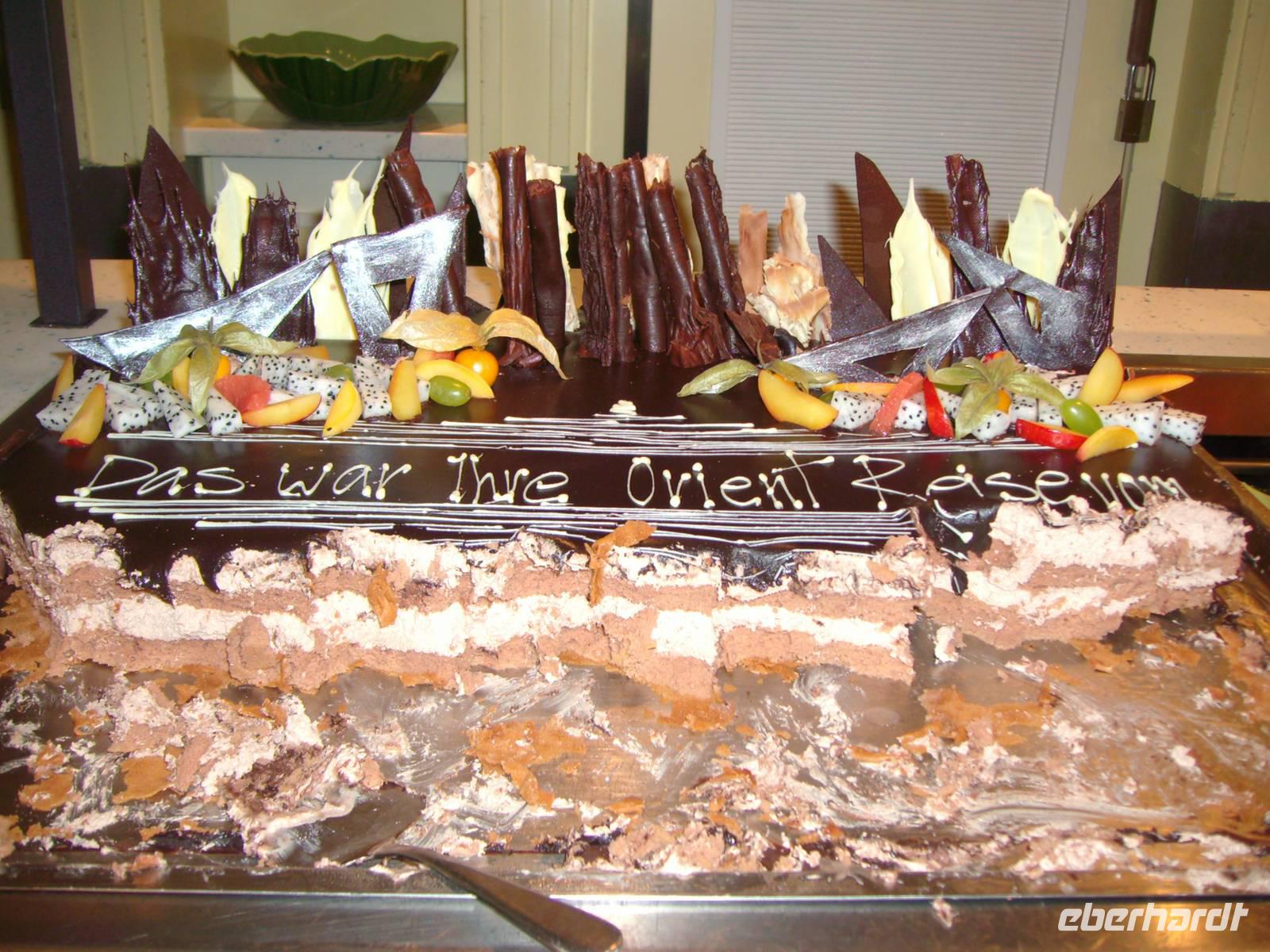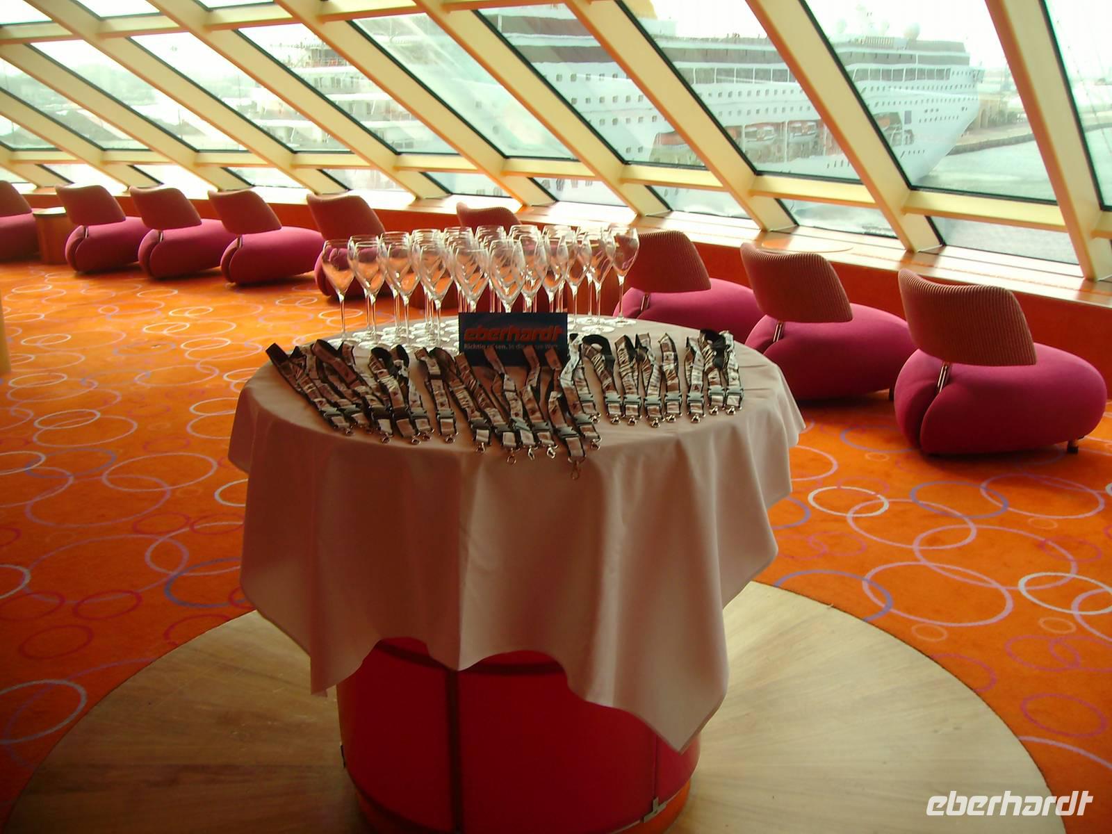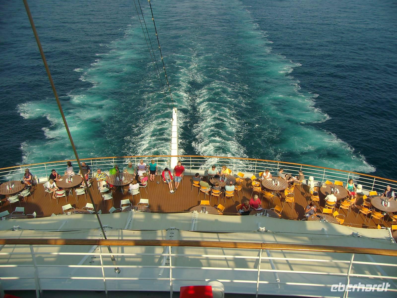Bevor die AIDAdiva den Hafen von Dubai verlassen konnte, mussten wir an der obligatorischen Seenot-Rettungsübung teilnehmen, übrigens Pflichtprogramm für alle Passagiere! Mit Schwimmwesten ausgestattet, wurden wir mit den Sicherheitsbestimmungen an Bord vertraut gemacht. 11 Uhr hieß es dann endlich - Leinen los, denn bis in den Oman lagen reichlich 600 Kilometer vor uns! In diesem Zusammenhang wurden alle Gäste unserer Gruppe zu einem Eberhardt-Sektempfang in der AIDA-Lounge eingeladen und gemeinsam wurde auf die bevorstehenden 7 Tage angestoßen! Anschließend nahmen wir an einem eigens für uns organisierten Schiffsrundgang teil, wo wir uns mit den Annehmlichkeiten an Bord vertraut machen konnten. Nun hatte man die Qual der Wahl, denn jetzt konnte jeder ganz individuell den heutigen Tag auf See gestalten! Die AIDAdiva bietet hierzu vielfältige Möglichkeiten zur Freizeitgestaltung an - u. a. das Pool-Deck (bei 25 Grad Außentemperatur sehr angenehm!), den Wellness-Bereich, eine Bibliothek, zahlreiche Bars, diverse Vorträge und abendliche Shows! Nicht zuletzt wurden wir den ganzen Tag in den verschiedenen Restaurants mit schmackhaften Speisen verwöhnt - absolut lecker!