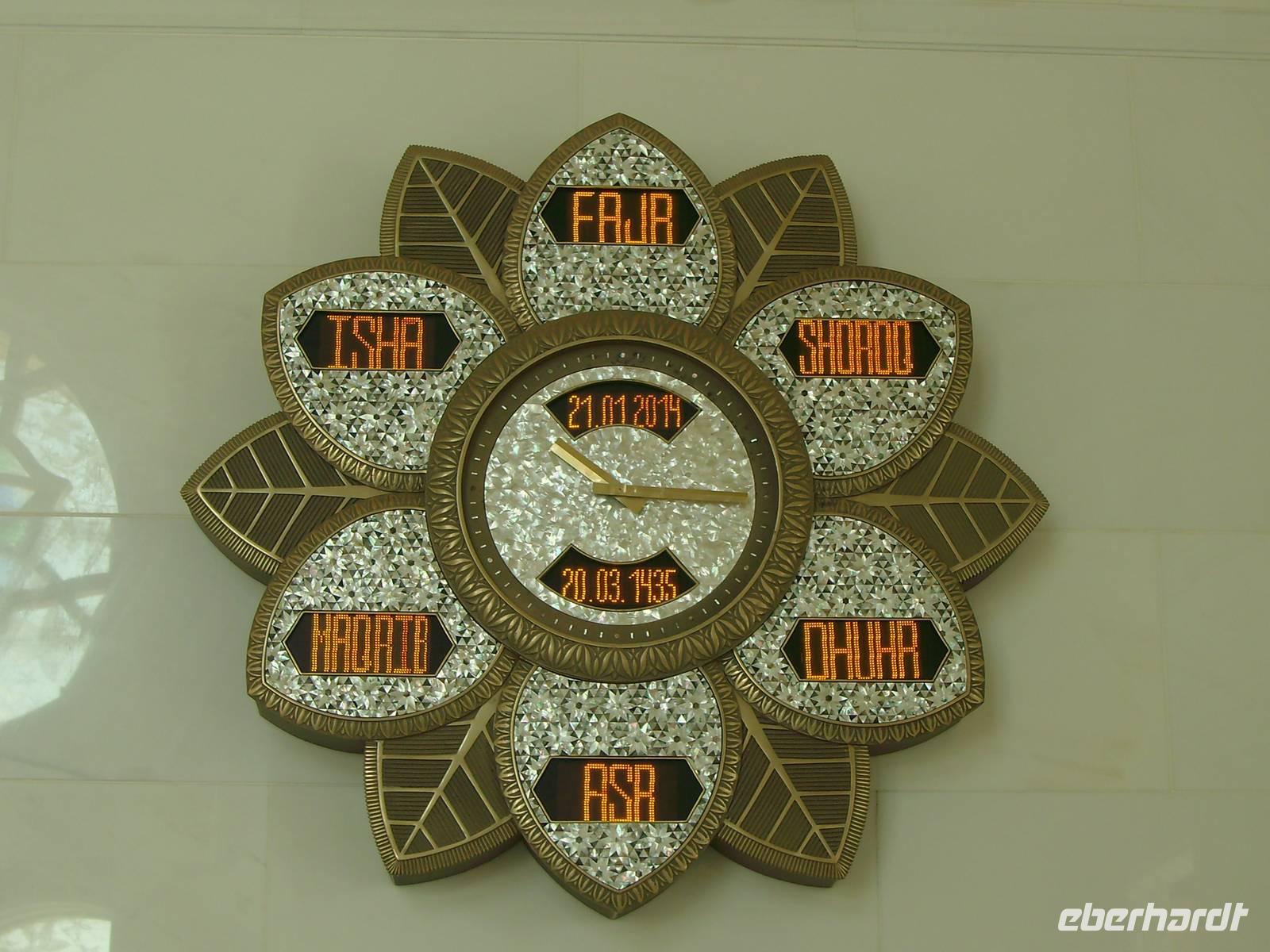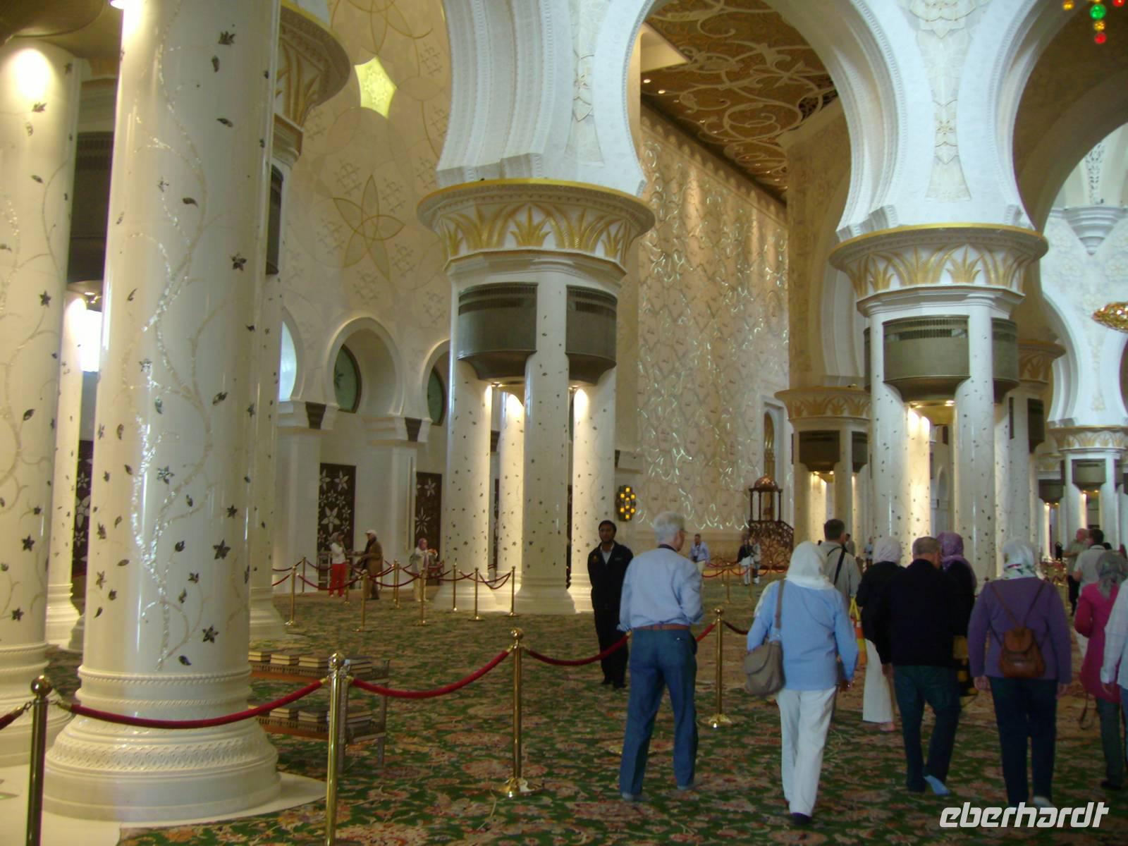 Die meisten unserer Gäste nahmen heute am AIDA-Ausflug "Mystisches Muscat" teil. Bereits am Morgen erreichten wir das Sultanat Oman bzw. den Hafen der Hauptstadt Muscat bei Sonnenschein pur und um die 25 Grad Wärme! Die Stadt liegt in einer geschützten Bucht an der vulkanisch geprägten Küste des Golfs von Oman. Ein halbtägiger Ausflug lag vor uns und zum Glück saßen auch alle Eberhardt-Gäste in einem Bus - so dass sich niemand allein fühlen musste! Sogar ein deutschsprachiger Reiseleiter namens Mahesch erwartete uns und somit konnte es los gehen ... Nach einer kurzweiligen Fahrt erlebten wir den Besuch eines der wichtigsten Sehenswürdigkeiten im Oman, der Sultan Qaboos Grand Mosque oder Große Sultan Qaboos Moschee. Die Hauptmoschee gehört zu den hervorragendsten Bauwerken und Baudenkmälern im Oman. Als Standort der im Jahre 2001 eingeweihten Moschee wurde ein Gebiet an der Hauptstraße zwischen Muscat und Seeb, die Al Qaboos Street, gewählt. Die Moschee besteht aus einer großen Hauptgebetshalle, einer kleineren Frauengebetshalle, fünf Minaretten, zwei großen Bogengängen, einem islamischen Informationszentrum und Institut sowie einer Bibliothek mit über 20.000 Büchern. Die Moschee bietet Platz für sage und schreibe bis zu 20.000 Gläubigen! Zurück in Muscat erlebten wir das bunte fremdländische Treiben im Muttrah-Souk, wo es überall nach Gewürzen und Weihrauch duftete! Bunte Stoffe, edelste Tücher und Gold- bzw. Silberschmuck in den Auslagen erfüllen hier jede Erwartung an einen orientalischen Basar! Nach einem kurzen Fotostopp mit Blick auf die portugiesischen Festungen Mirani und Jalali statteten wir dem im Jahre 1998 eröffneten Bait Al Zibair-Museum in Alt Muscat einen Besuch ab. Das private Museum zeigt omanische Kunst- und Alltagsgegenstände wie traditionelle Waffen, Juwelen, Kleidung, alte Haushaltsgegenstände und einige Exponate, die die omanische Land- und Stadtwelt darstellen. Anschließend noch eine kurze Stippvisite am Sultanspalast und schon ging es wieder in Richtung Hafen, wo wir den restlichen Nachmittag an Bord der AIDAdiva mit all ihren Annehmlichkeiten genießen konnten. Am Abend verließ unser Schiff den Hafen von Muscat, bis Abu Dhabi waren es nunmehr ca. 740 Kilometer auf See!