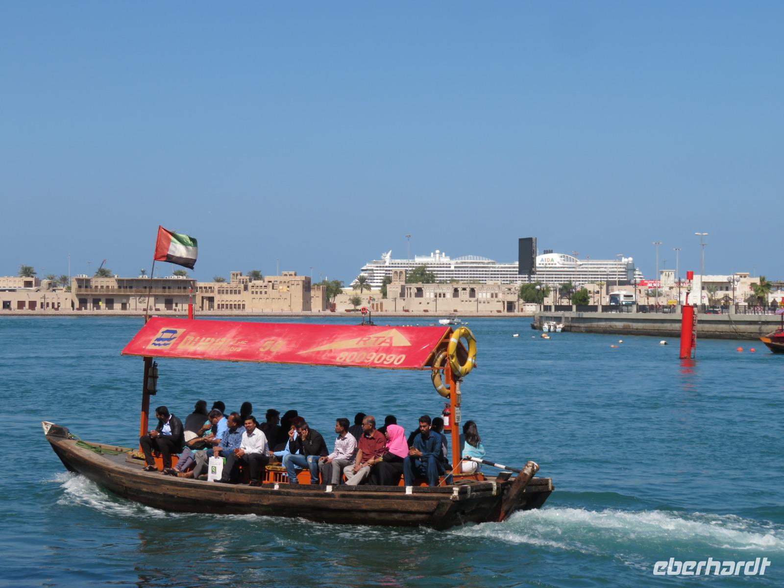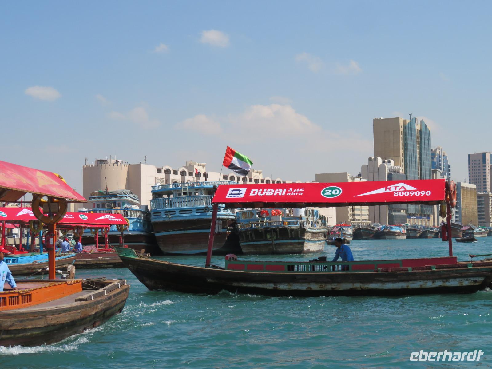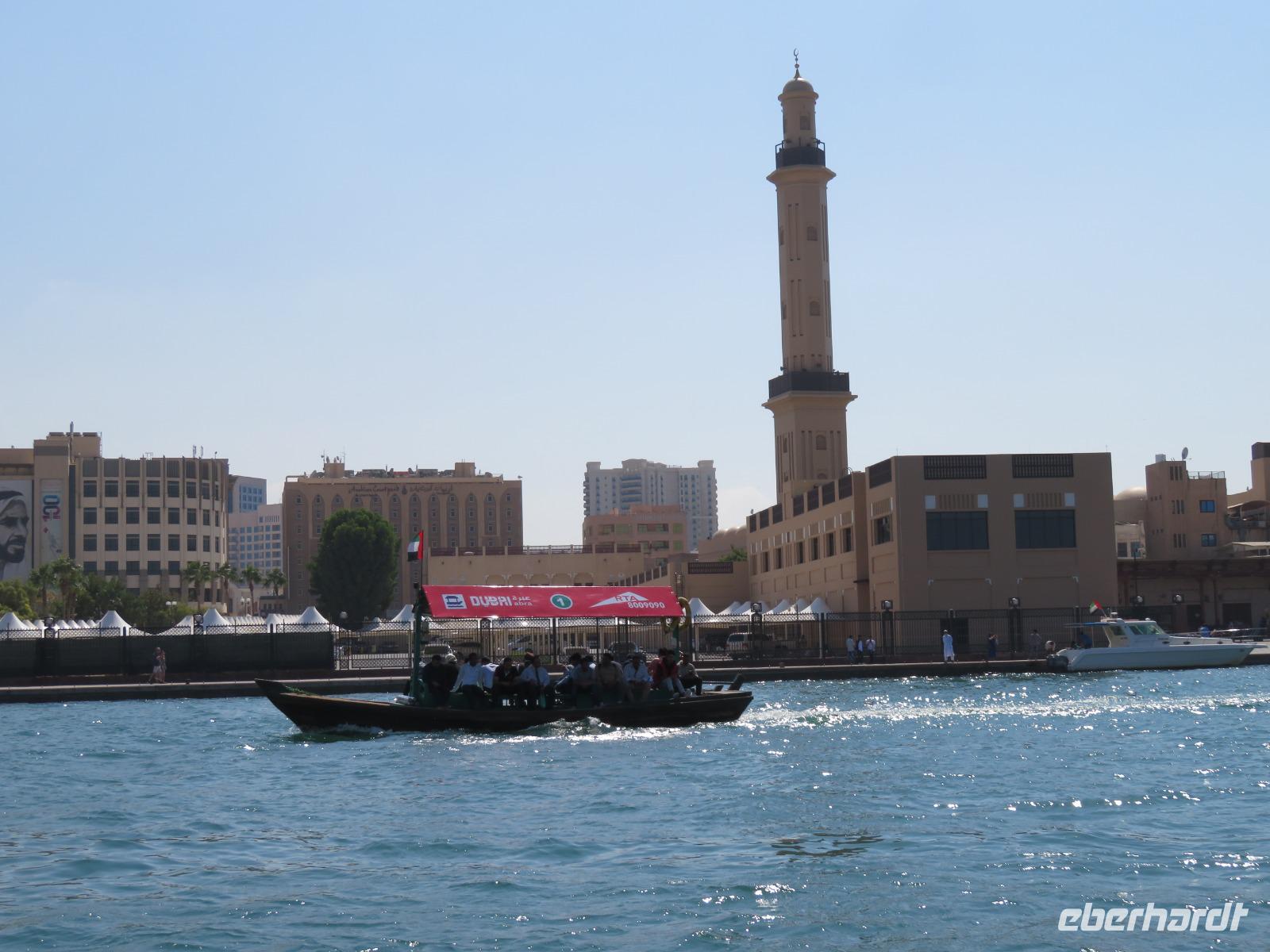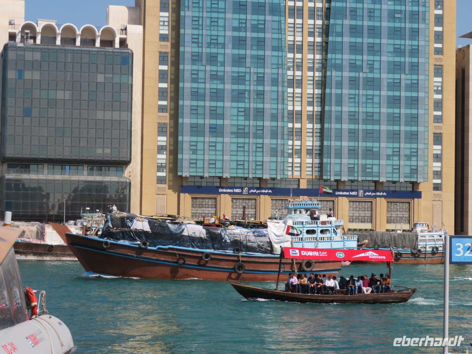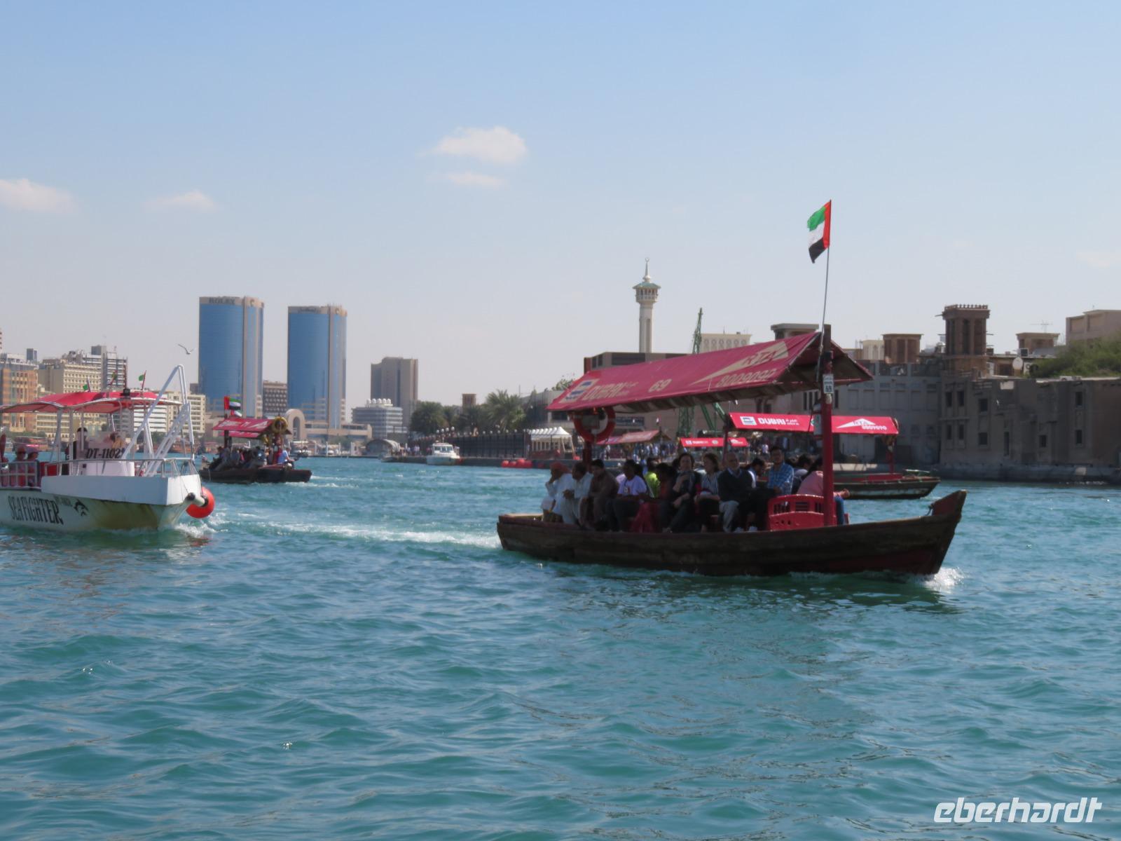 Nach einem gemütlichen Frühstück bummelten wir gemeinsam mit Anja in den historischen Stadtteil Al Fahidi. Um 1800 wurden hier wunderschöne Windturmhäuser von persischen Stoff- und Perlenhändlern erbaut, welche heute restauriert zu besichtigen sind. Hier wurden wir von einem einheimischen „abgefangen" der uns in seinem kleinen Büro zu einem orientalischen Kaffee einlud & uns alles wissenswerte über die bevorstehende „EXPO 2020" erzählte. Über den traditionellen Old-Souk, wo eine große Auswahl von Stoffen, Kleidern und Tüchern feilgeboten werden, erreichten wir den Dubai Creek, einem ca. 11 Kilometer langer Wasserarm, auf welchem immer geschäftiges Boots-Treiben herrscht und beide Stadthälften - das historische Bur Dubai und das eher moderne Deira - verbindet. Wir wollten von Bur Dubai nach Deira und nahmen uns hier eine Abra (Wassertaxi), ein hiesiges traditionelles Holzboot für maximal 20 Personen, zur wenige Minuten dauernden Überfahrt. Was für Venedig die Gondel, ist für Dubai die Abra!