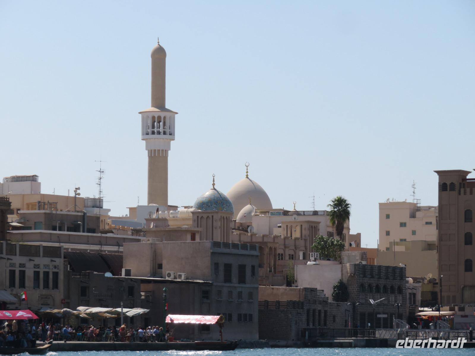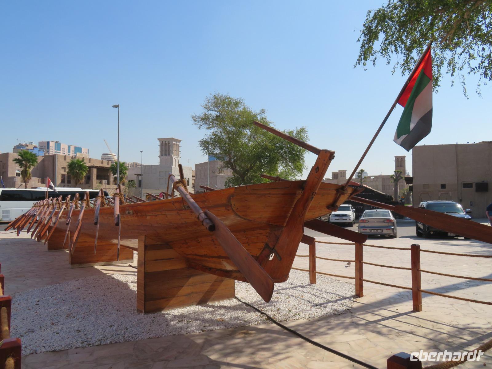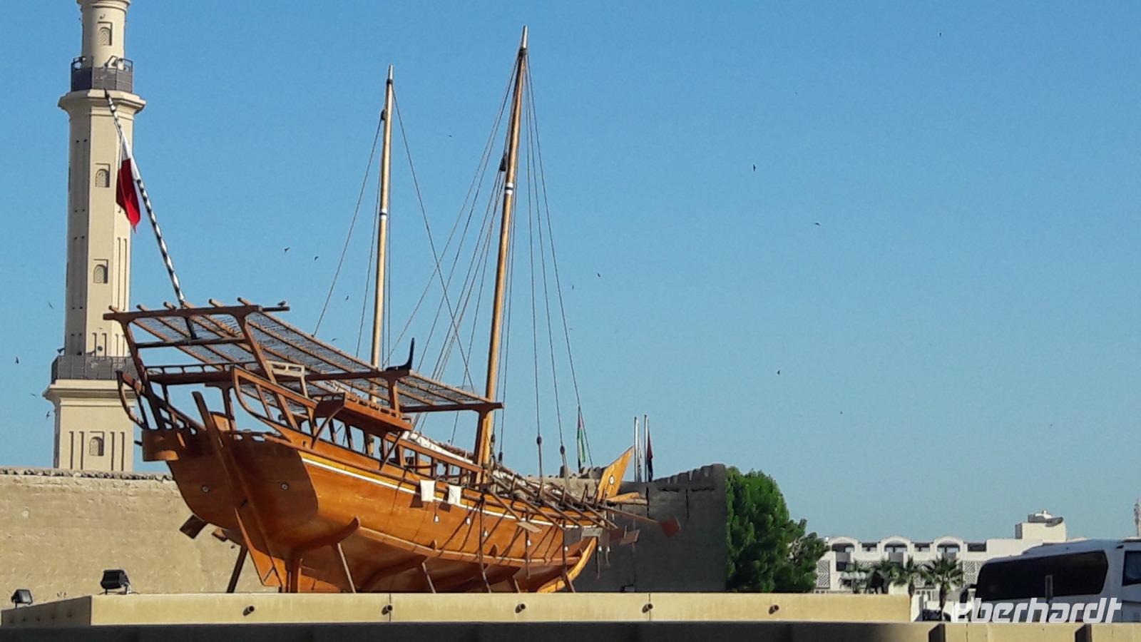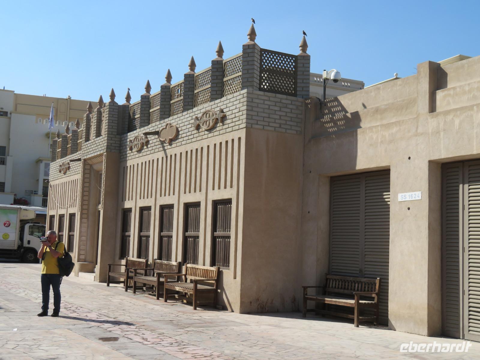 Nach einem gemütlichen Frühstück bummelten wir gemeinsam mit Anja in den historischen Stadtteil Al Fahidi. Um 1800 wurden hier wunderschöne Windturmhäuser von persischen Stoff- und Perlenhändlern erbaut, welche heute restauriert zu besichtigen sind. Hier wurden wir von einem einheimischen „abgefangen" der uns in seinem kleinen Büro zu einem orientalischen Kaffee einlud & uns alles wissenswerte über die bevorstehende „EXPO 2020" erzählte. Über den traditionellen Old-Souk, wo eine große Auswahl von Stoffen, Kleidern und Tüchern feilgeboten werden, erreichten wir den Dubai Creek, einem ca. 11 Kilometer langer Wasserarm, auf welchem immer geschäftiges Boots-Treiben herrscht und beide Stadthälften - das historische Bur Dubai und das eher moderne Deira - verbindet. Wir wollten von Bur Dubai nach Deira und nahmen uns hier eine Abra (Wassertaxi), ein hiesiges traditionelles Holzboot für maximal 20 Personen, zur wenige Minuten dauernden Überfahrt. Was für Venedig die Gondel, ist für Dubai die Abra!