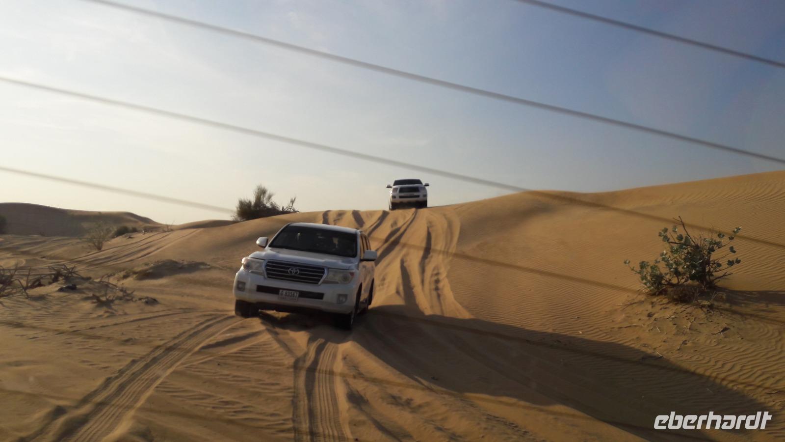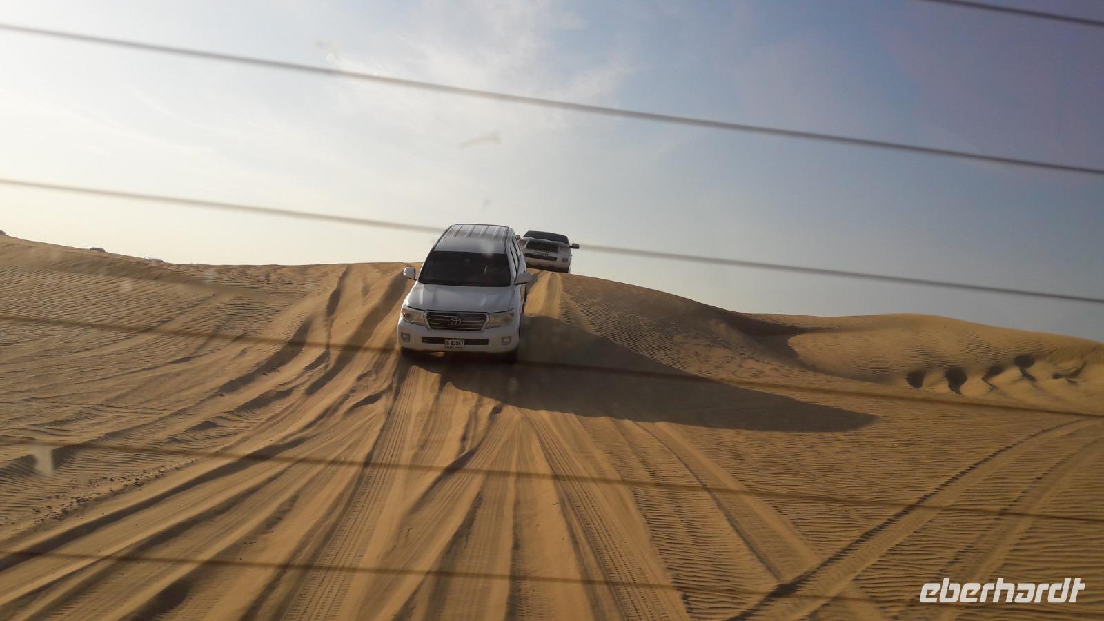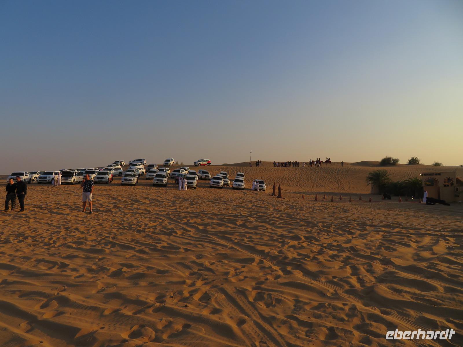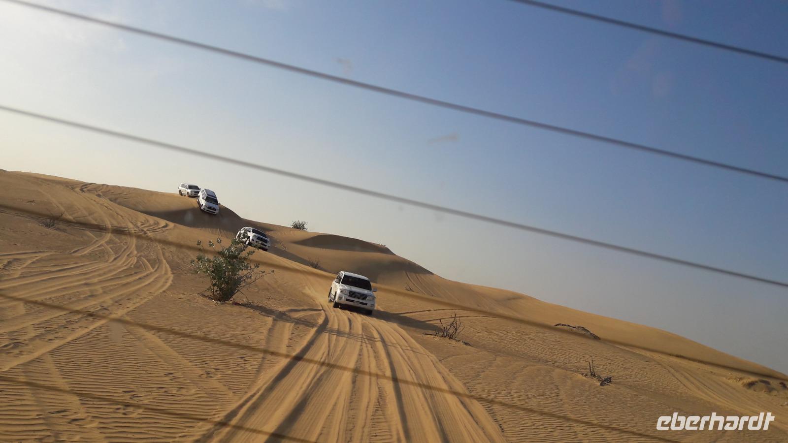 Am Nachmittag holten uns 5 Jeeps vom Hotel ab und nach ca. 45 Minuten Fahrt durch die Stadt standen wir, wortwörtlich, im Wüstensand. Der Reifendruck wird dann auf ein Minimum abgelassen, um ein stecken bleiben der Fahrzeuge im Sand zu vermeiden ... los ging die rasante Fahrt durch die Sanddünen! Dann erreichten wir das Wüstencamp unter freiem Himmel, leider ohne Sterne. Wir erlebten eine Falkner-Show, Henna-Lady's zauberten kleine Kunstwerke auf Hände & Arme, man konnte genüsslich eine Shisha rauchen und das Barbecue schmeckte in dieser Atmosphäre natürlich umso besser! Ein Darwish-Tänzer und eine naja weniger orientalische Bauchtänzerin rundeten den schönen ab. Mit den Jeeps ging es dann zurück nach Dubai und ins Hotel.