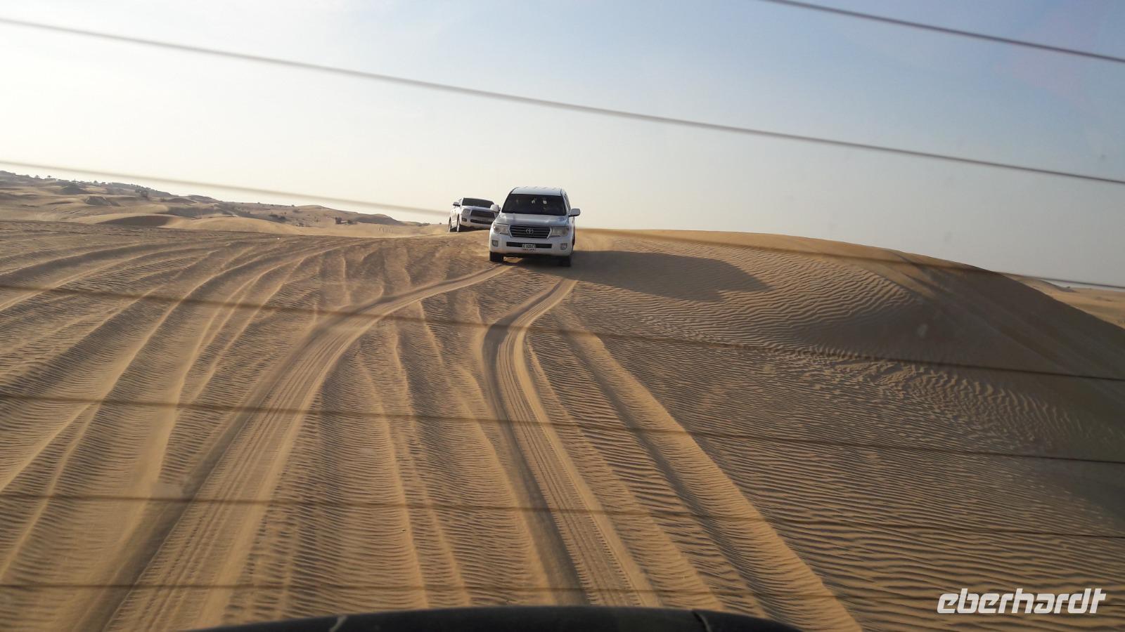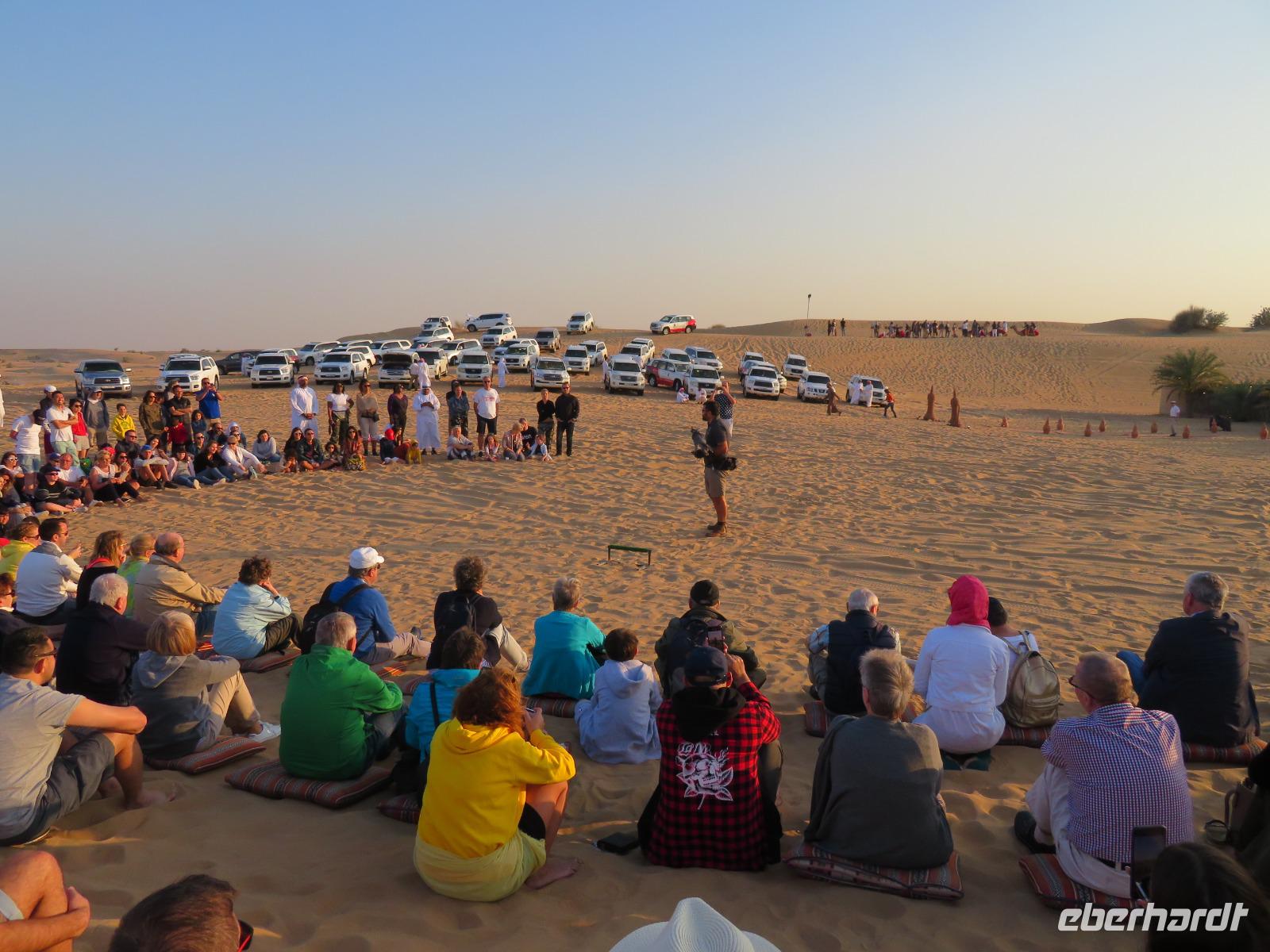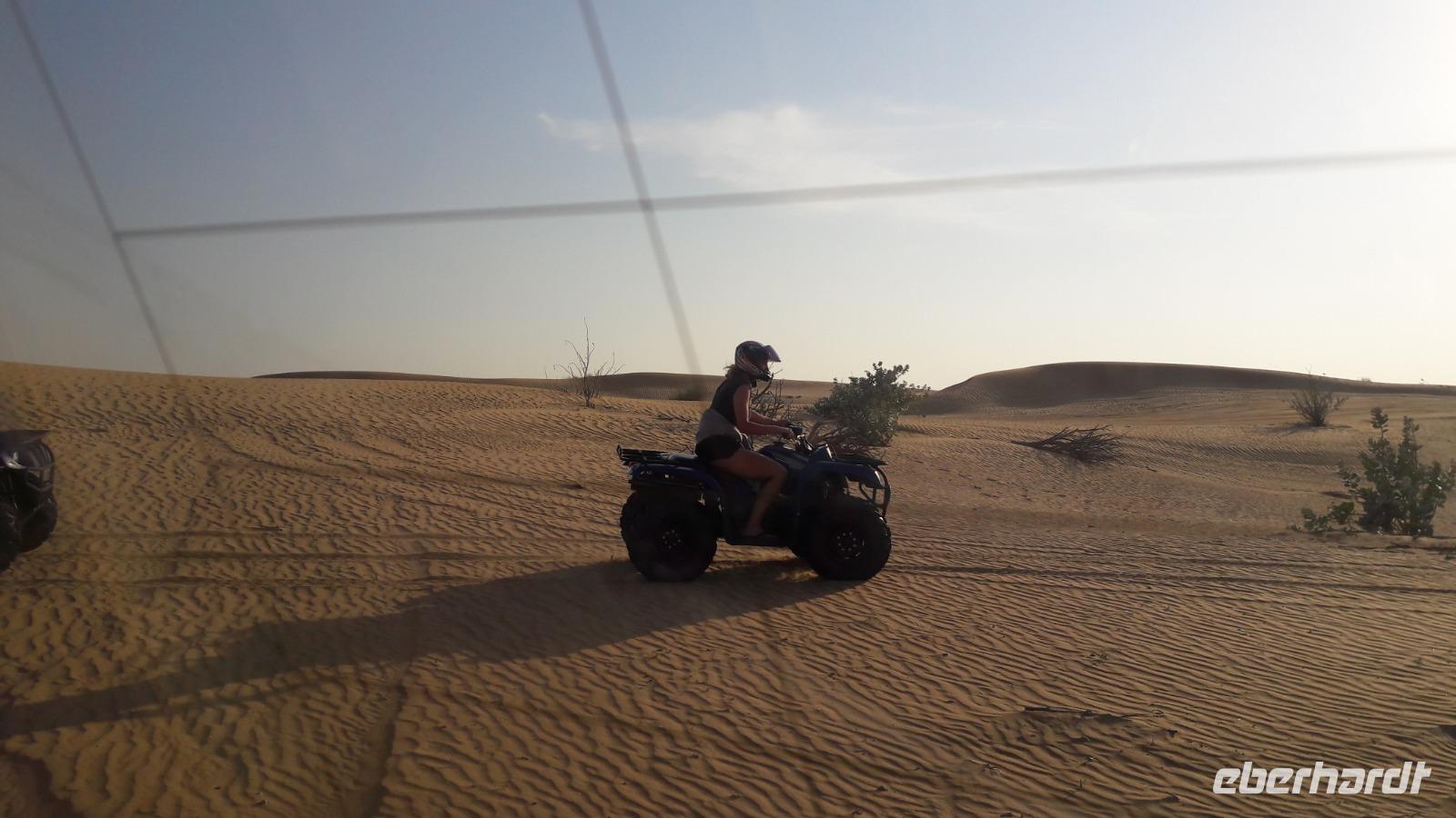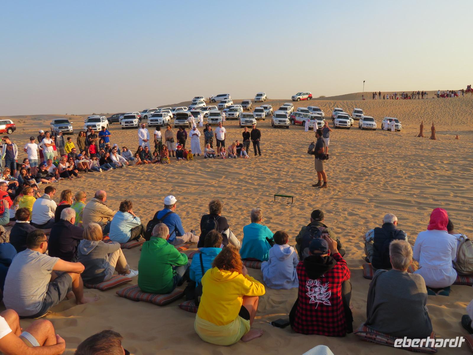 Am Nachmittag holten uns 5 Jeeps vom Hotel ab und nach ca. 45 Minuten Fahrt durch die Stadt standen wir, wortwörtlich, im Wüstensand. Der Reifendruck wird dann auf ein Minimum abgelassen, um ein stecken bleiben der Fahrzeuge im Sand zu vermeiden ... los ging die rasante Fahrt durch die Sanddünen! Dann erreichten wir das Wüstencamp unter freiem Himmel, leider ohne Sterne. Wir erlebten eine Falkner-Show, Henna-Lady's zauberten kleine Kunstwerke auf Hände & Arme, man konnte genüsslich eine Shisha rauchen und das Barbecue schmeckte in dieser Atmosphäre natürlich umso besser! Ein Darwish-Tänzer und eine naja weniger orientalische Bauchtänzerin rundeten den schönen ab. Mit den Jeeps ging es dann zurück nach Dubai und ins Hotel.