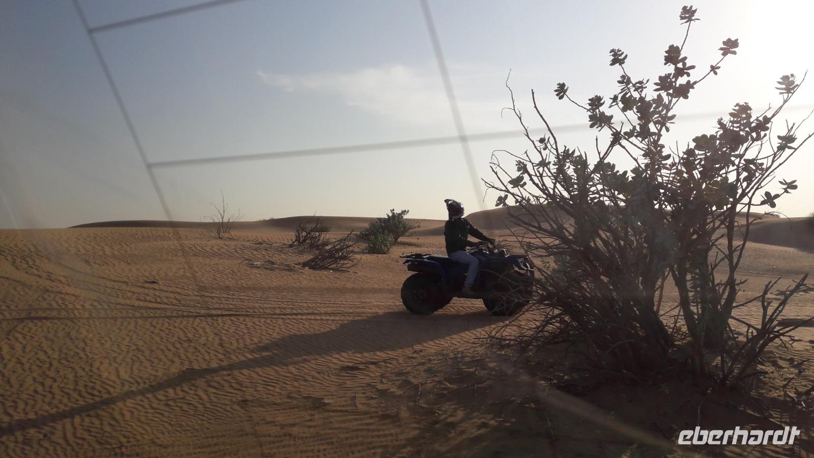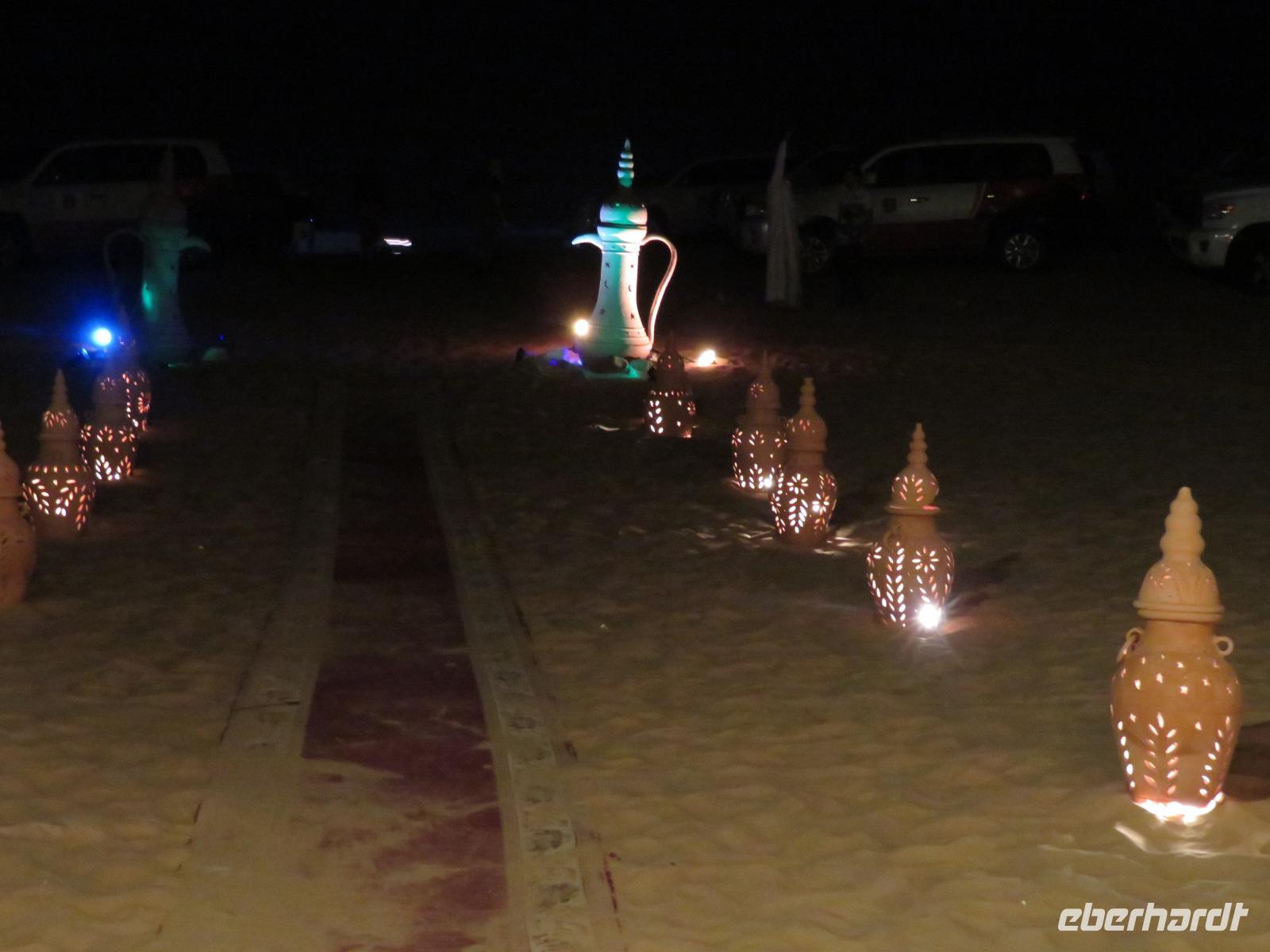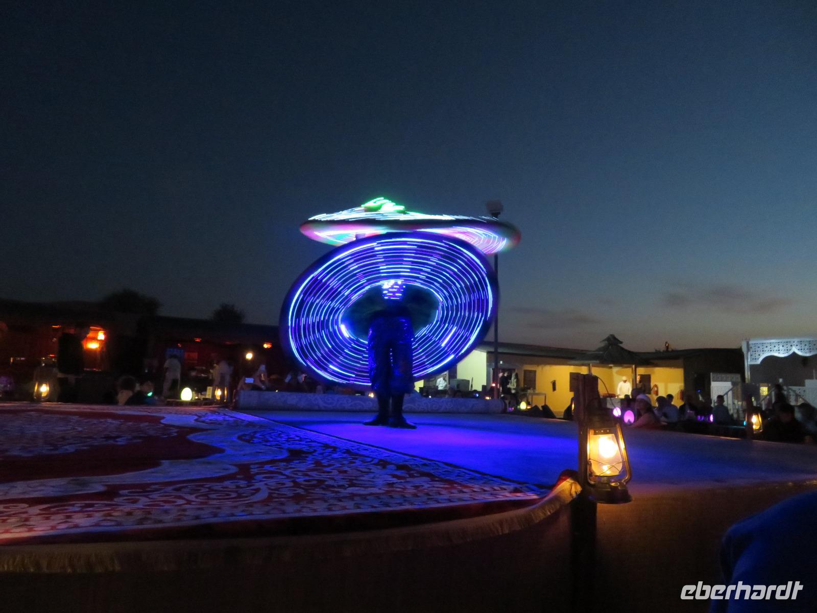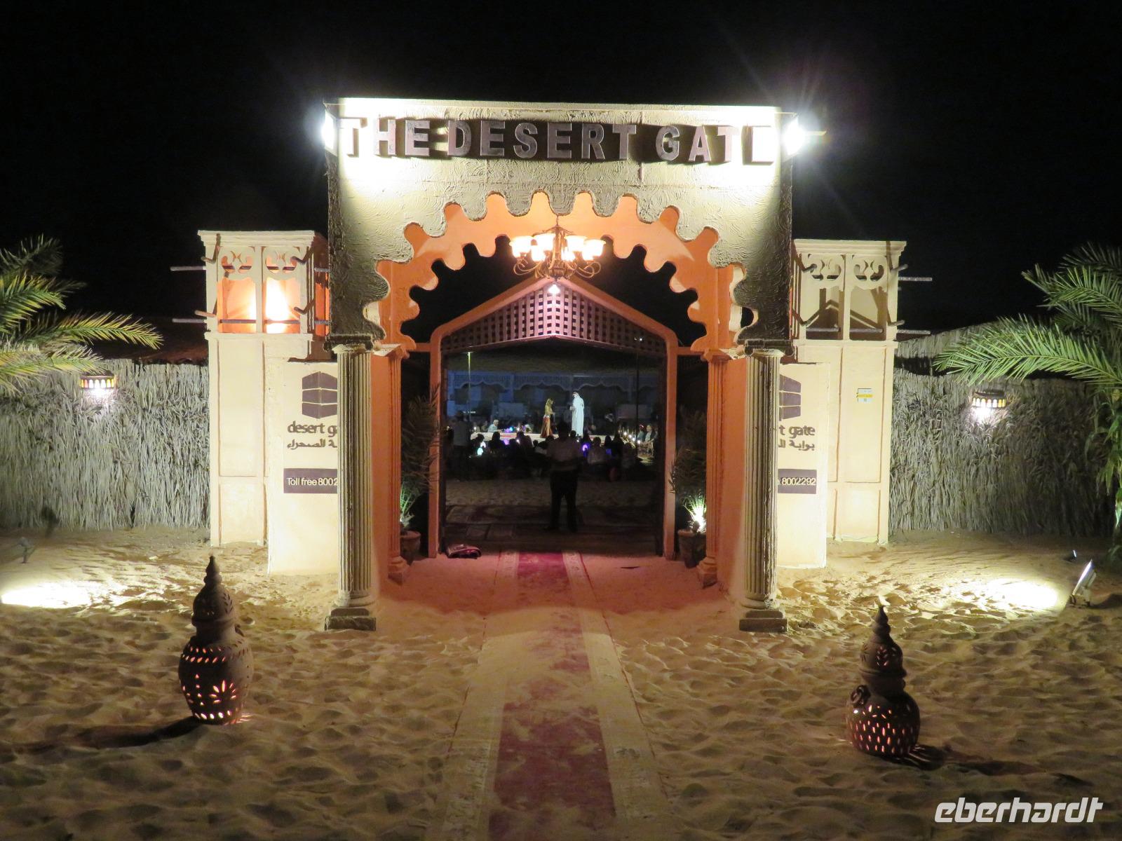 Am Nachmittag holten uns 5 Jeeps vom Hotel ab und nach ca. 45 Minuten Fahrt durch die Stadt standen wir, wortwörtlich, im Wüstensand. Der Reifendruck wird dann auf ein Minimum abgelassen, um ein stecken bleiben der Fahrzeuge im Sand zu vermeiden ... los ging die rasante Fahrt durch die Sanddünen! Dann erreichten wir das Wüstencamp unter freiem Himmel, leider ohne Sterne. Wir erlebten eine Falkner-Show, Henna-Lady's zauberten kleine Kunstwerke auf Hände & Arme, man konnte genüsslich eine Shisha rauchen und das Barbecue schmeckte in dieser Atmosphäre natürlich umso besser! Ein Darwish-Tänzer und eine naja weniger orientalische Bauchtänzerin rundeten den schönen ab. Mit den Jeeps ging es dann zurück nach Dubai und ins Hotel.