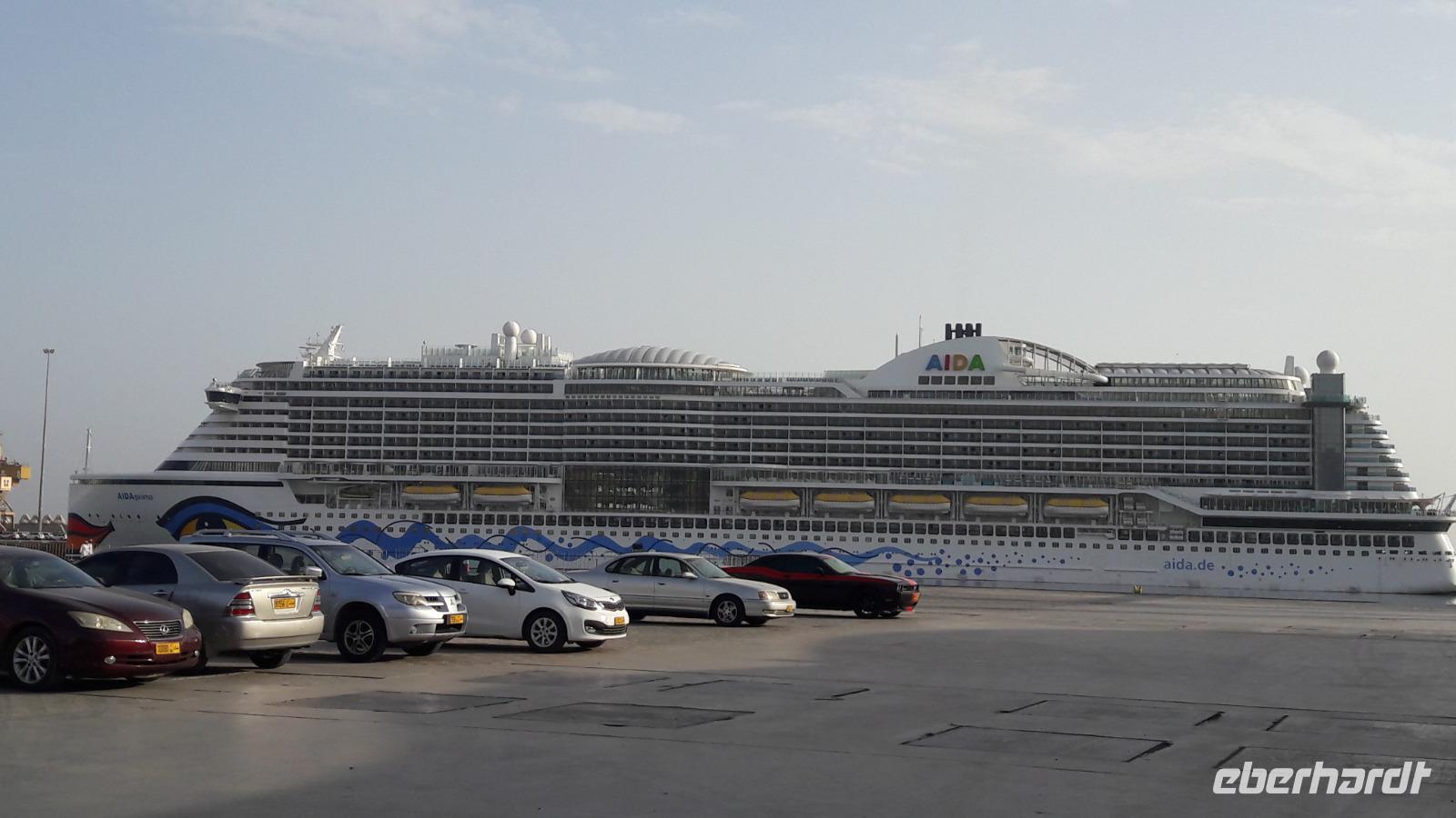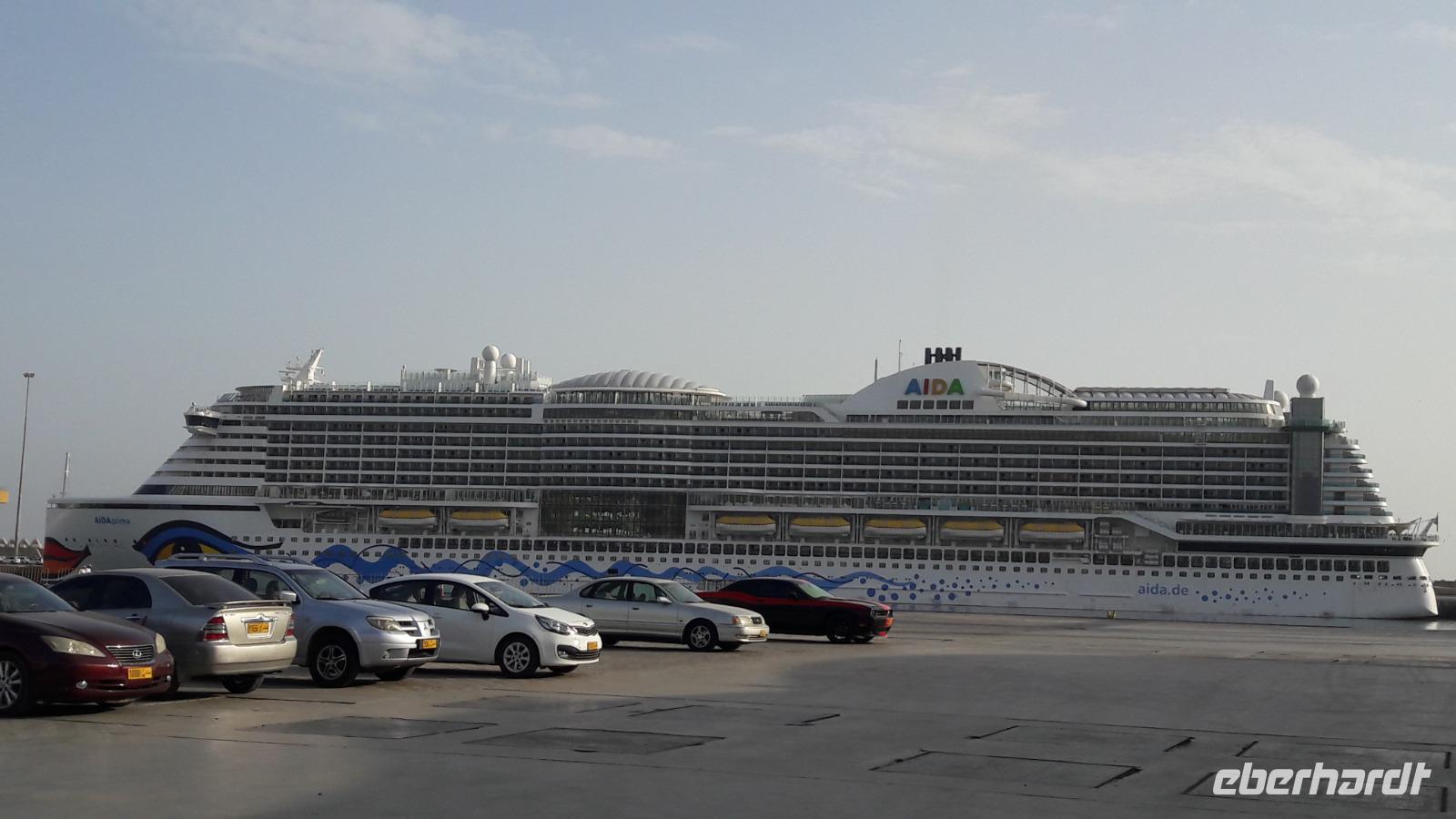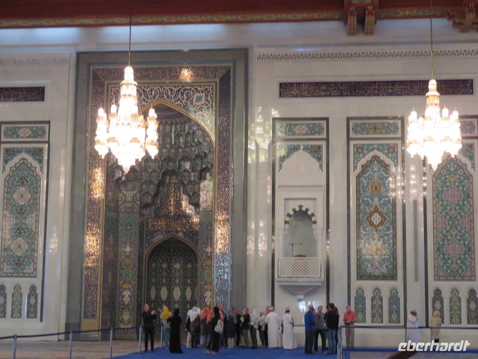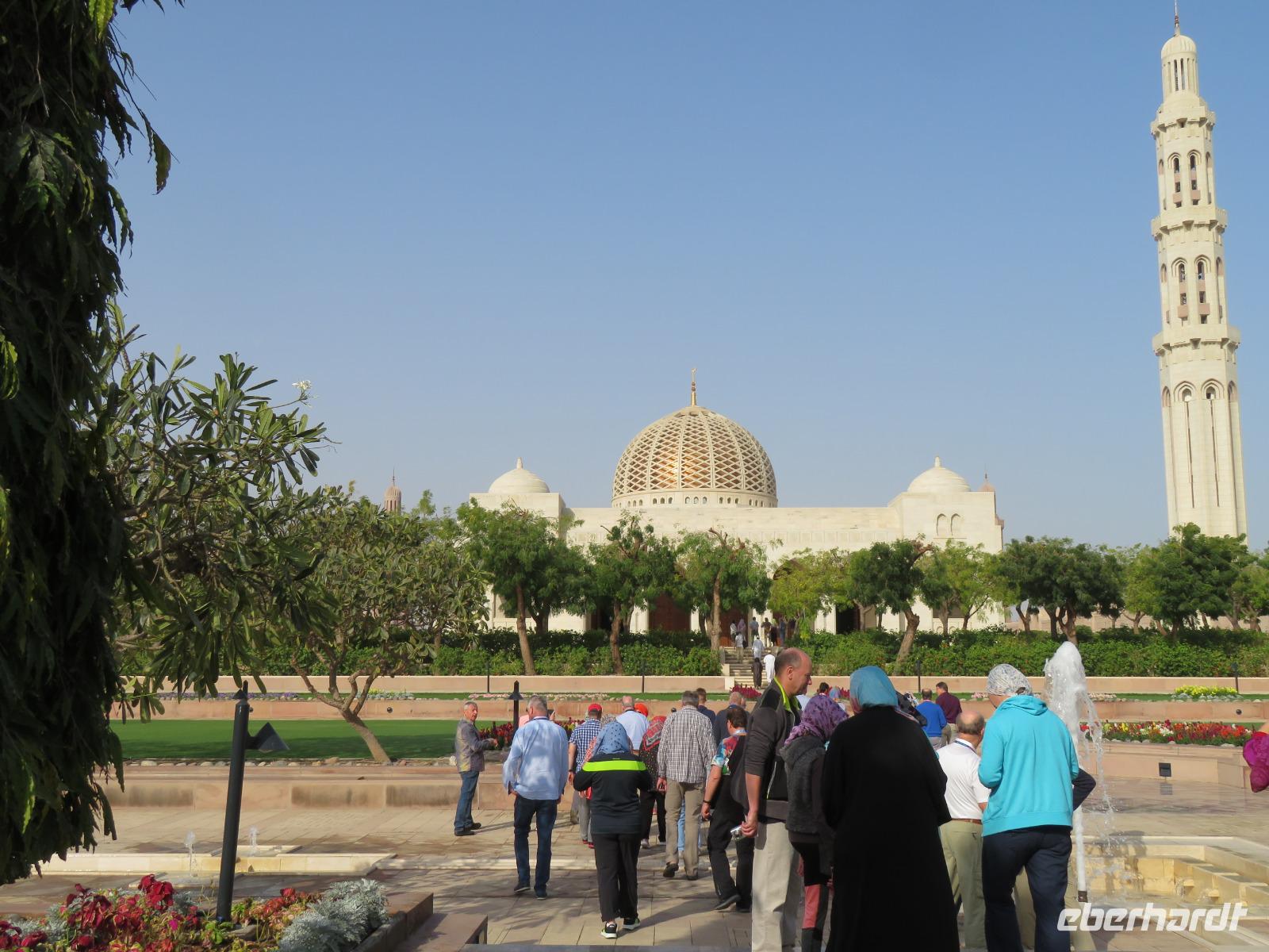 Der Großteil unserer Eberhardt Gruppe hatten für heute den AIDA-Ausflug "Mystisches Muscat" gebucht. Am Morgen erreichten wir das Sultanat Oman bzw. den Hafen der Hauptstadt Muscat bei Sonnenschein und ca. 25 Grad Wärme! Die Stadt liegt in einer geschützten Bucht an der vulkanisch geprägten Küste des Golfs von Oman. Alle Eberhardt'ler saßen gemeinsam im Bus und die Entdeckungstour konnte starten. Nach einer kurzweiligen Fahrt erlebten wir den Besuch einer der wichtigsten Sehenswürdigkeiten im Oman, der Sultan Qaboos Grand Mosque. Die Hauptmoschee gehört zu den hervorragendsten Baudenkmälern im Oman. Als Standort, der im Jahre 2001 eingeweihten Moschee, wurde ein Gebiet an der Hauptstraße zwischen Muscat und Seeb, die Al Qaboos Street, gewählt. Die Moschee besteht aus einer großen Hauptgebetshalle, einer kleineren Frauengebetshalle, fünf Minaretten, zwei großen Bogengängen, einem islamischen Informationszentrum und Institut, sowie einer Bibliothek mit über 20.000 Büchern. Die Moschee bietet Platz für sage und schreibe bis zu 20.000 Gläubigen!