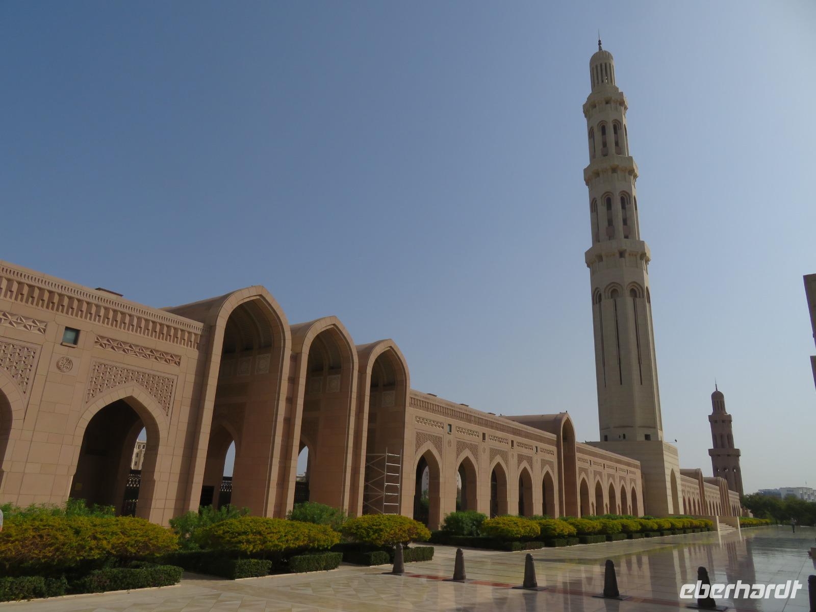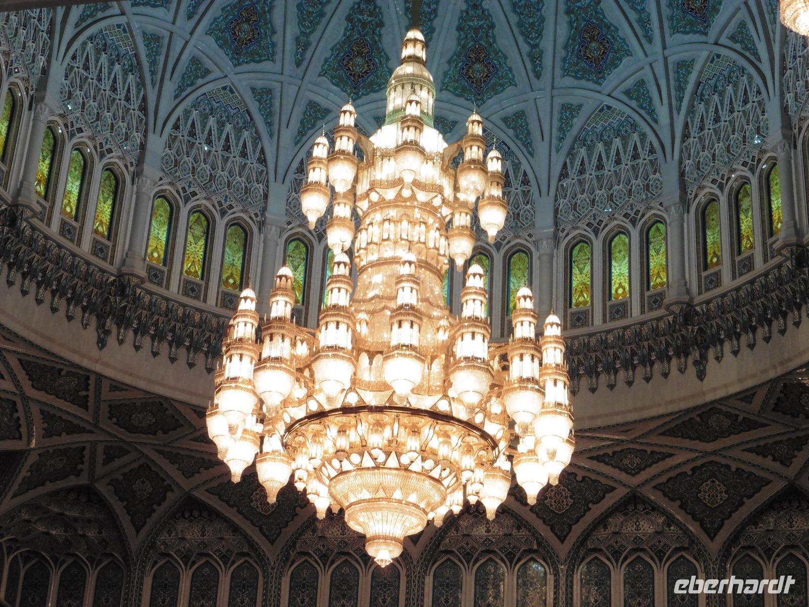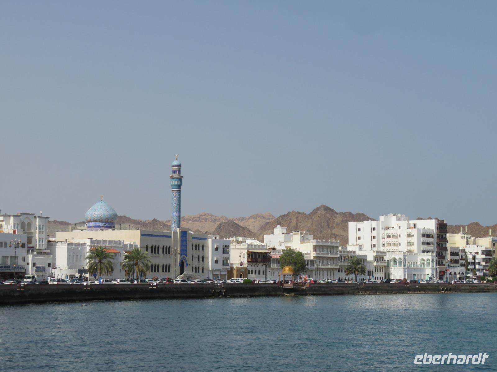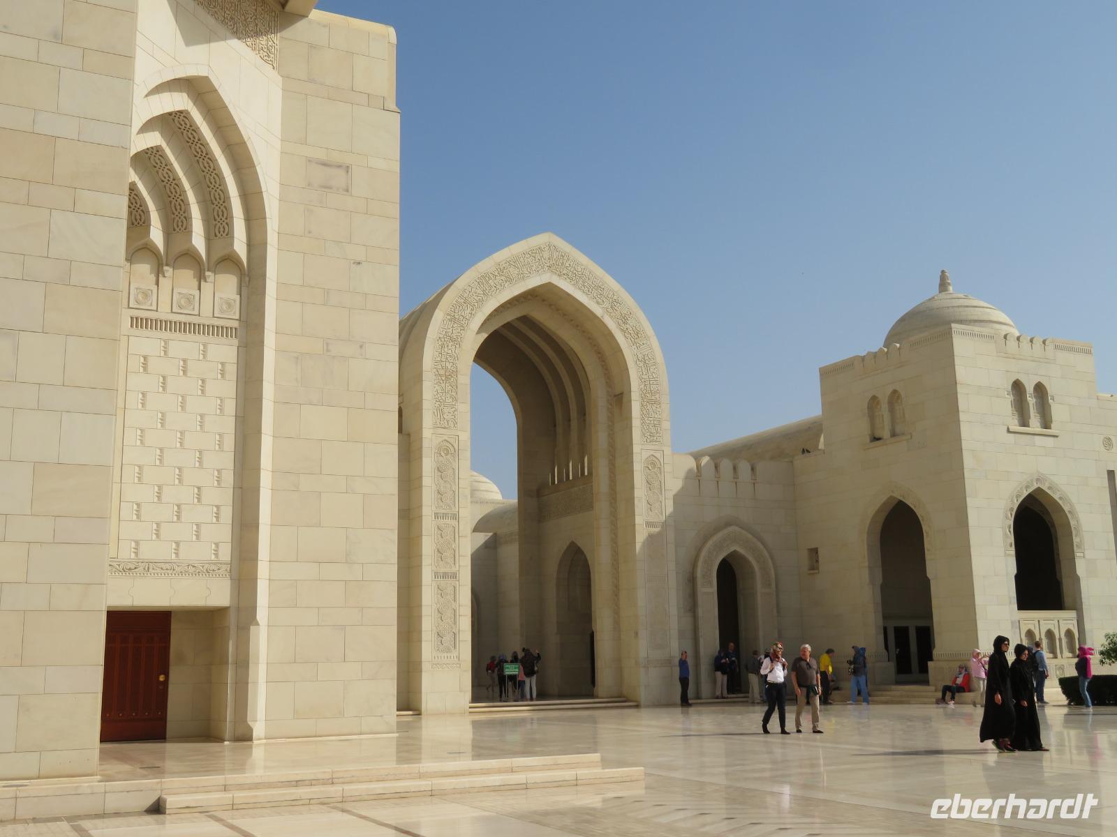 Der Großteil unserer Eberhardt Gruppe hatten für heute den AIDA-Ausflug "Mystisches Muscat" gebucht. Am Morgen erreichten wir das Sultanat Oman bzw. den Hafen der Hauptstadt Muscat bei Sonnenschein und ca. 25 Grad Wärme! Die Stadt liegt in einer geschützten Bucht an der vulkanisch geprägten Küste des Golfs von Oman. Alle Eberhardt'ler saßen gemeinsam im Bus und die Entdeckungstour konnte starten. Nach einer kurzweiligen Fahrt erlebten wir den Besuch einer der wichtigsten Sehenswürdigkeiten im Oman, der Sultan Qaboos Grand Mosque. Die Hauptmoschee gehört zu den hervorragendsten Baudenkmälern im Oman. Als Standort, der im Jahre 2001 eingeweihten Moschee, wurde ein Gebiet an der Hauptstraße zwischen Muscat und Seeb, die Al Qaboos Street, gewählt. Die Moschee besteht aus einer großen Hauptgebetshalle, einer kleineren Frauengebetshalle, fünf Minaretten, zwei großen Bogengängen, einem islamischen Informationszentrum und Institut, sowie einer Bibliothek mit über 20.000 Büchern. Die Moschee bietet Platz für sage und schreibe bis zu 20.000 Gläubigen!