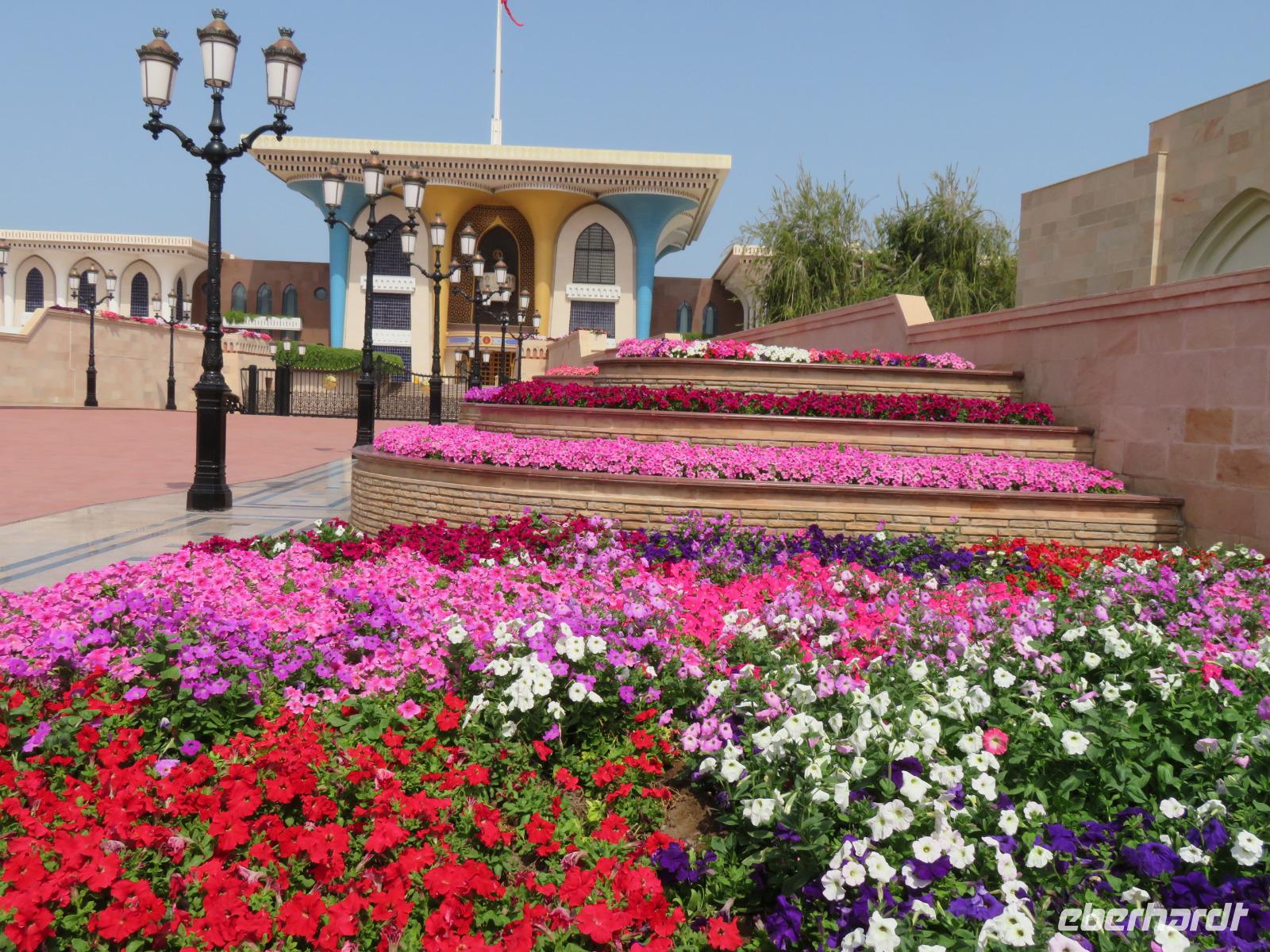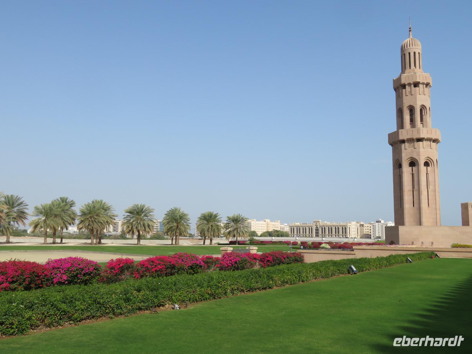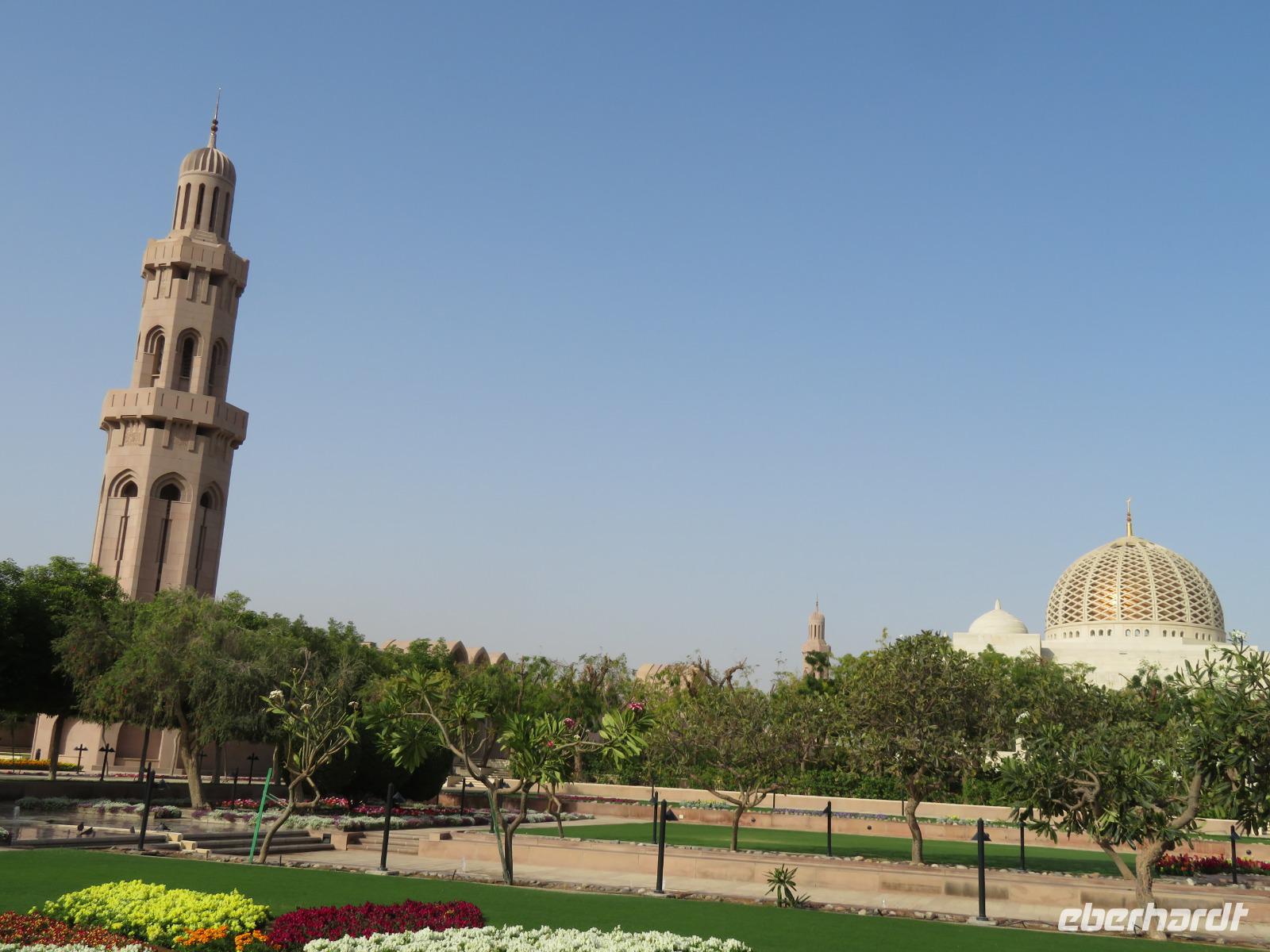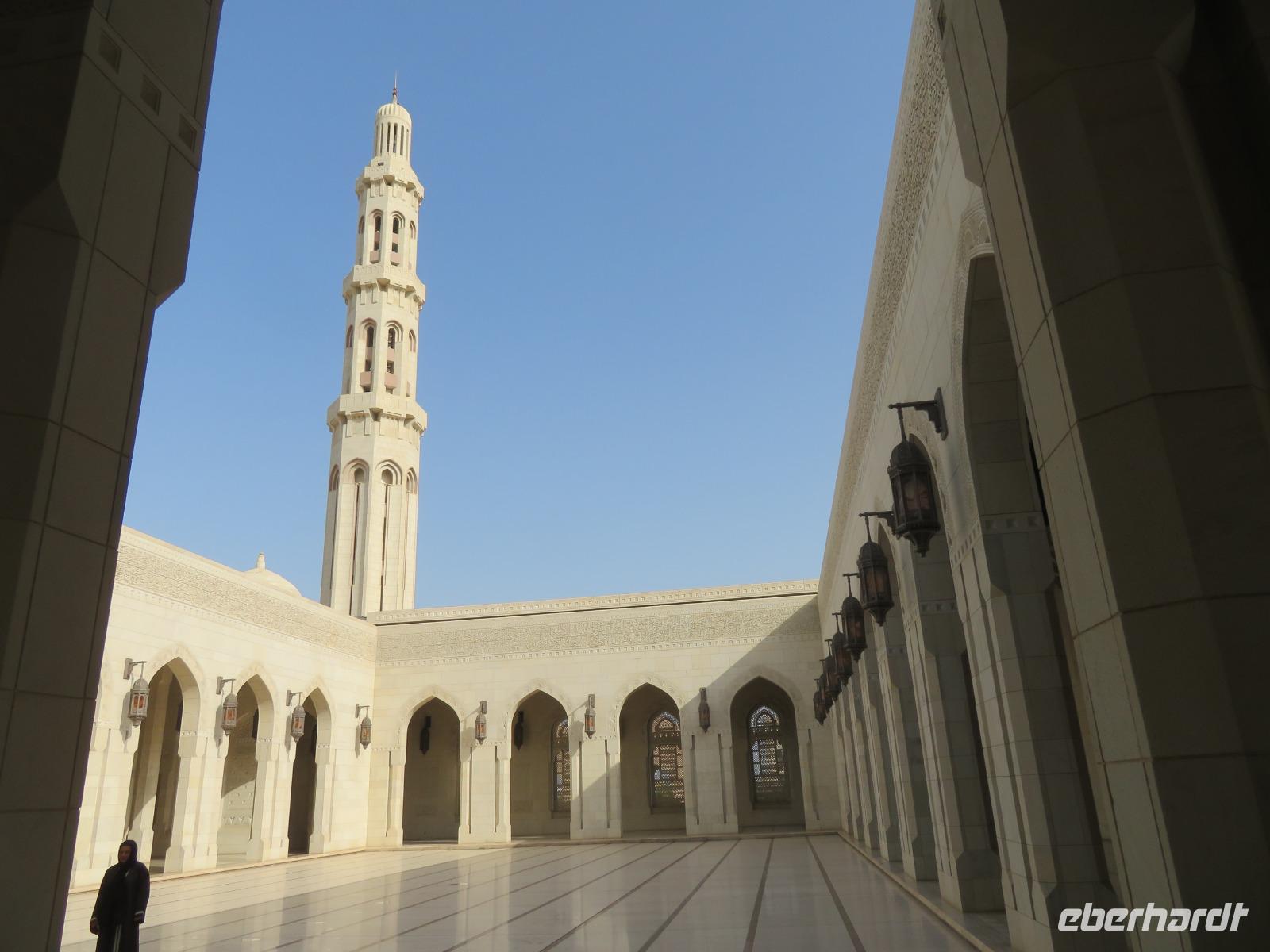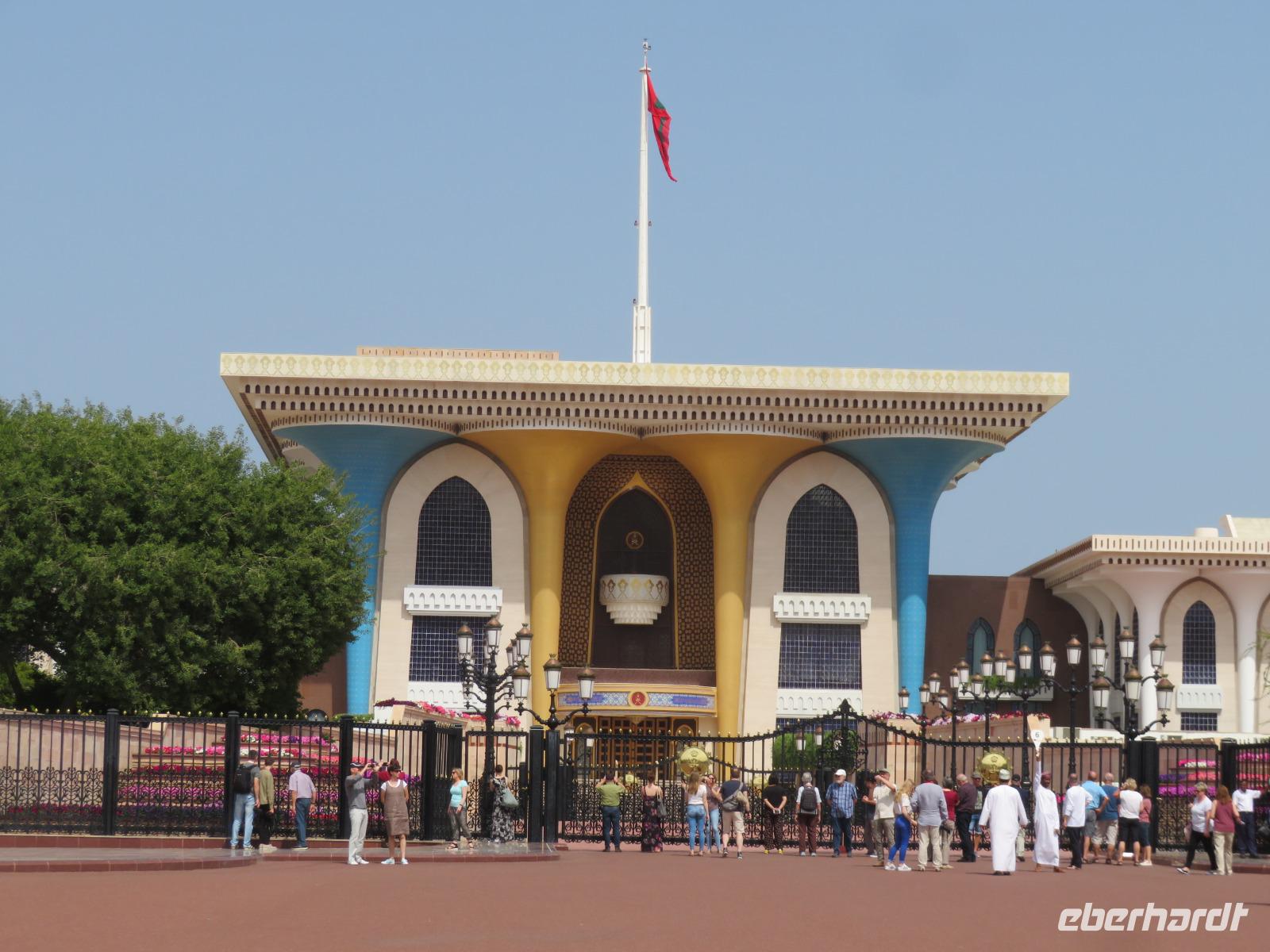 Der Großteil unserer Eberhardt Gruppe hatten für heute den AIDA-Ausflug "Mystisches Muscat" gebucht. Am Morgen erreichten wir das Sultanat Oman bzw. den Hafen der Hauptstadt Muscat bei Sonnenschein und ca. 25 Grad Wärme! Die Stadt liegt in einer geschützten Bucht an der vulkanisch geprägten Küste des Golfs von Oman. Alle Eberhardt'ler saßen gemeinsam im Bus und die Entdeckungstour konnte starten. Nach einer kurzweiligen Fahrt erlebten wir den Besuch einer der wichtigsten Sehenswürdigkeiten im Oman, der Sultan Qaboos Grand Mosque. Die Hauptmoschee gehört zu den hervorragendsten Baudenkmälern im Oman. Als Standort, der im Jahre 2001 eingeweihten Moschee, wurde ein Gebiet an der Hauptstraße zwischen Muscat und Seeb, die Al Qaboos Street, gewählt. Die Moschee besteht aus einer großen Hauptgebetshalle, einer kleineren Frauengebetshalle, fünf Minaretten, zwei großen Bogengängen, einem islamischen Informationszentrum und Institut, sowie einer Bibliothek mit über 20.000 Büchern. Die Moschee bietet Platz für sage und schreibe bis zu 20.000 Gläubigen!