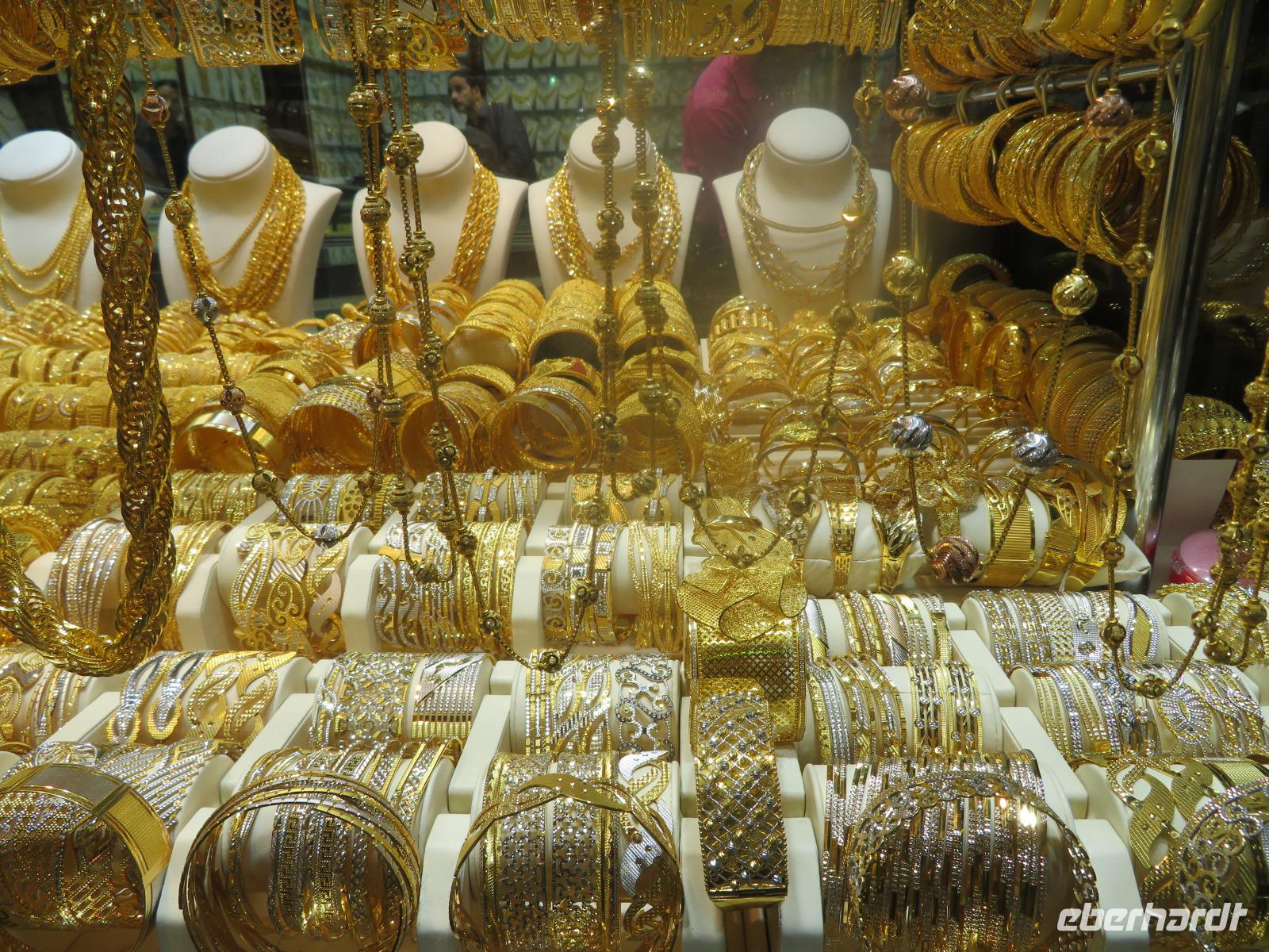 In Deira angekommen, erwartete uns ein pures Dufterlebnis - der farbenprächtige Gewürz- Souk. Feiner Safran, gemahlener Kardamom, getrocknete Limonen, feuerrote Chilischoten, Pfeffer, Paprika, Curry, Muskatnuss, Pfefferminze und Koriander dufteten verführerisch und werden hier aus offenen Säcken verkauft.Auf dem traditionellen Gold-Souk erlebten wir eine wahre Glitzerwelt. Zu Recht hat dieser Souk auch den Beinamen "City of Gold" bekommen, denn alles was man hier sieht ist pures Gold. Die Mengen und die Vielfalt der einzelnen Schmuckstücke im Souk erschlägt die Besucher förmlich. Natürlich ist in einem der ca. 400 Juwelier-Geschäften der größte Goldring der Welt zu finden. Nur tragen kann den niemand - zu groß, zu schwer aber mit Zertifikat.;-) Mit der Abra schipperten wir wieder zurück nach Bur Dubai und besuchten Dubai-Museum. Das Gebäude, in dem das Museum untergebracht ist, ist eines der ältesten der Stadt. In dem 1787 erbauten Al-Fahidi Fort, welches bis in die 1960er Jahre noch der Sitz des Scheichs und somit der Regierung war, befindet sich heute ein tolles heimatkundliches Museum. Eindrucksvolle Bilder zeigen, dass das Lehmfort noch bis in die zweite Hälfte des 19. Jahrhunderts allein am sandigen Ufer des Creeks stand und über das kleine Fischer- und Perlentaucherdorf Dubai wachte. Der größte Teil des Museums liegt unter der Erde. Hier erfährt man viel über die Geschichte der Emirate, über das Perlentauchen, die Falkenjagd, die Kamelzucht und das Leben in der Wüste in der Vergangenheit. Am frühen Nachmittag kamen wir voller interessanter Eindrücke ins Hotel zurück und stärkten uns bei einem leckeren Lunch für das nächste Abenteuer des Tages - die Wüstensafari. Eberhardt TRAVEL treibt seine Reisegäste nicht nur auf die Palme (Palm Jumeirah), sondern schickt sie auch noch in die Wüste. ;-)