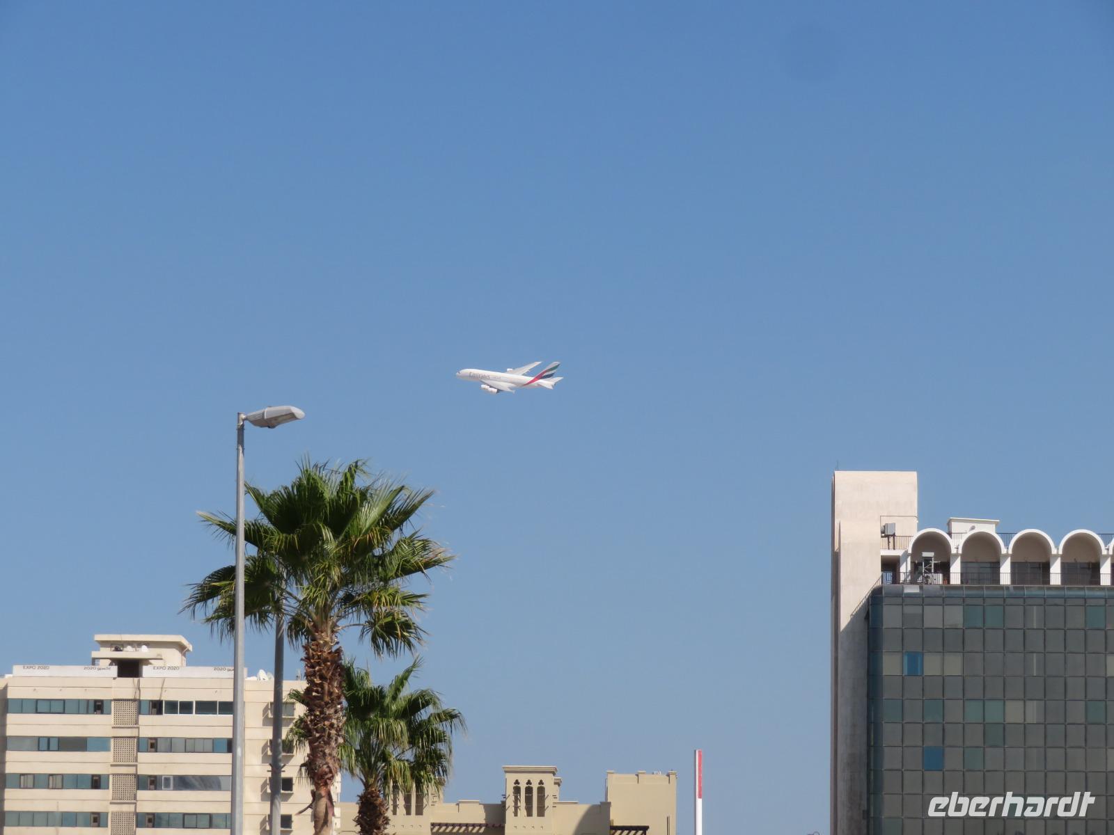 Der moderne Václav-Havel-Flughafen der tschechischen Hauptstadt ist schon beeindruckend. Pünktlich starten wir mit einem A380-800 von Emirates in Richtung Orient. Die Zeit verging sprichwörtlich wie im Fluge und wir landeten kurz nach Mitternacht in der Trendmetropole am Arabischen Golf - Dubai. Schnell waren die Einreiseformalitäten erledigt und wir konnten unsere örtliche Reiseleiterin Anja begrüßen. Nach einer kleinen Lichterfahrt erreichten wir das 4-Sterne-Hotel "Arabian Courtyard", welches in der Altstadt im Stadtteil Bur Dubai und direkt gegenüber des Dubai Museums liegt. Nach dem Check-In fielen wir müde ins Bett und freuten uns auf die Entdeckungen am kommenden Tag.