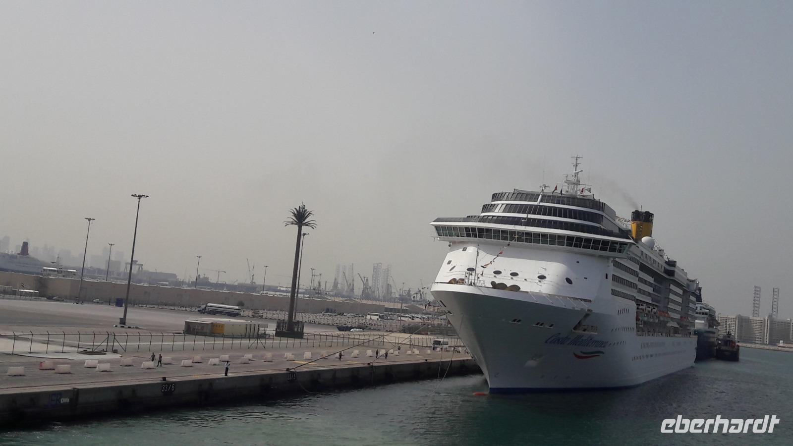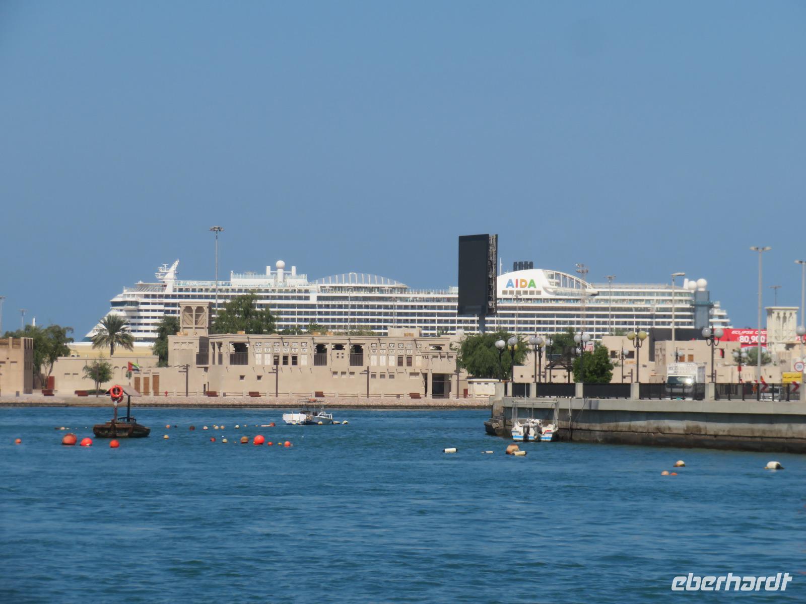 Nun wurde es so langsam Zeit in den Hafen Port Rashid zu fahren, die AIDAprima wartete auf uns. Wir verabschiedeten uns herzlich von Anja und unserem netten Busfahrer Ibrahim, beide würden wir in Abu Dhabi wiedersehen, checkten ein und genossen den Rest des Tages an Bord! Besonders sehenswert war die Laser-Show am Abend, die uns auf die kommenden Tage im Orient einstimmen sollte!
