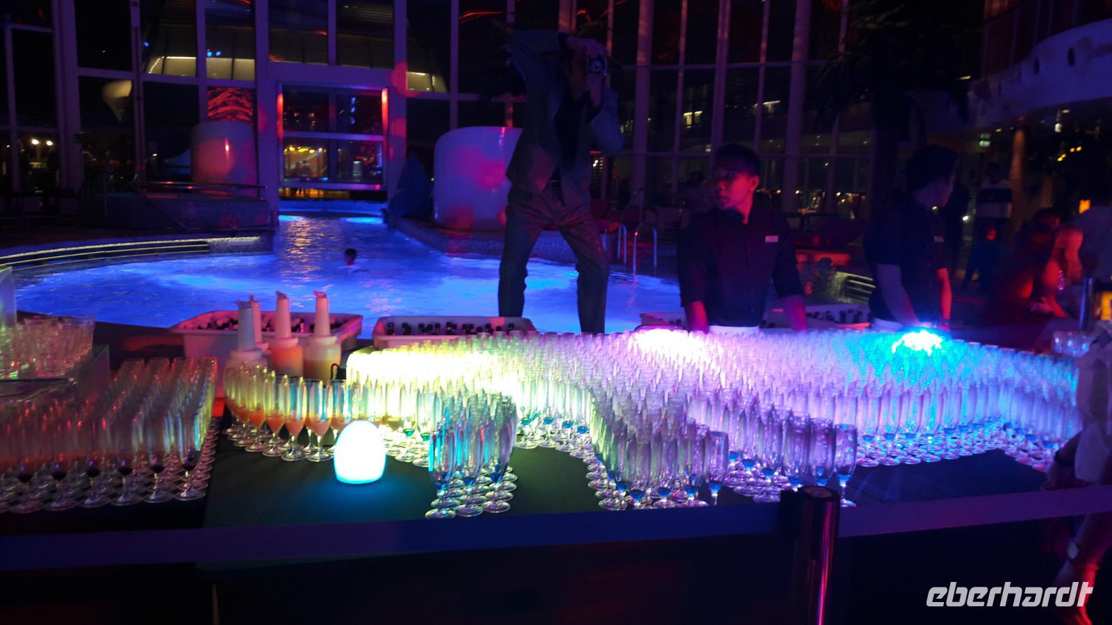 Es wurde Zeit, auf eine erlebnisreiche Reise anzustoßen. Zu diesem Anlass traf sich unsere Eberhardt-Reisegruppe nach dem Auslaufen in Dubai in der Lanai-Bar auf Deck 7 zu einem kleinen Sektempfang. Den Nachmittag verbrachten wir an Bord ganz nach eigenem Belieben. Ob beim abwechslungsreiche Programm auf dem Pooldeck, in der gemütlichen Wellnessoase, in einer der Bar's oder bei Vorträgen im Theatrium, jeder fand seinen Lieblingsplatz und konnte den Tag genießen.