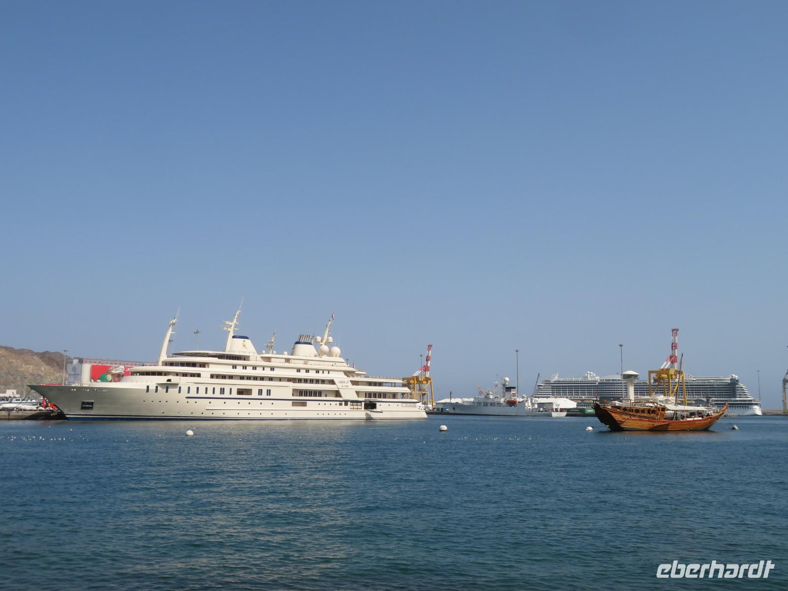 Nach dem erlebnisreichen Vorprogramm in Dubai kam der heutige Tag auf See gerade recht. Bevor die Leinen losgemacht wurden hiess es erst einmal "Alle Mann zur Seenotrettungsübung", die zu Beginn jeder Kreuzfahrt obligatorisch ist. Nach dem Signal bewaffneten wir uns mit unseren leuchtend orangen Schwimmwesten und versammelten uns an der jeweiligen Musterstation. Dann hieß es "Leinen los", in Richtung Muscat im Sultanat Oman.