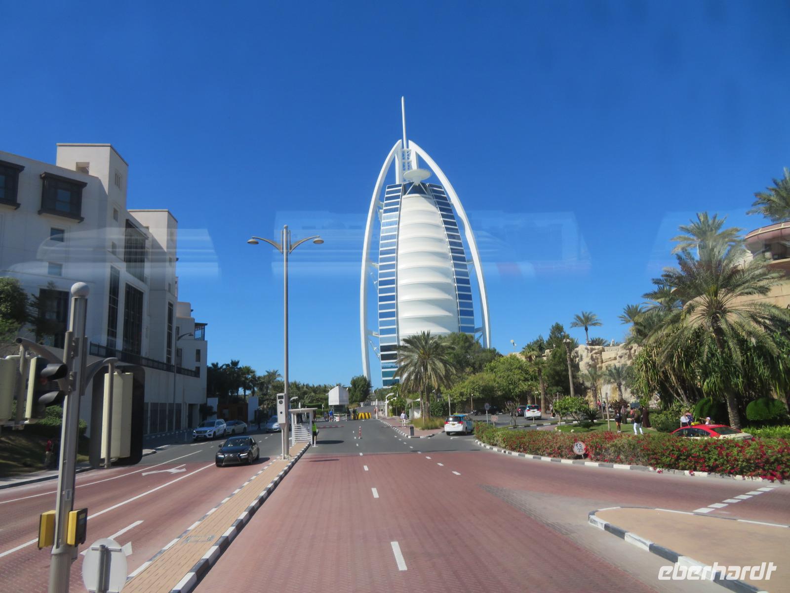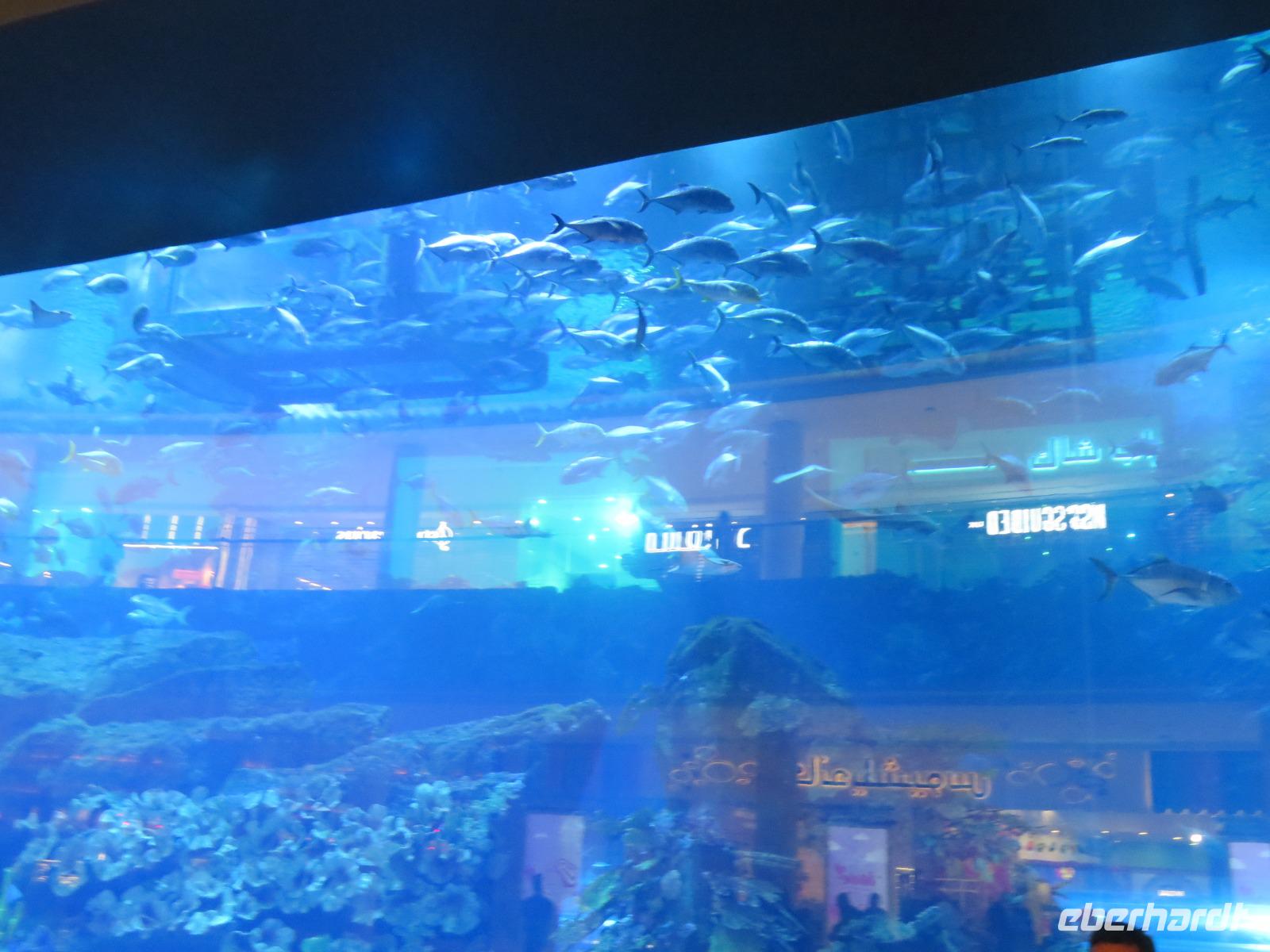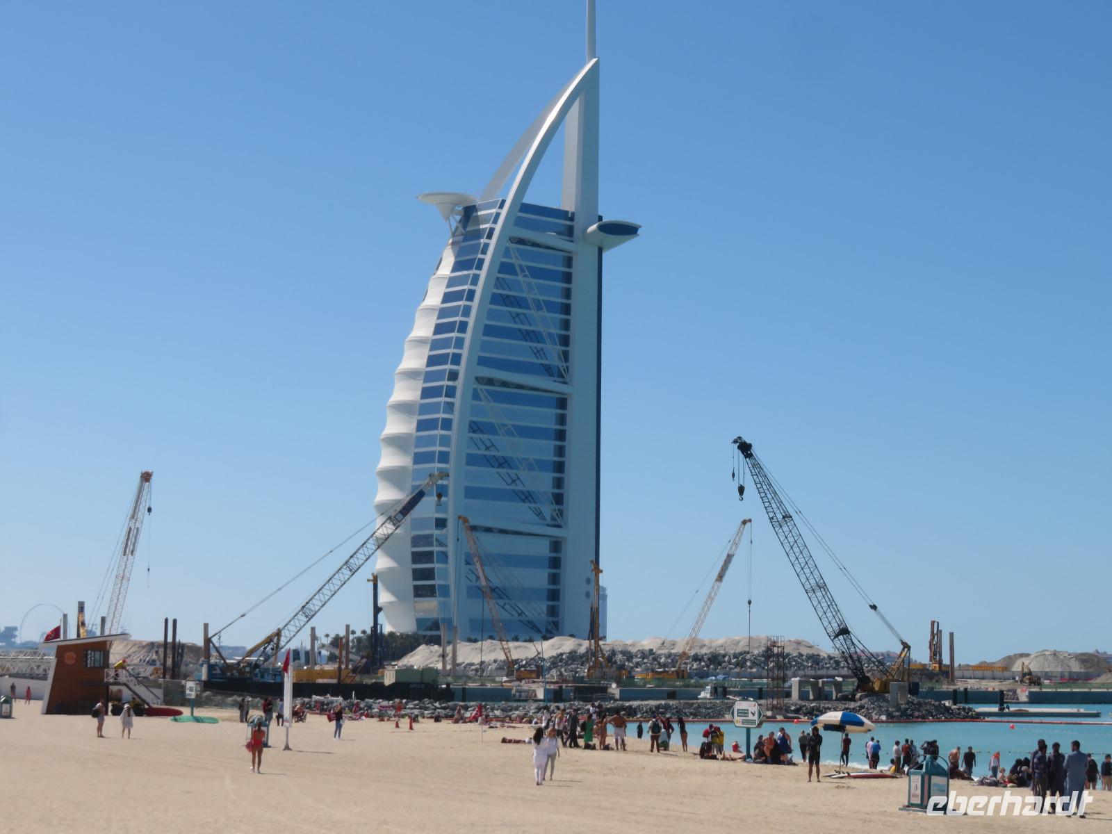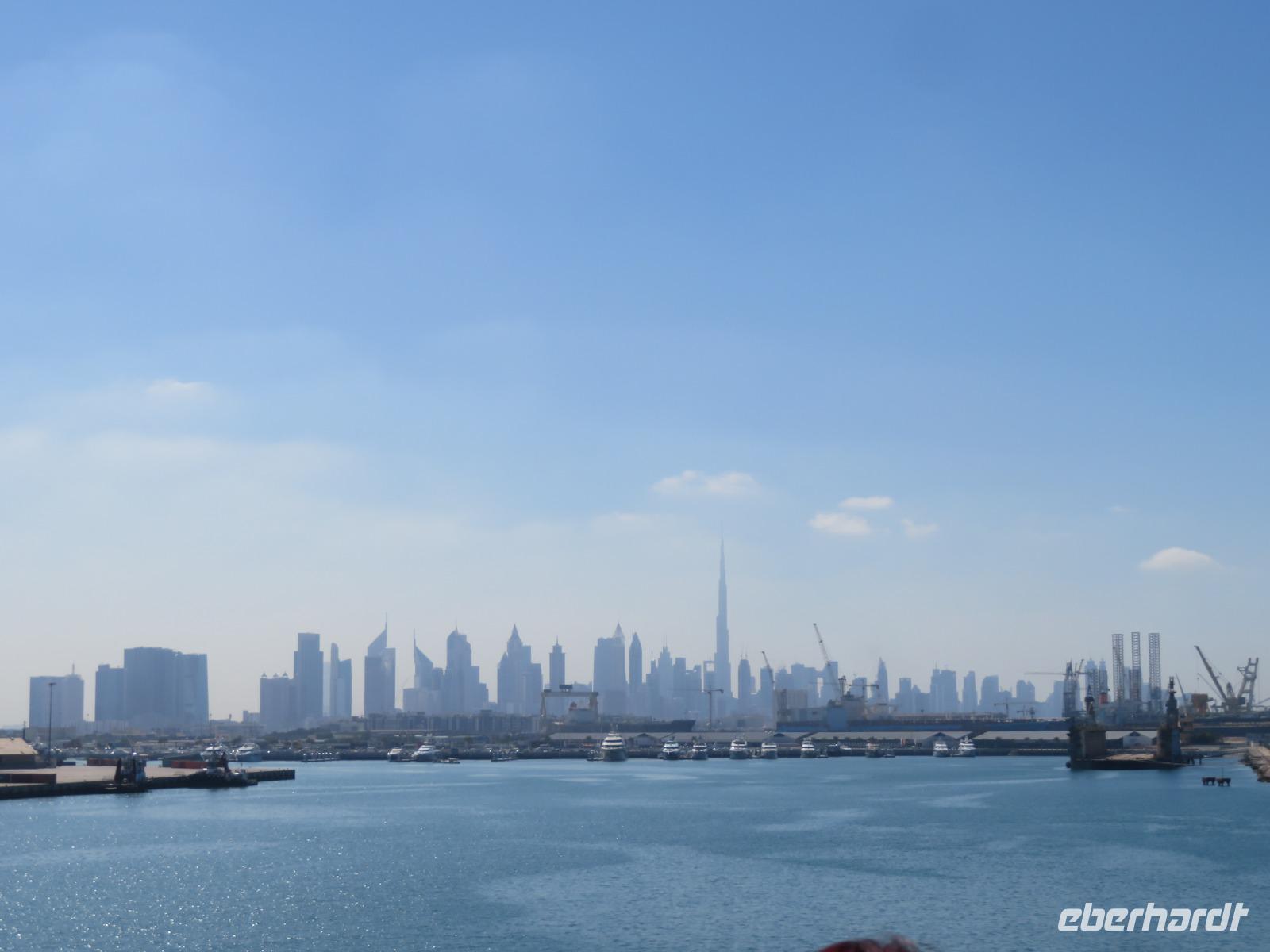 Heute trafen wir bereits um 9:00 Uhr wieder auf Hassan, um uns durch das neue moderne Dubai führen zu lassen. Unser Bus hielt direkt in der unteren Etage der riesigen Dubai Mall, das zweitgrößte Einkaufscenter der Welt, nach der South China Mall in Dungguan. Nach einem kurzen Spaziergang durch die gigantische Mall, endeten wir am Eingang des Burj Khalifa, der noch höchste Wolkenkratzer der Welt und eines der beiden Wahrzeichen der Stadt. Der schnellste Aufzug der Welt brachte uns in 45 Sekunden, also mit einer Geschwindigkeit von 10m/sec, auf die 124. Etage, auf 452 Meter. Eine Treppe führt noch auf die 125 Etage. Von oben konnten wir schon den künstlich angelegten See Lake Dubai sehen, in dem täglich ab 18:00 Uhr die weltbekannten ‚Dubai Fountain' abwechselnd zu arabischer und europäischer Musik tanzen, die größten Wasserspiele der Welt. Der Burj Khalifa, mit einer Höhe von 828 Meter, stellt aber noch weitere Weltrekorde auf. Das höchste Hotel, die höchste Bibliothek und das höchste Restaurant. Nach einem kleinen Einkaufsbummel in der Dubai Mall, liefen wir gemeinsam an einem riesigen Indoor-Wasserfall, einer Eislaufbahn und ein Aquarium mit der größten Acrylglas-Scheibe der Welt vorbei. Über drei Etagen erstreckt sich das Wasserbecken mit über 33.000 Meeresbewohnern, die durch ein 32 Meter breites und 8 Meter hohes Acrylglasfenster beobachten werden können. Wieder am Bus angekommen ging es direkt weiter zu einem kurzen Fotostopp am Burj Al Arab, das bekannteste Wahrzeichen der Stadt. Ein segelförmiges, auf einer künstlich aufgeschütteten Insel gebautes 7 Sterne Hotel, eines der luxuriösesten Hotels der Welt. Beim anschließenden Besuch der Mall of Emirates, blieb Zeit für ein kleines Mittagessen. Dabei konnten wir einen Blick in die integrierte Wintersporthalle werfen. Fünf Skipisten mit zwei Liftanlagen und der größte Indoor-Snowpark der Welt, lassen die Herzen von Wintersportlern höherschlagen. Weiter ging es mit dem Bus, der uns direkt an der ersten Station der Palm Jumeirah Monorail heraus lies. Wir fuhren bis zur Endstadion, auf der Palm Jumeirah, einer riesigen künstlich aufgeschütteten Insel in der Gestalt einer Palme. Auf dem Außenring befindet sich das ‚Atlantis The Palm Dubai Hotel', welches an die gleichnamige Insel erinnert. Nach einer kurzen Innenbesichtigung des Einkaufsbereichs des Hotels, sammelte uns unser Busfahrer wieder ein. Unser nächster Halt hieß AIDA. Wir verabschiedeten uns von Hassan und verschwanden im Cruise Ship Terminal im Port Rashid. Unsere Reisepässe gaben wir ab und erhielten die Bordkarten. Nach einer Sicherheitskontrolle betraten wir ca. 17:30 Uhr das Schiff und konnten unsere Kabinen aufsuchen. Einige Gäste genossen bereits am Abend die Annehmlichkeiten, die eine AIDA Kreuzfahrt mit sich bringt, mit anderen Gästen traf ich mich um 19:00 Uhr, um das Schiff noch einmal zu verlassen. Wir setzten uns in zwei Taxen und ließen uns nochmal in die Dubai Mall fahren. Dort erlebten wir eine spektakuläre Lasershow an der Fassade des Burj Khalifa und unfassbar schöne Wasserspiele. Die Fontänen schießen das Wasser bis zu 150 Meter hoch in einer perfekten Symbiose mit der Musik. Verzaubert von dem Spektakel, fuhren wir mittels Taxi wieder zur AIDA zurück.