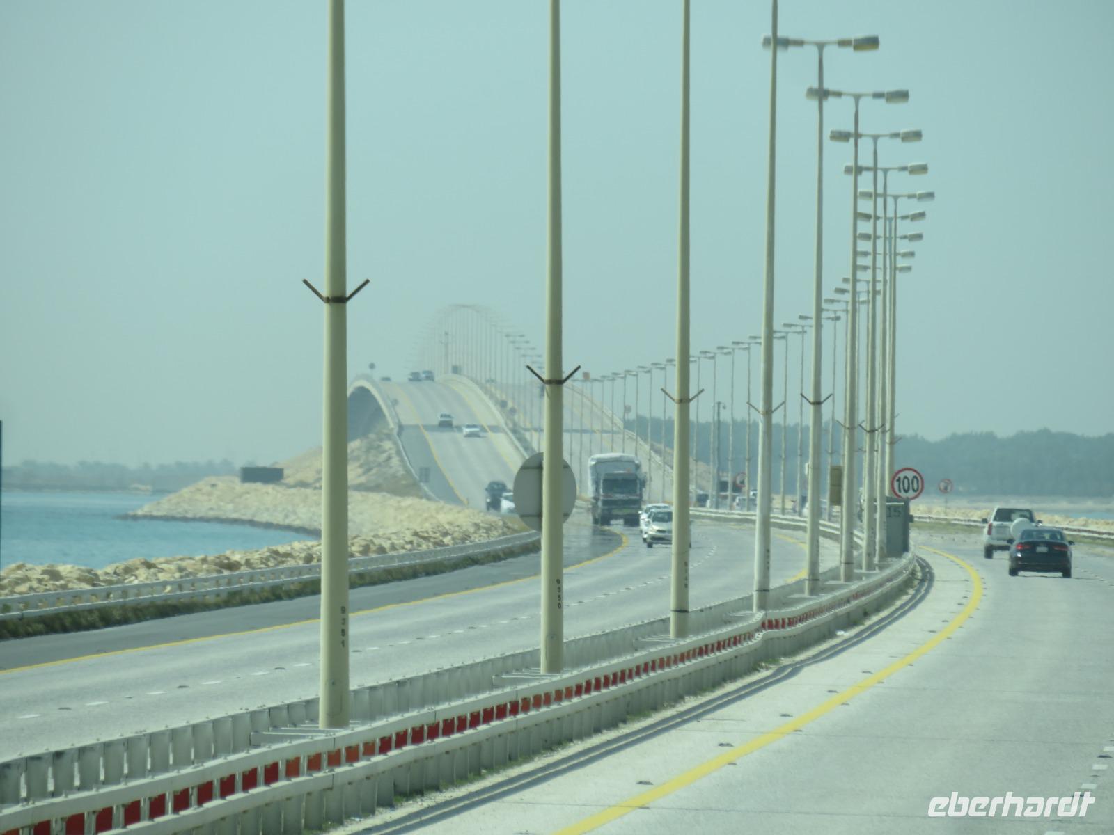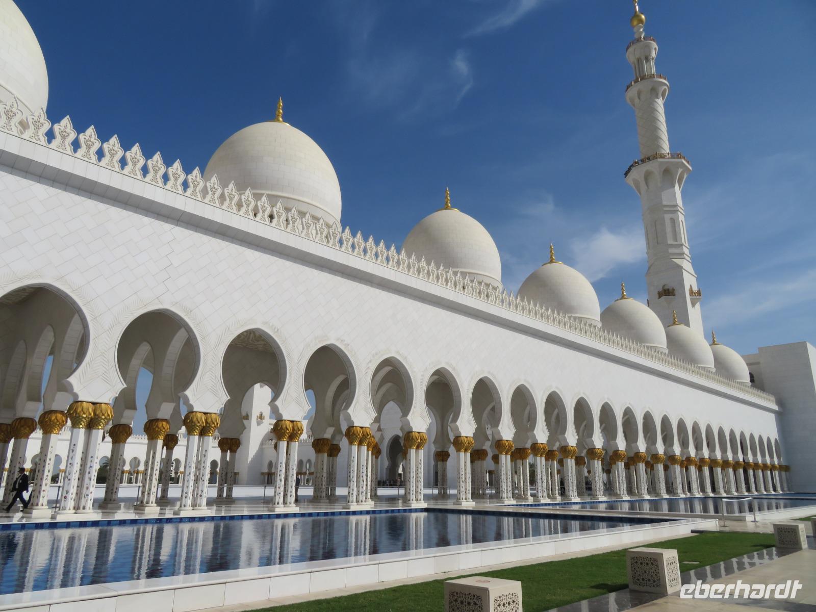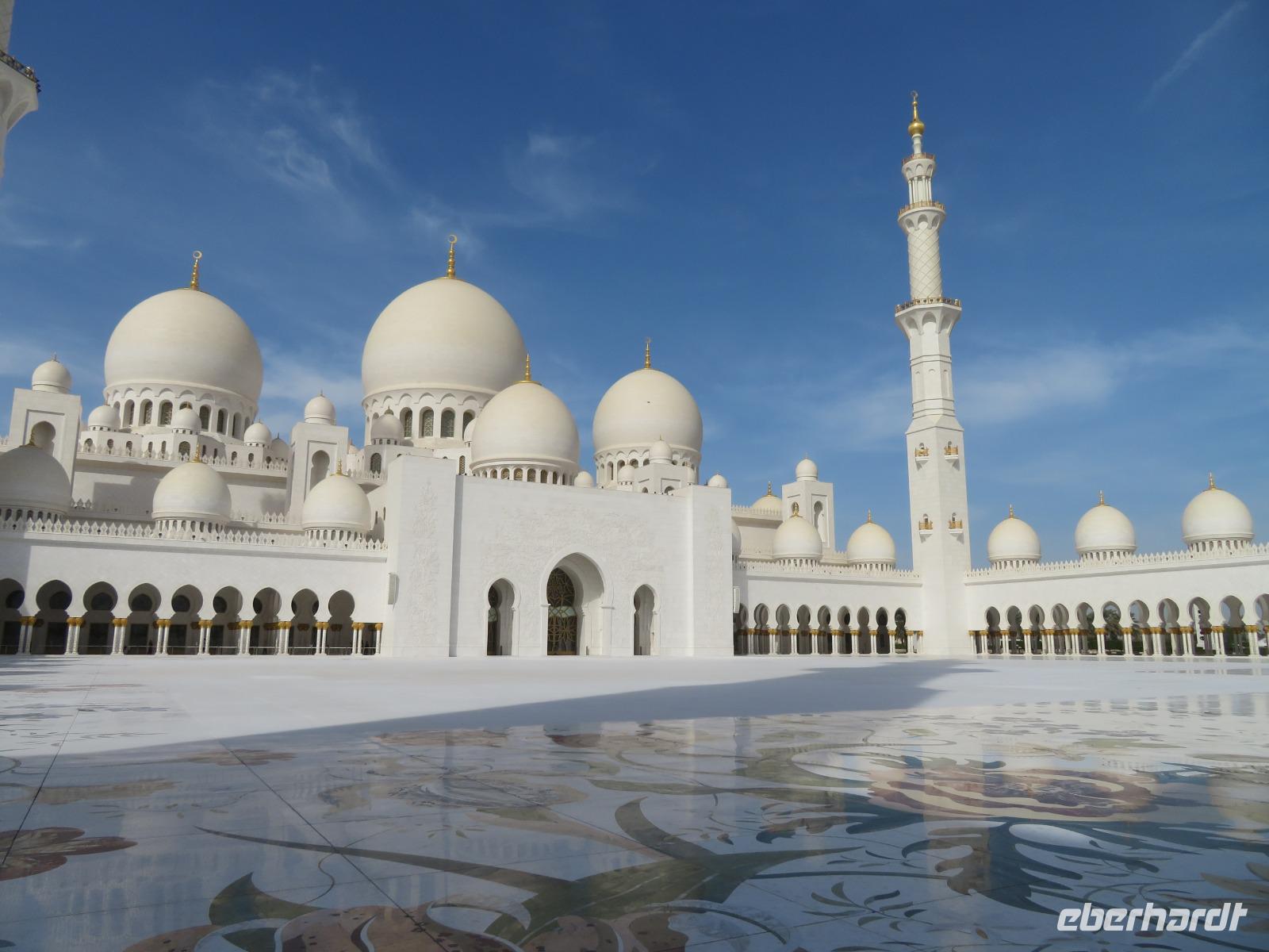 Pünktlich 8 Uhr treffen wir auf unseren heutigen Reiseleiter Ibrahim. Er begleitete uns bereits in Dubai bei der Jeep Safari zum Wüstencamp. Heute zeigt er uns das schöne Abu Dhabi, die Hauptstadt und zugleich das Reichste der sieben Emirate. Mehr als 90 % der Erdölvorkommen der Föderation besitzt Abu Dhabi. Entlang des ‚Sheikh Khalifa Highway', die Verbindungsstraße nach Dubai, fuhren wir auf Yas Island. Hier warfen wir einen kurzen Blick auf den acht Hektar großen Vergnügungspark ‚Ferrari World'. Die schnellste Achterbahn der Welt mit einer Höchstgeschwindigkeit von 240 km/h befindet sich hier. Das letzte Formel 1 Rennen jeden Jahres findet bei Nacht direkt daneben statt. Vorher wird der Sand der kompletten Umgebung präpariert, um Verwehungen auf der Strecke zu vermeiden. Ein absolutes Highlight der Reise ist die anschließende Besichtigung der ‚Sheikh Zayed Grand Moschee', die größte Moschee der Vereinigten Emirate. Angemessen gekleidet ging es für uns durch einen nicht aufhörenden Tunnel aus Rollbändern zum Eingang der Moschee. Mit über 60 Kuppeln, hunderten Säulen und unzähligen 24-Karat-vergoldeten Kronleuchtern, bietet sie Platz für 40.000 Gläubige. Einige Gäste hatten das Glück, die weiße Moschee bereits am Vorabend zu Bestaunen. Wunderschön beleuchtet wirkt die mit Marmor gebaute Moschee wie ein Märchenschloss aus Tausend und einer Nacht. Im Gebetsraum liegt der weltgrößte handgeknüpfte Teppich der Welt. 1.200 Weberinnen aus dem Iran fertigten ihn in nur 18 Monaten an. Weiter fuhren wir in den westlichsten Zipfel, zum Freilichtmuseum ‚Heritage Village'. Wir bekamen einen Eindruck davon, wie die Menschen vor dem Öl-Boom lebten. Viele kleine Werkstätten und Lehmziegelhäuser veranschaulichen die Lebensweise. Da wir uns etwas außerhalb der Stadt befanden, genossen wir einen absolut sagenhaften Blick auf die Skyline von Abu Dhabi. Auf dem Weg zurück, aßen wir im 6-Sterne-Luxus-Hotel Emirates Palace zu Mittag. Eine riesige Auswahl an warmen und kalten Speisen, Häppchen und Desserts. Das Hotel wurde 2007 eröffnet und dient auch als Gästehaus für die Staatsgäste des Scheichs. Mit vollem Magen hielten wir an einem Obst- und Gemüsemarkt und einige Gäste kauften sich noch die hier bekannten Datteln als Mitbringsel für Freunde und Familie. Unser letzter Stopp für heute führte uns zu einem Fischmarkt. Frisch gefangen kann man sich hier seinen Fisch direkt aussuchen und anschließend vorbereiten und auch braten lassen. Nach einem langen Tag kamen wir gegen 15:30 Uhr wieder am Schiff an. 17:00 Uhr fuhren wir dann über Nacht zum Königreich Bahrain.