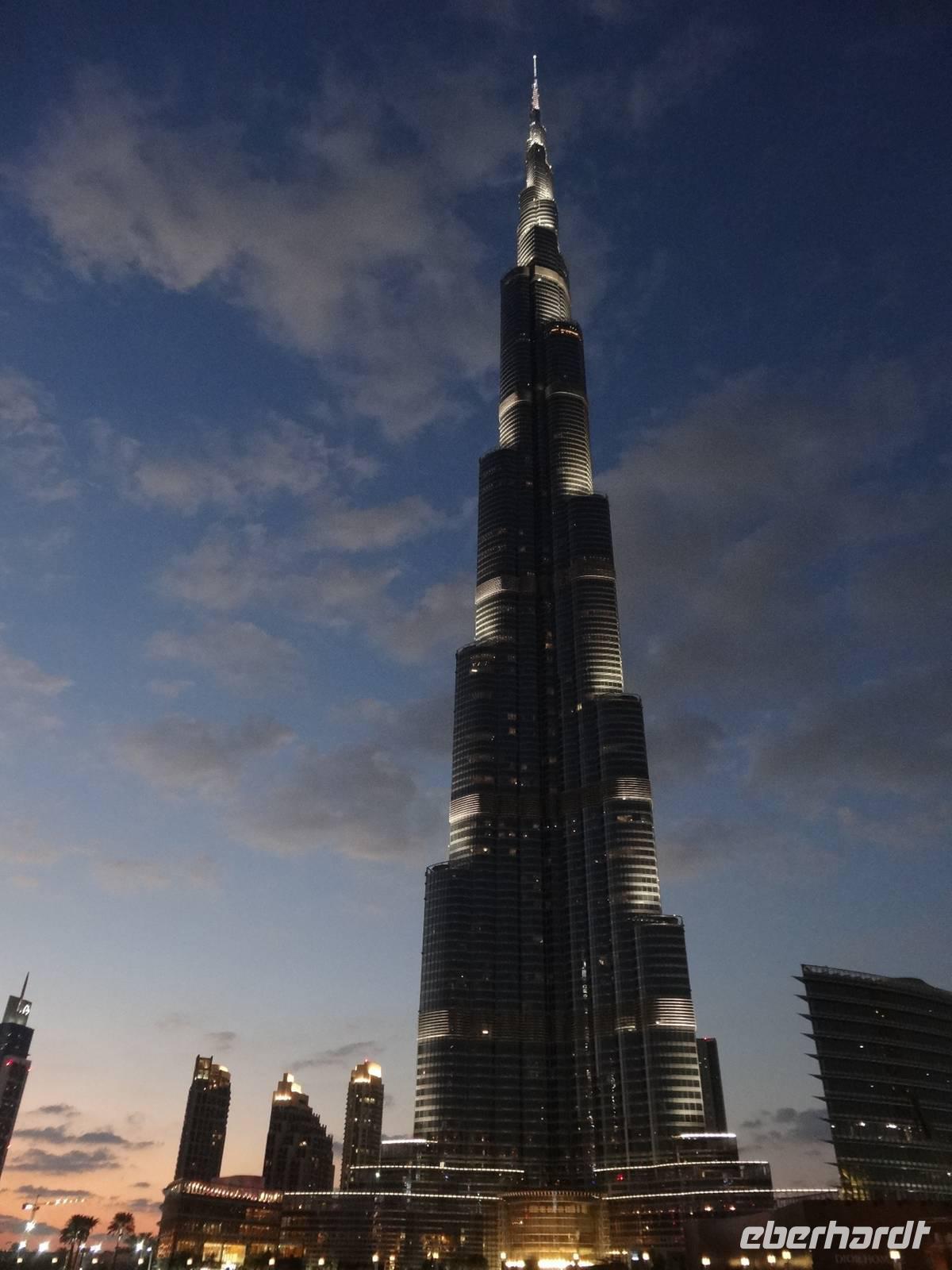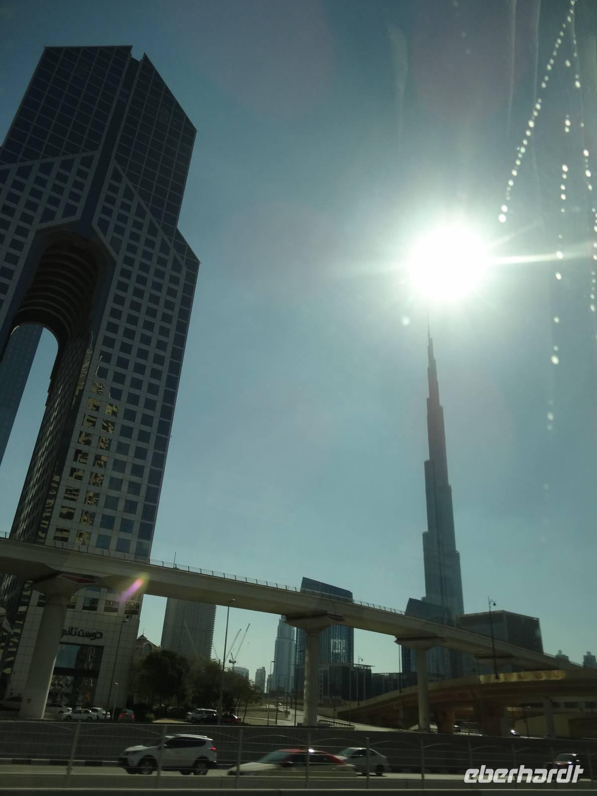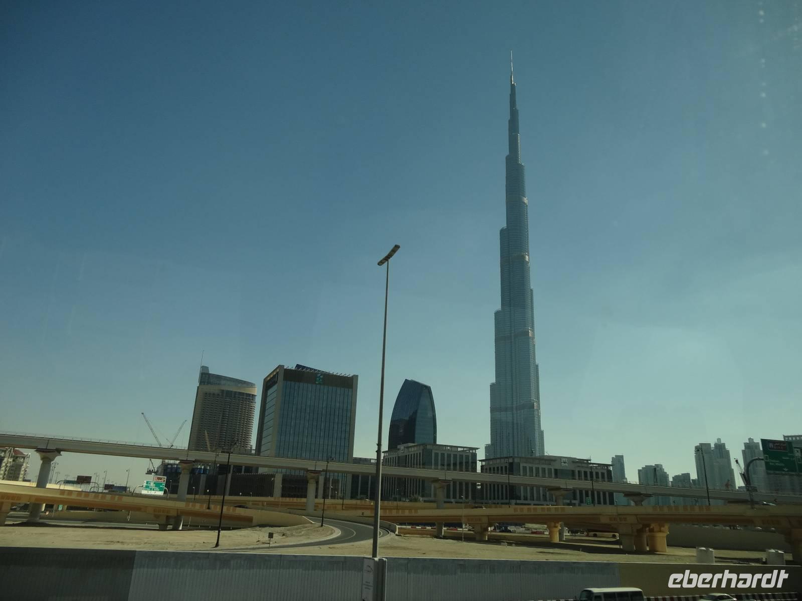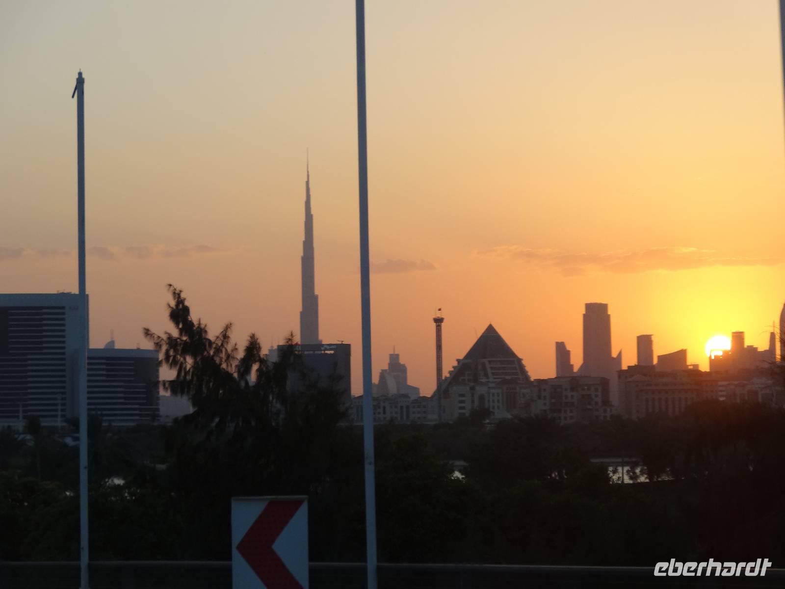 Am Mittag trifft sich die gesamte Eberhardt-Gruppe dann am Abfluggate in Frankfurt und wir treten gemeinsam den sechsstündigen Flug nach Dubai an. Mit drei Stunden Zeitverschiebung landen wir gegen 22.30 Uhr Ortszeit in der Glitzermetropole. Bereits bei der Landung sieht man das höchste Gebäude der Welt - den Burj Khalifa - von oben funkeln. Er lässt all die umliegenden Wolkenkratzer im Vergleich winzig erscheinen, obgleich diese es mit Sicherheit nicht sind!