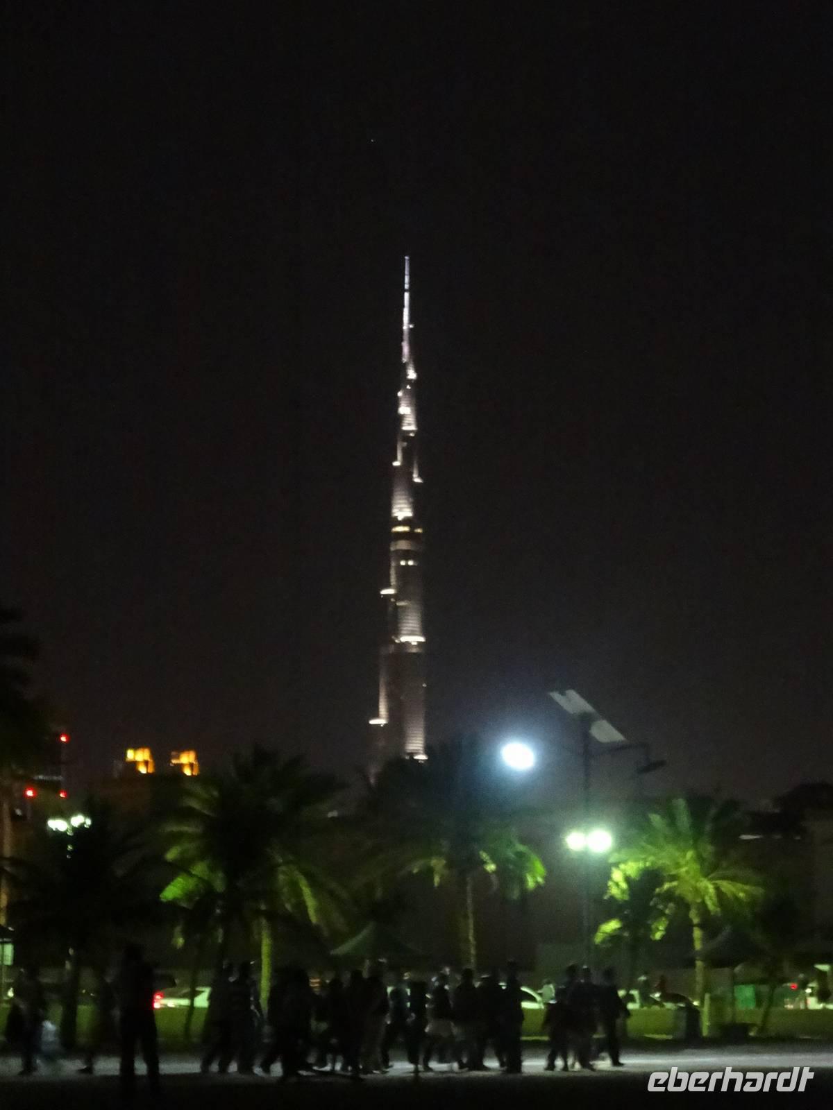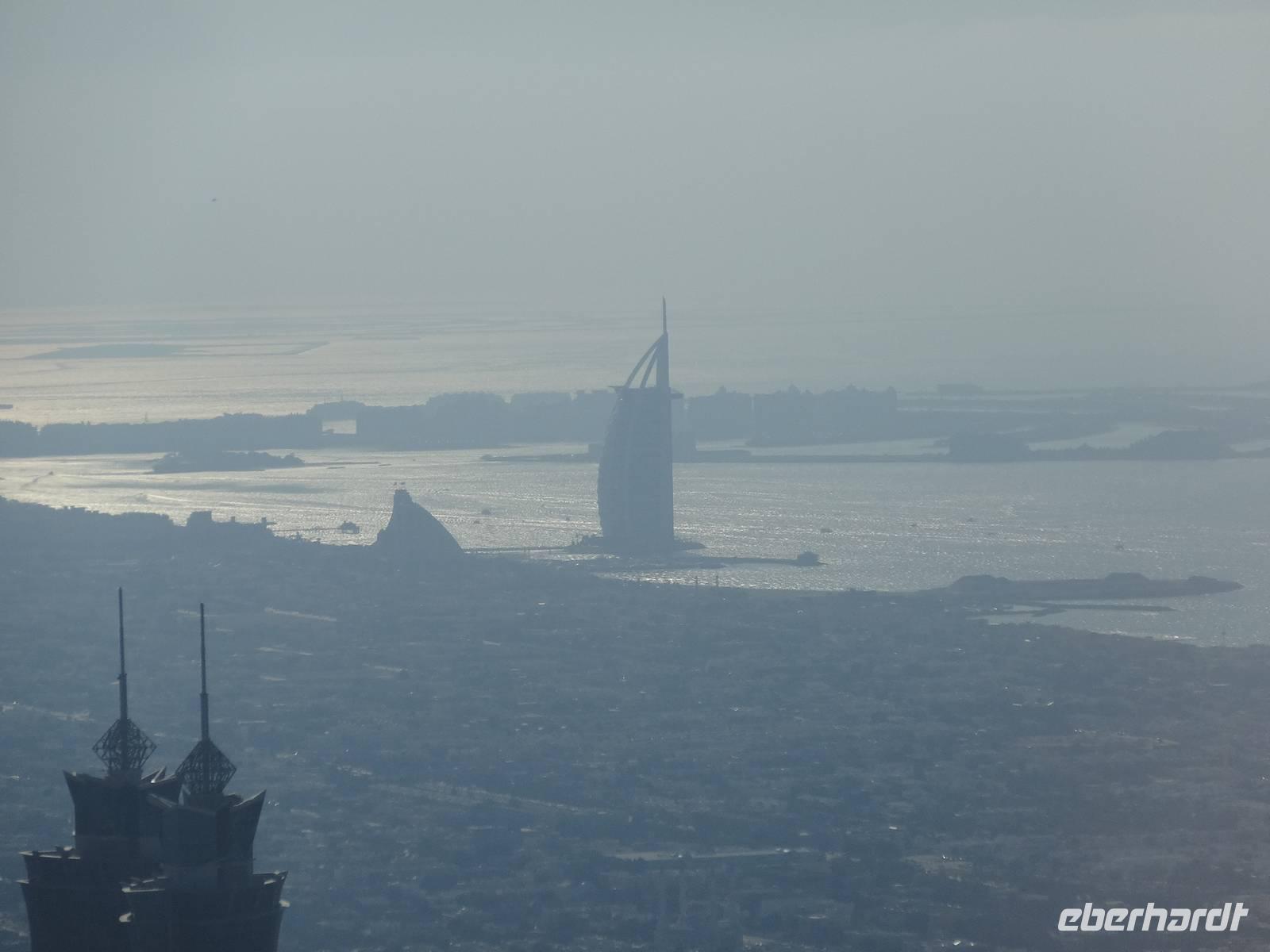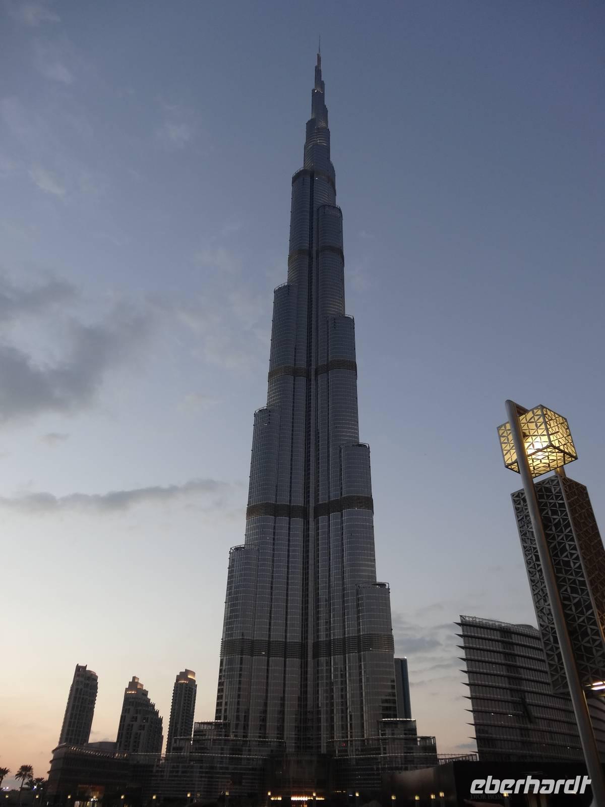 Am Mittag trifft sich die gesamte Eberhardt-Gruppe dann am Abfluggate in Frankfurt und wir treten gemeinsam den sechsstündigen Flug nach Dubai an. Mit drei Stunden Zeitverschiebung landen wir gegen 22.30 Uhr Ortszeit in der Glitzermetropole. Bereits bei der Landung sieht man das höchste Gebäude der Welt - den Burj Khalifa - von oben funkeln. Er lässt all die umliegenden Wolkenkratzer im Vergleich winzig erscheinen, obgleich diese es mit Sicherheit nicht sind!