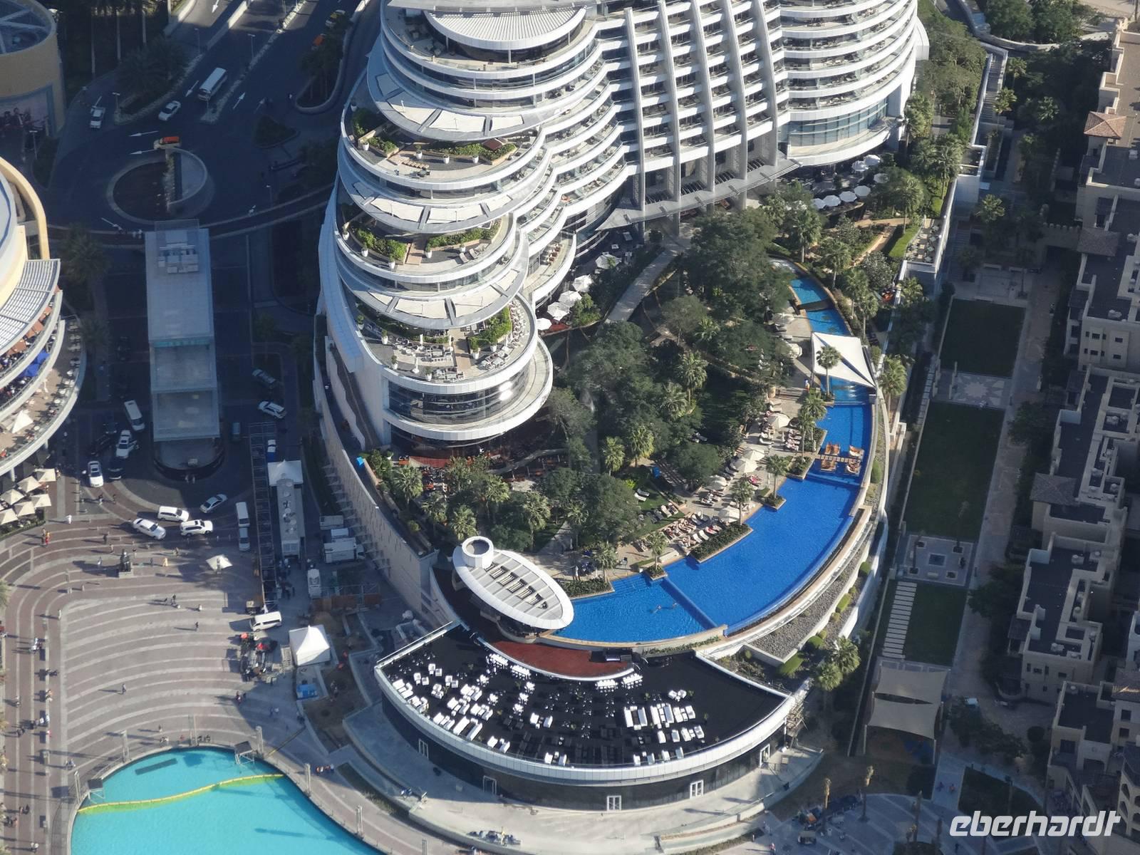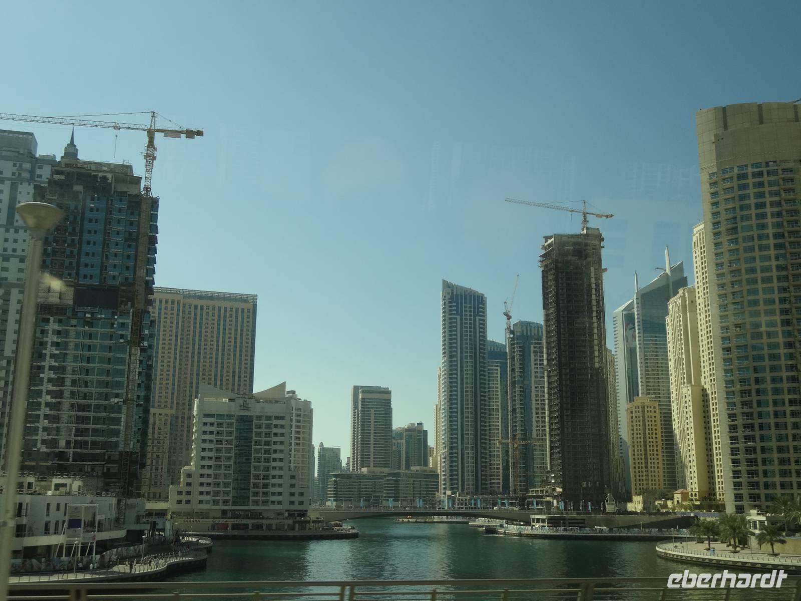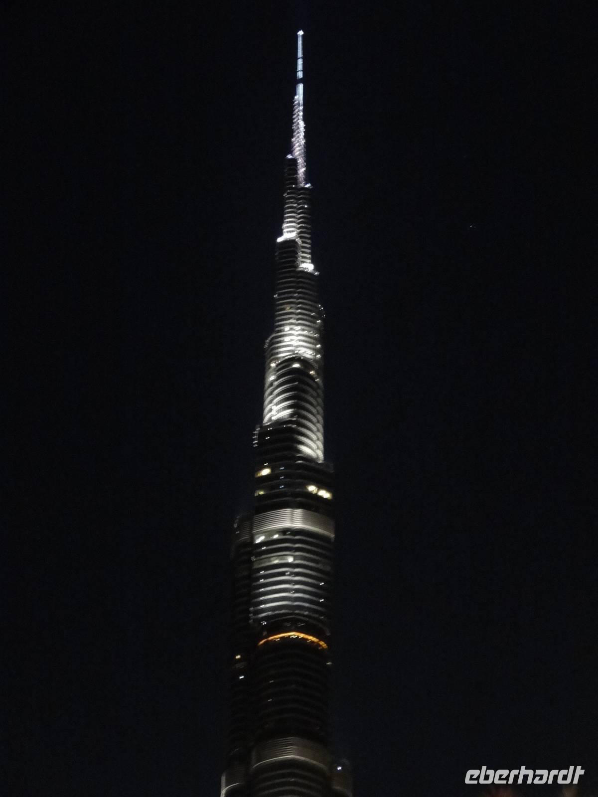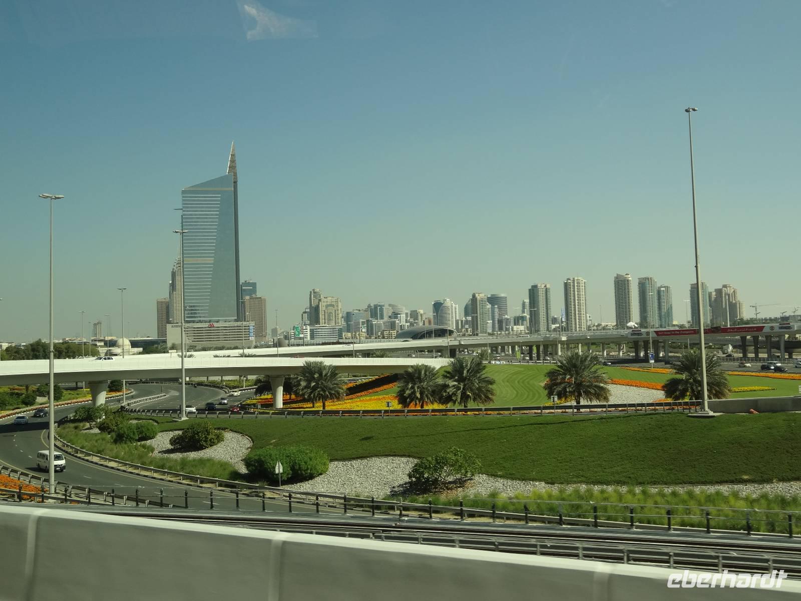 Am Mittag trifft sich die gesamte Eberhardt-Gruppe dann am Abfluggate in Frankfurt und wir treten gemeinsam den sechsstündigen Flug nach Dubai an. Mit drei Stunden Zeitverschiebung landen wir gegen 22.30 Uhr Ortszeit in der Glitzermetropole. Bereits bei der Landung sieht man das höchste Gebäude der Welt - den Burj Khalifa - von oben funkeln. Er lässt all die umliegenden Wolkenkratzer im Vergleich winzig erscheinen, obgleich diese es mit Sicherheit nicht sind!