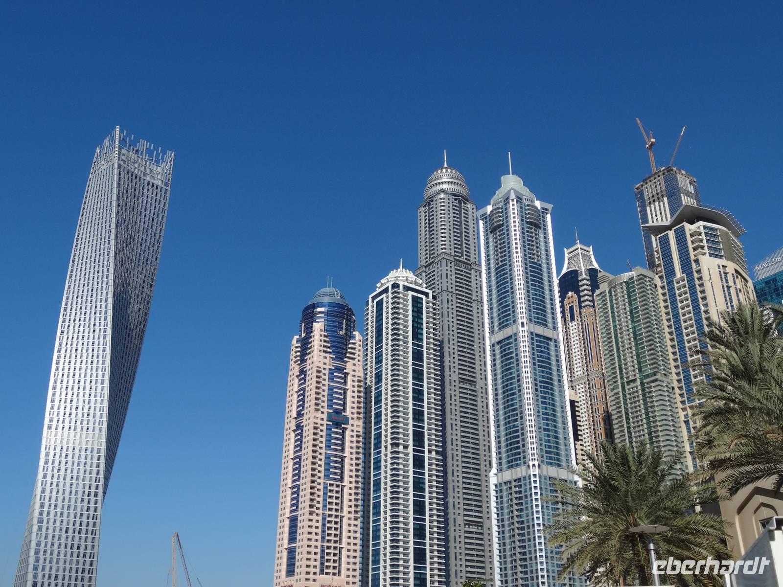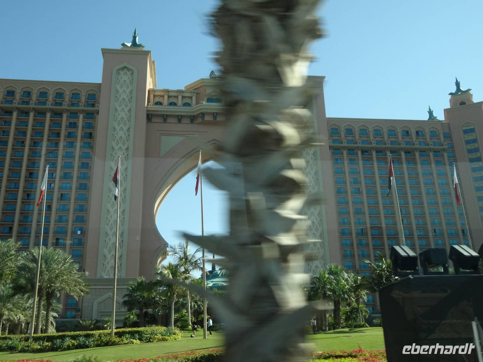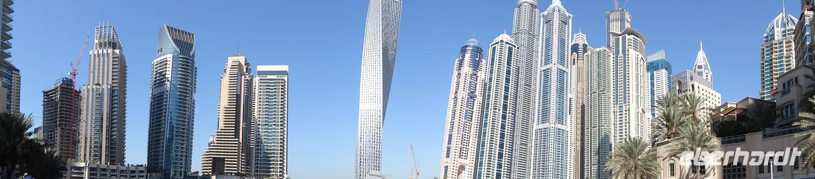 Anschließend beginnen wir mit unserer Stadtrundfahrt durch das funkelnde, neue Dubai. Wir fahren zunächst entlang der berühmten Sheik Zayed Road, an der sich die Wolkenkratzer wie an einer Perlenkette aufreihen, bis zum modernsten Stadtteil nach Dubai Marina. Wir machen einen Fotostopp am kleinen Yachthafen und bestaunen auch hier die tollen Hochhäuser mit dem „gedrehten" Infinity Tower. Spektakulär spiegelt sich die Skyline der etwa 200 neu erbauten beziehungsweise noch im Bau befindlichen Appartement-Hochhäuser und Wolkenkratzer im Wasser der künstlich geschaffenen Lagune. Weiter führt der Ausflug auf die 8 Kilometer lange, von 13 Palmenwedeln gesäumte Palmeninsel Jumeirah, die 2008 mit der Fertigstellung des spektakulären Themenhotel Atlantis eröffnet wurde.