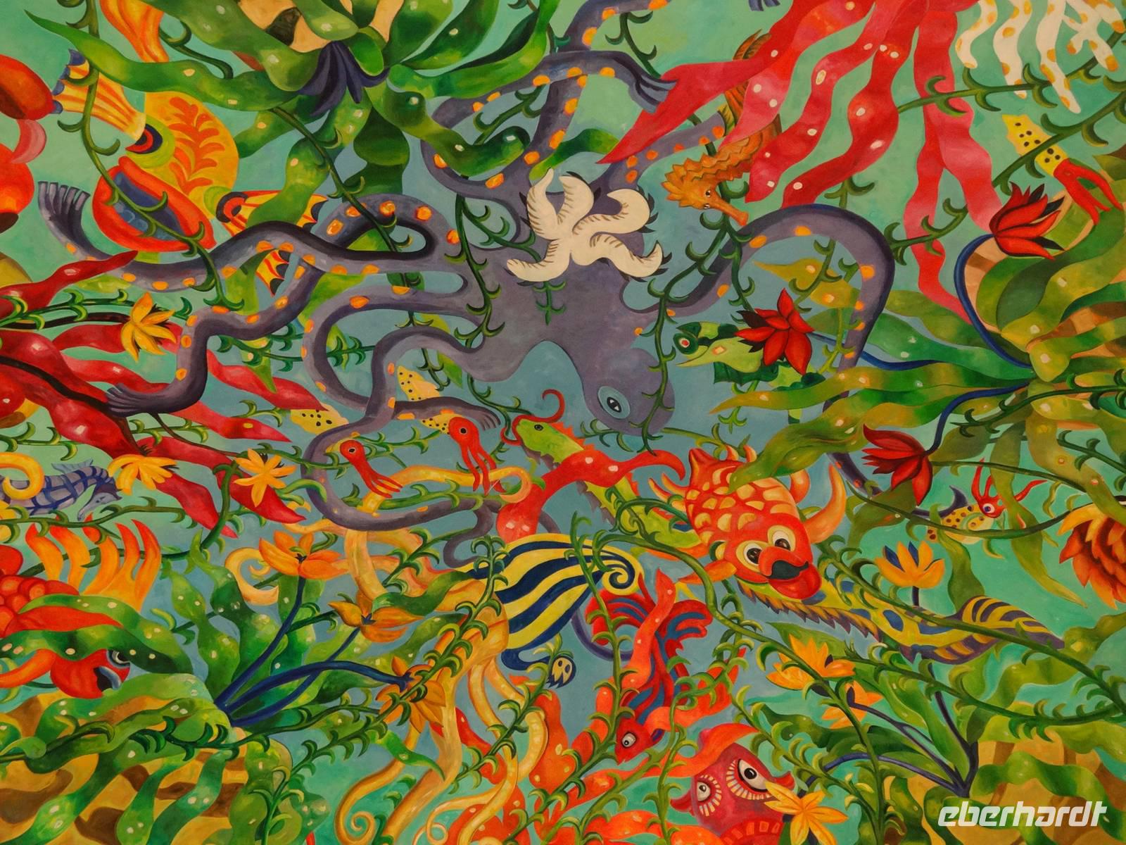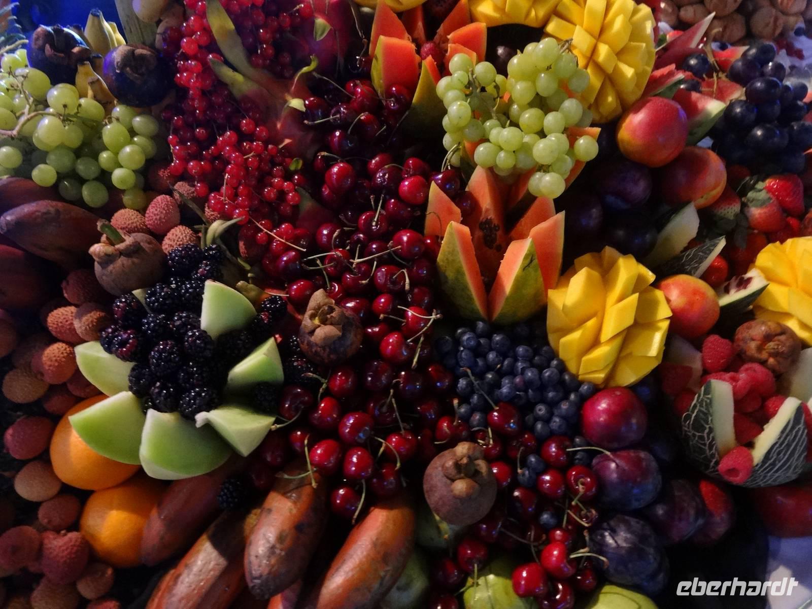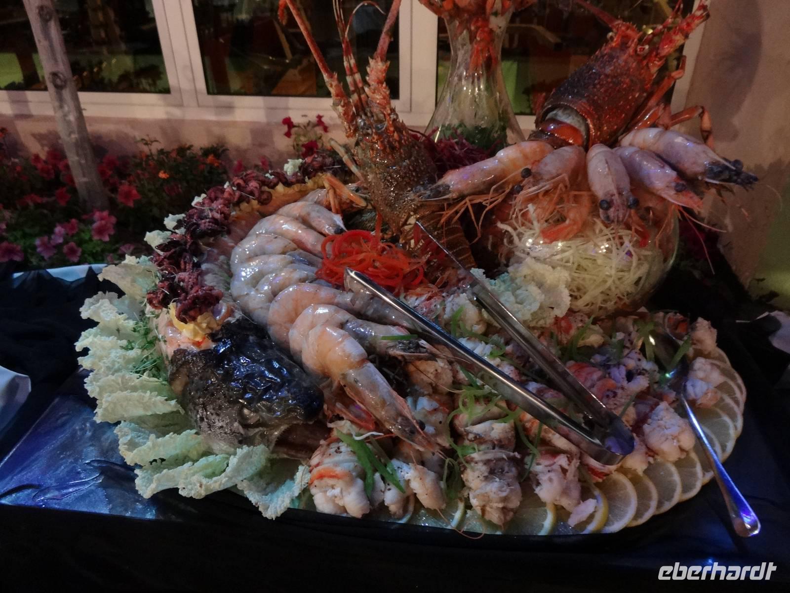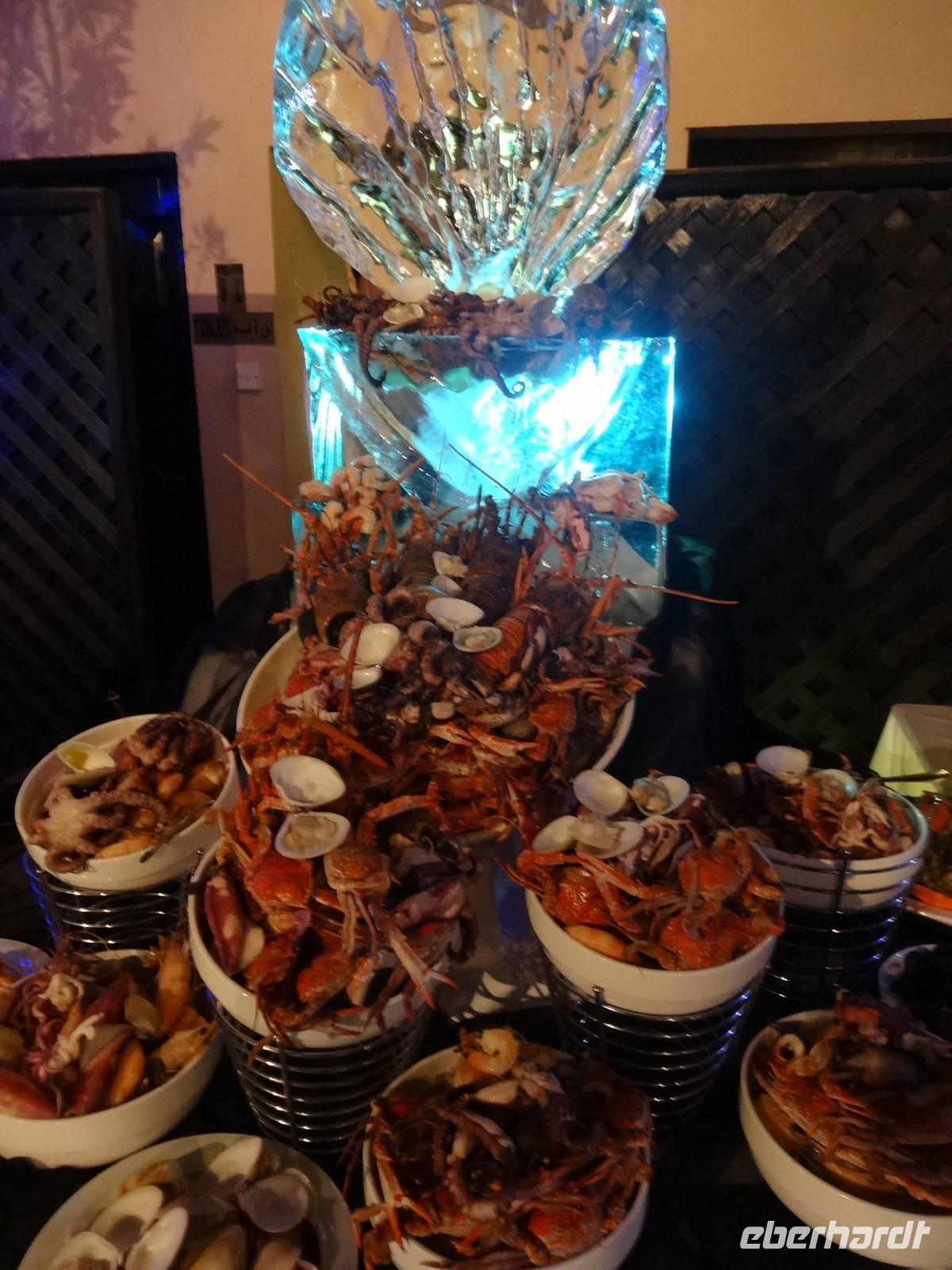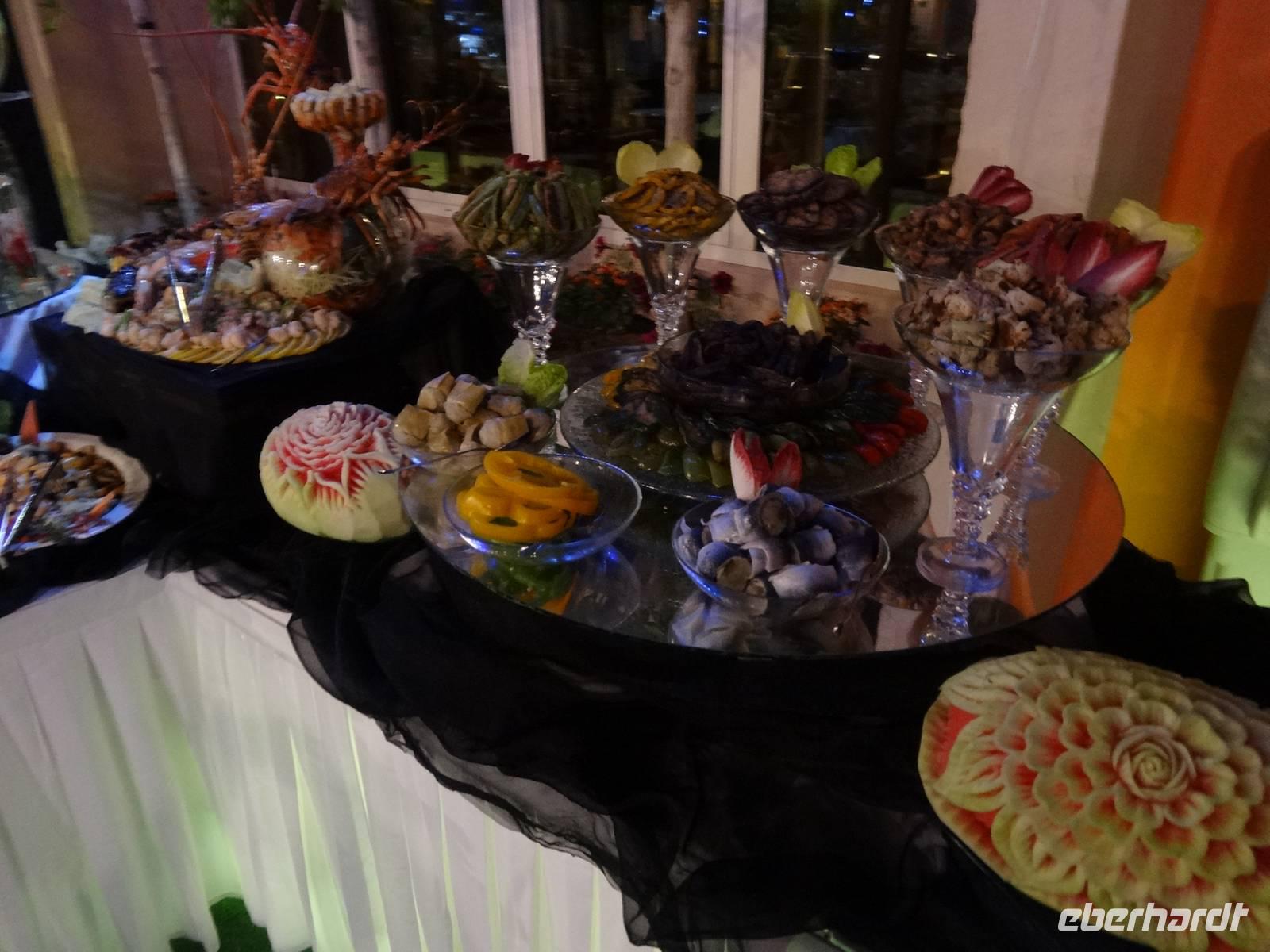 Gegen 19 Uhr treffen wir uns in schicker, zum Teil glitzernder Silvester-Garderobe im Ballsaal und werden mit einem Glas Sekt begrüßt. Später erwartet uns ein tolles Silvester-Buffet, was dem im Burj Al Arab wirklich nahe kommt! Leckere Fisch- und Sushi-Variationen sowie ein riesiger Obstturm sind sehr dekorativ zwischen Eisskulpturen aufgetürmt.