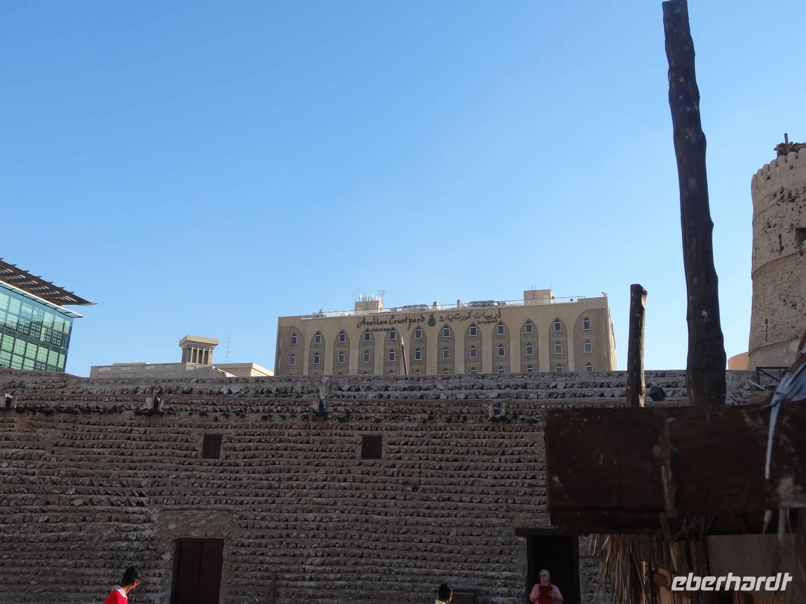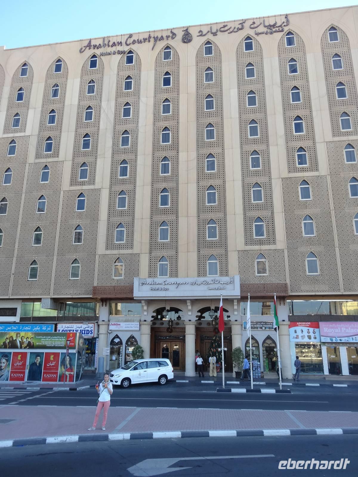Wir haben nur einen kurzen Fahrtweg zu unserem Hotel „Arabian Courtyard", welches sich im Stadtteil Bur Dubai in unmittelbarer Nähe des Creeks und gleich neben dem Dubai-Museum befindet. Der Check-In geht schnell und die meisten Gäste gehen direkt ins Bett nach diesem langen Tag und um fit in den nächsten Tag zu starten. Wer gern noch ein Bier trinken oder eine Kleinigkeit essen möchte, kann das im hoteleigenen „English Pub" gern tun!