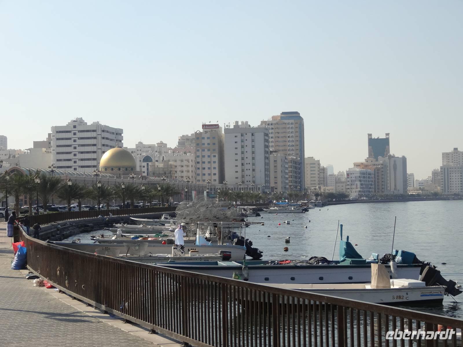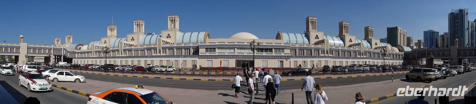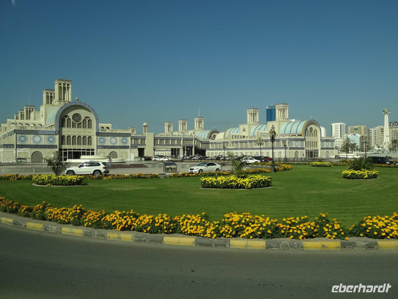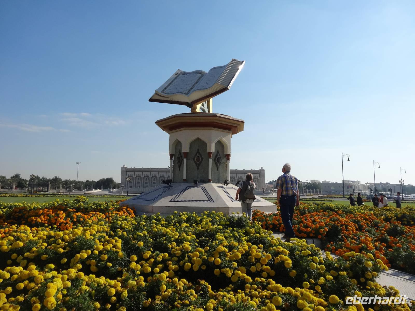 Nach dem Frühstück starten wir unseren Ausflug ins Nachbaremirat Sharjah. 25 Kilometer Fahrt liegen vor uns bis ins „Emirat der aufgehenden Sonne". Sharjah ist trotz seiner Nähe zu Dubai ganz anders: strenger, bodenständiger, traditioneller. Weniger pompöse Wolkenkratzer, mehr Kunst, Kultur und Bildung. Dies verdankt das Emirat seinem Scheich Dr. Sultan-bin-Mohammed Al Quasimi, dessen Architekturstudium sich in vielen Bauwerken Sharjas widerspiegelt. Er ist der Kunstinteressierte und Intellektuelle von den sieben Emiren. Hier im drittgrößten Emirat ist auch der Konsum von Alkohol strengstens verboten und die zünftigen Kleidervorschriften sind strenger, wohl begründet durch die enge Freundschaft des Scheichs zum König von Saudi Arabien. Zunächst halten wir am berühmten, liebevoll gestalteten Kreisverkehr „Cultural Square", in dessen Mitte ein riesiger aufgeschlagener Koran im Lesegestellt thront. Wir fahren entlang der Strandpromenade und besuchen den Souk Al-Masqoof, den alten Souk im Herzen der alten Stadt. Hier findet man laut Anja die preiswerteste Auswahl an Pashmina-Schals und das wilde Handeln nimmt hier seinen Lauf ...