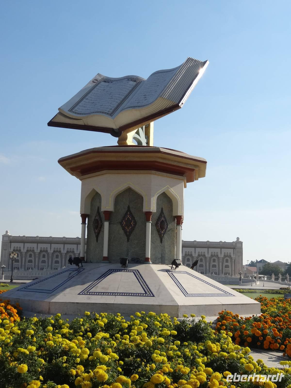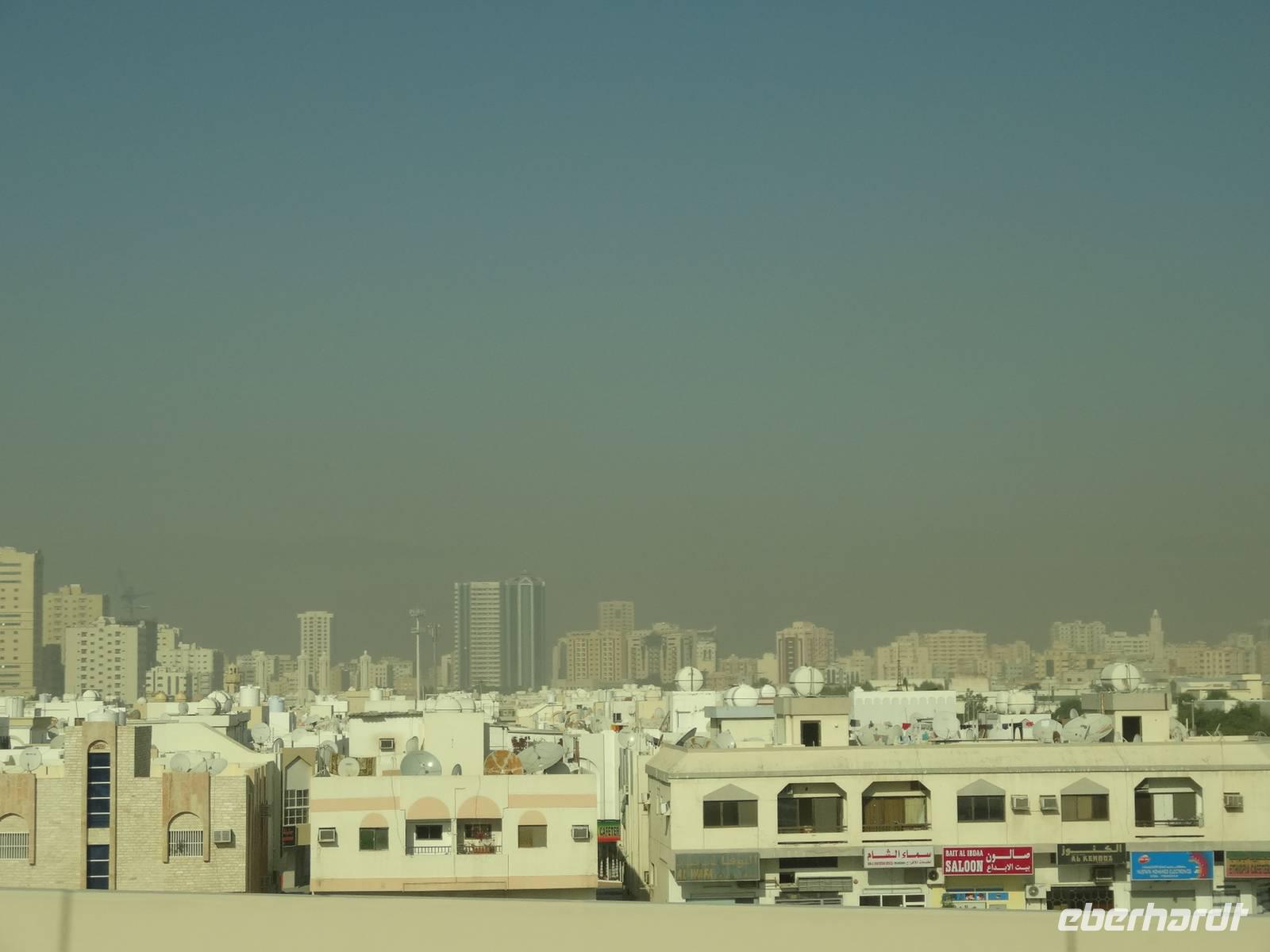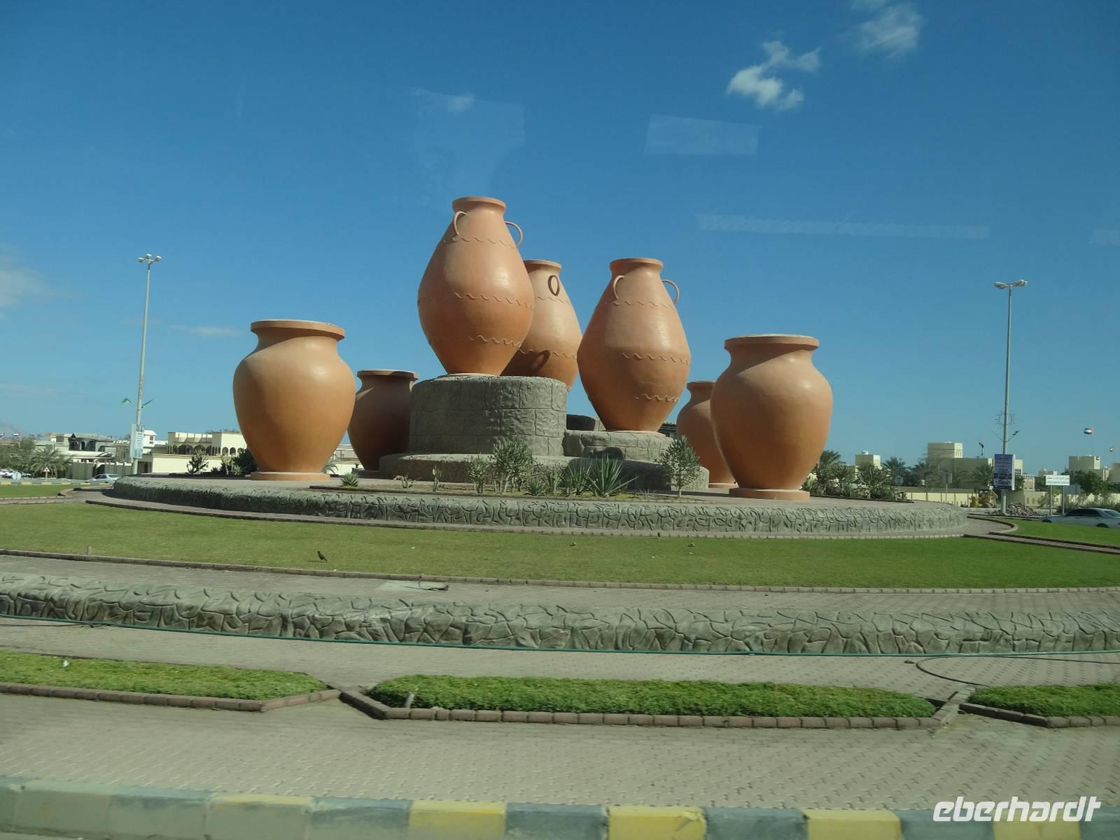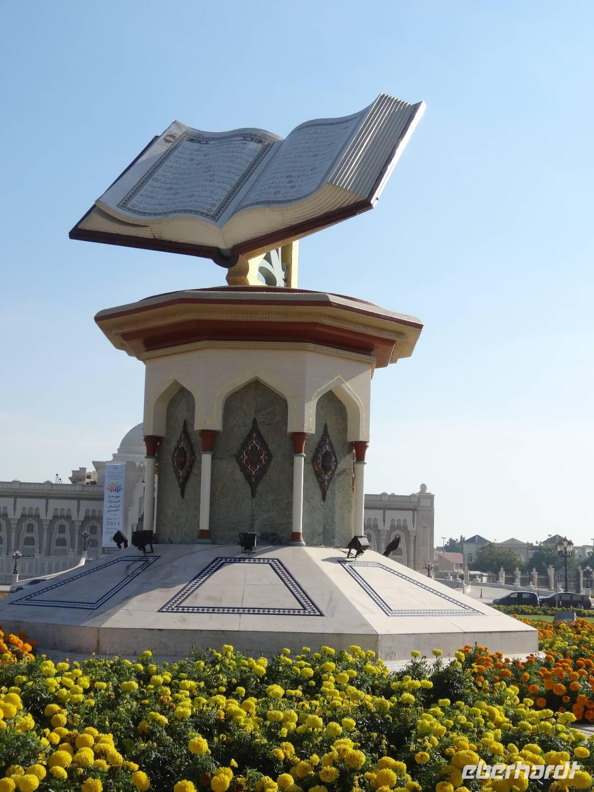 Nach dem Frühstück starten wir unseren Ausflug ins Nachbaremirat Sharjah. 25 Kilometer Fahrt liegen vor uns bis ins „Emirat der aufgehenden Sonne". Sharjah ist trotz seiner Nähe zu Dubai ganz anders: strenger, bodenständiger, traditioneller. Weniger pompöse Wolkenkratzer, mehr Kunst, Kultur und Bildung. Dies verdankt das Emirat seinem Scheich Dr. Sultan-bin-Mohammed Al Quasimi, dessen Architekturstudium sich in vielen Bauwerken Sharjas widerspiegelt. Er ist der Kunstinteressierte und Intellektuelle von den sieben Emiren. Hier im drittgrößten Emirat ist auch der Konsum von Alkohol strengstens verboten und die zünftigen Kleidervorschriften sind strenger, wohl begründet durch die enge Freundschaft des Scheichs zum König von Saudi Arabien. Zunächst halten wir am berühmten, liebevoll gestalteten Kreisverkehr „Cultural Square", in dessen Mitte ein riesiger aufgeschlagener Koran im Lesegestellt thront. Wir fahren entlang der Strandpromenade und besuchen den Souk Al-Masqoof, den alten Souk im Herzen der alten Stadt. Hier findet man laut Anja die preiswerteste Auswahl an Pashmina-Schals und das wilde Handeln nimmt hier seinen Lauf ...
