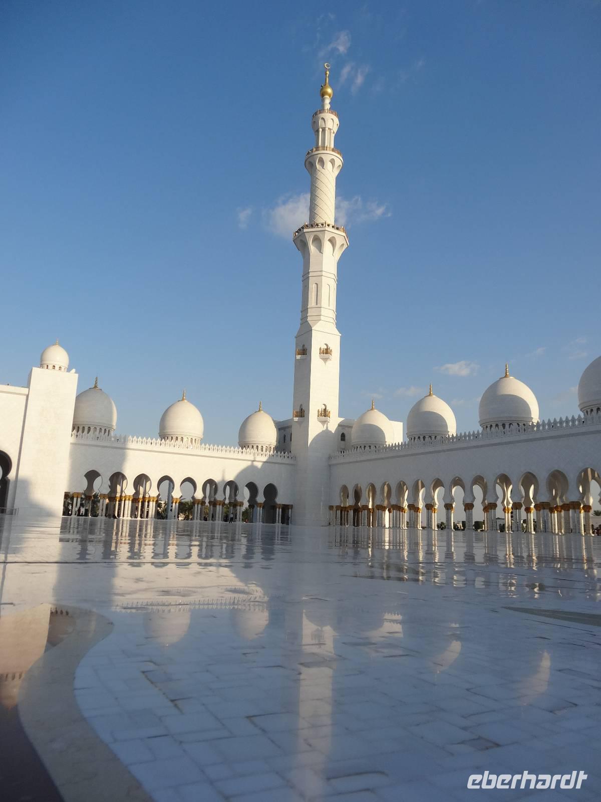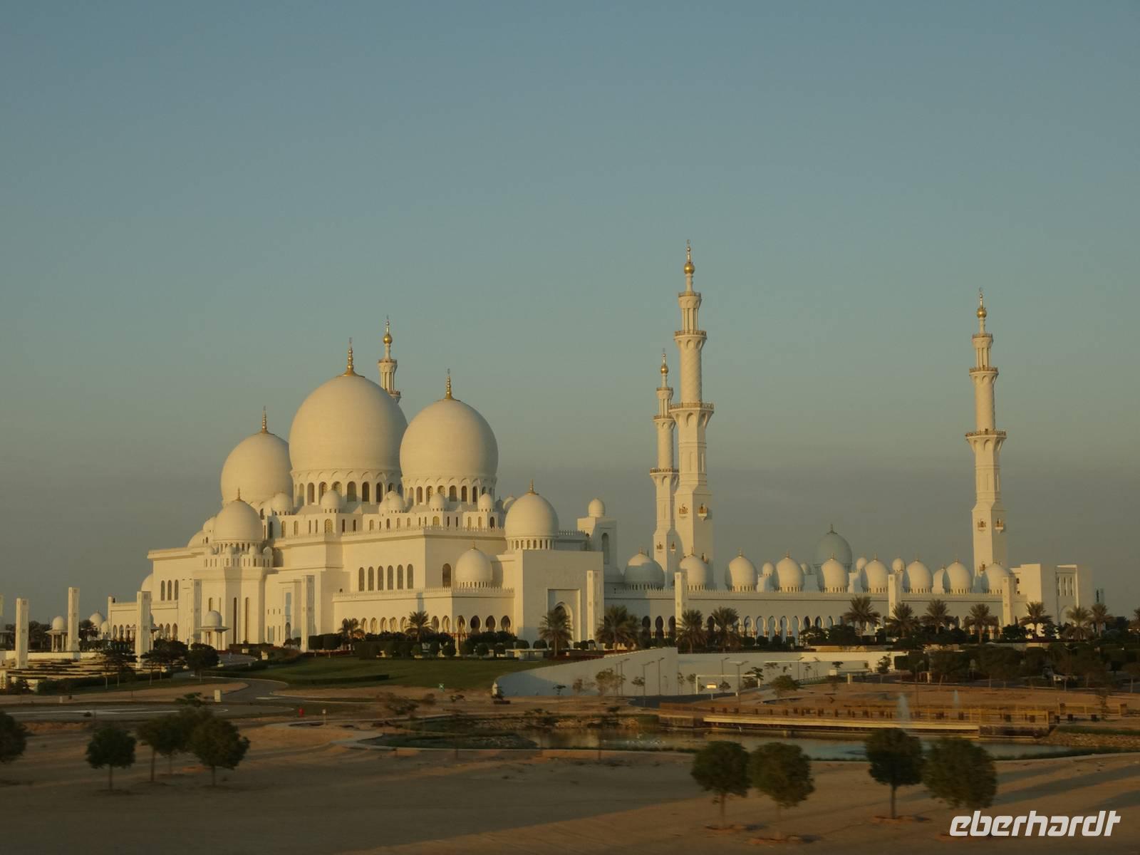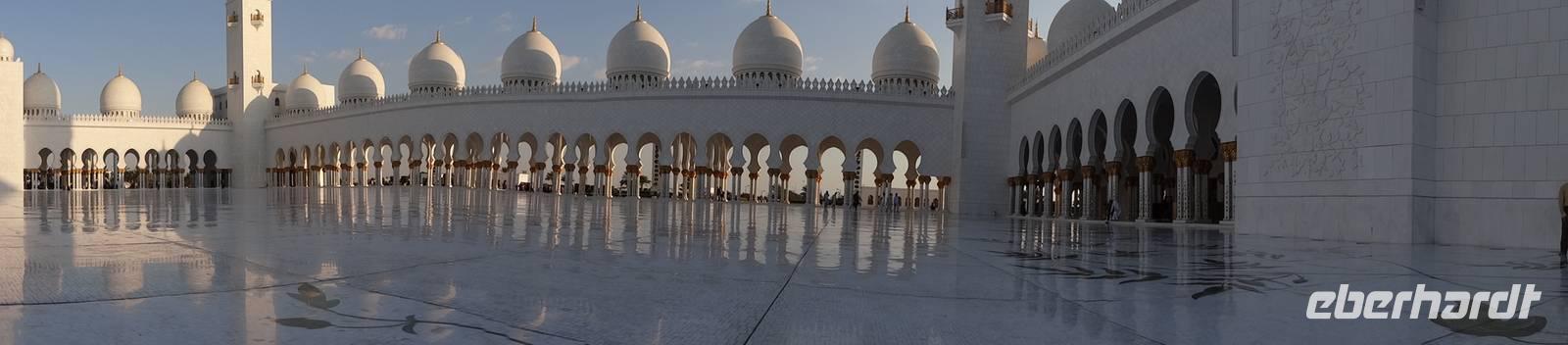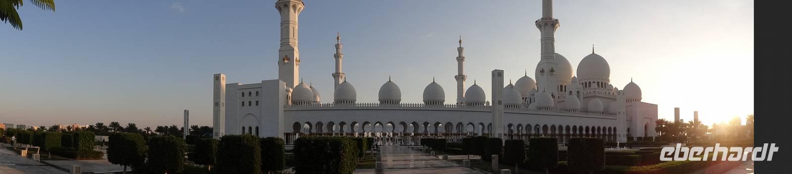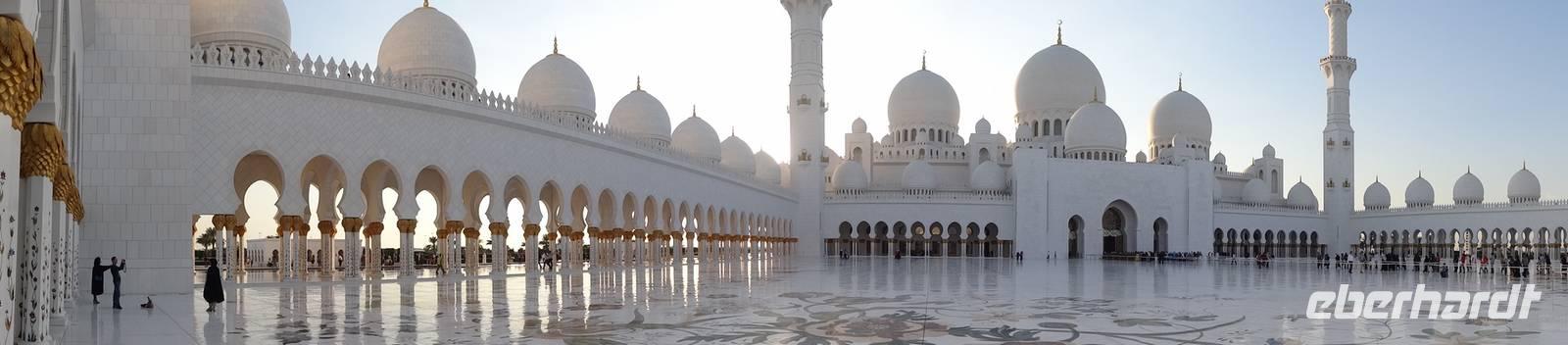Abschließender Höhepunkt ist der Besuch der Großen Moschee Sheikh Zayed. Das aus schneeweißem Marmor erbaute und erst 2008 eröffnete Gotteshaus ist die drittgrößte Moschee der Welt. Die Moschee ist eindrucksvoll mit Intarsien aus Halbedelsteinen, dem größten handgeknüpften iranischen Teppich der Welt und fantastischen Kronleuchtern aus Gold und Swarowski-Kristallen gestaltet. Zu hohen muslimischen Feiertagen finden hier bis zu 40.000 Menschen Platz.