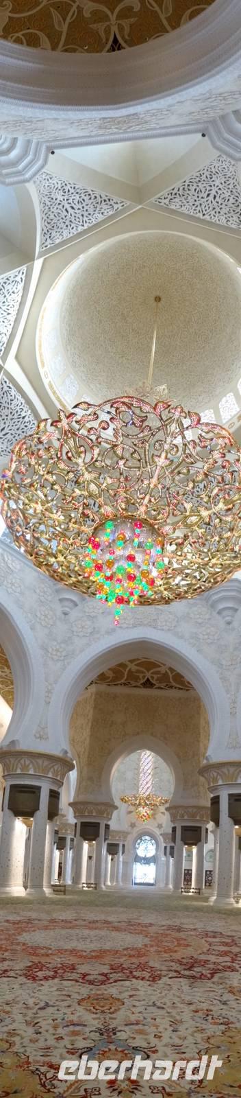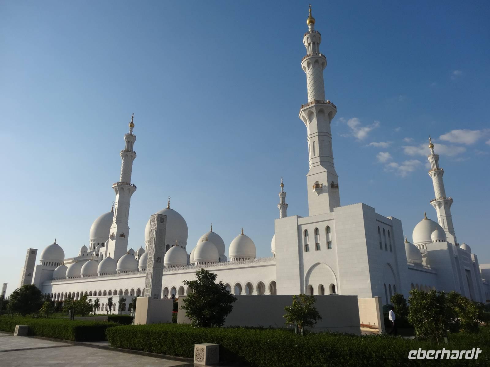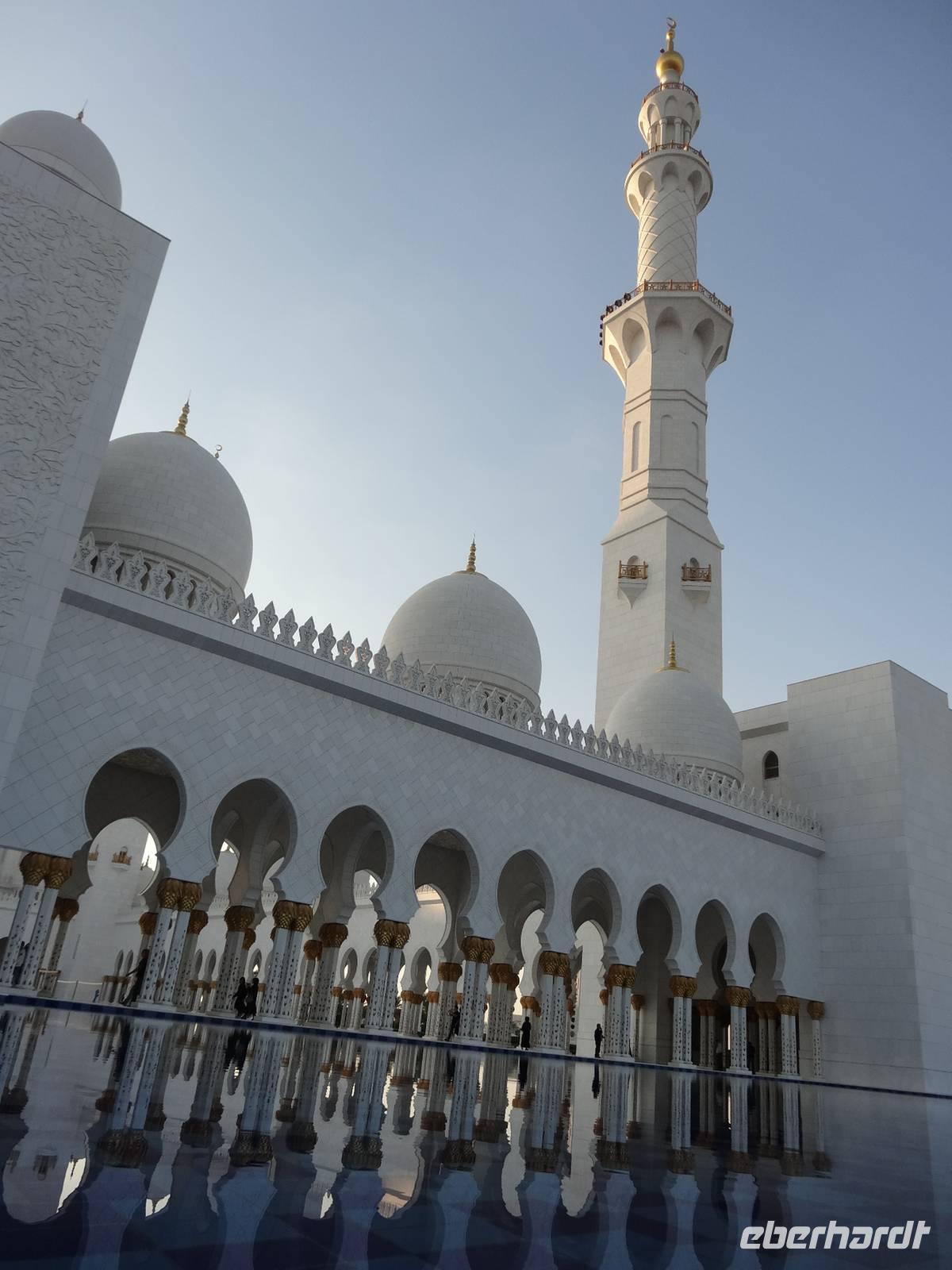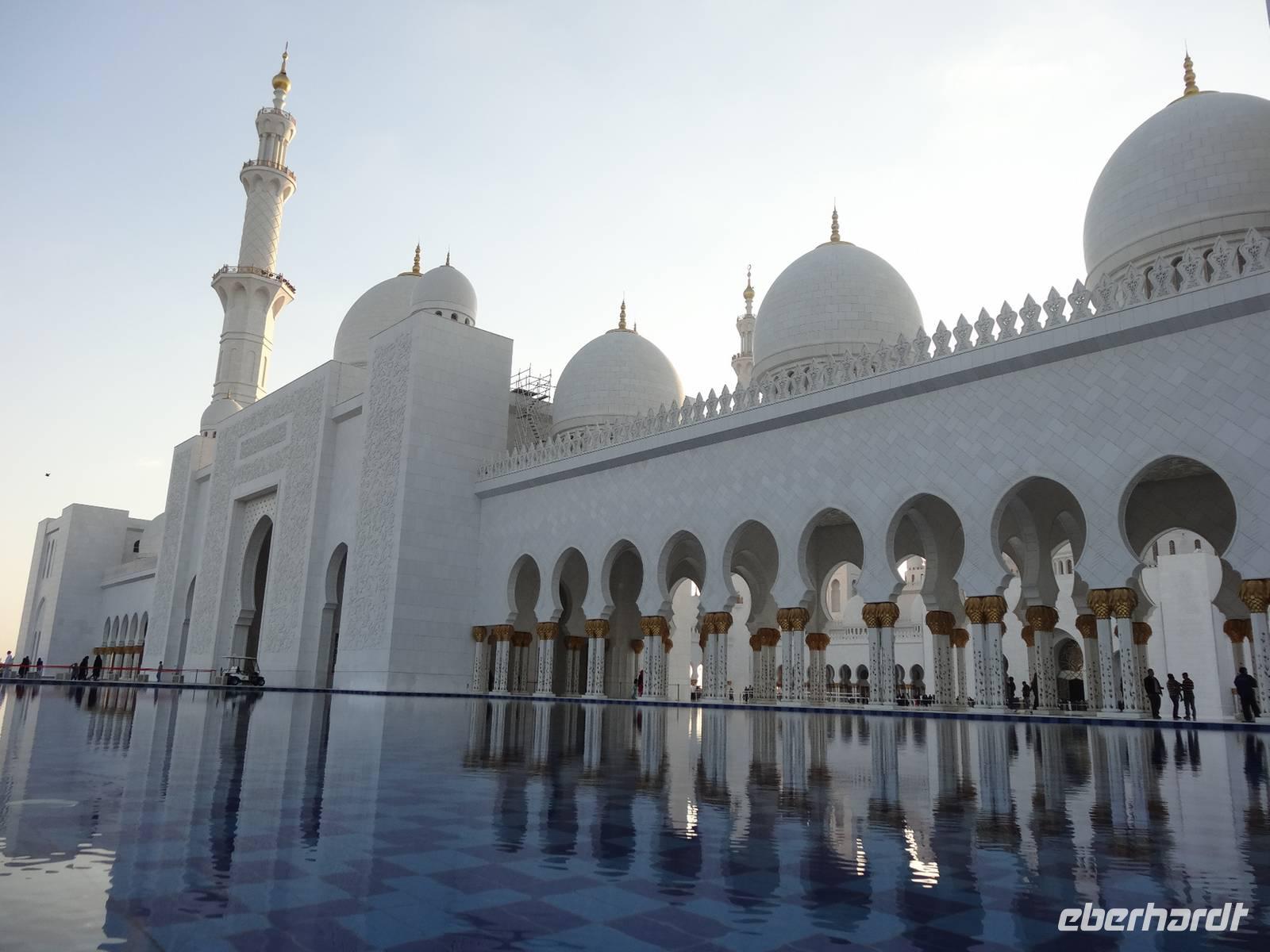 Abschließender Höhepunkt ist der Besuch der Großen Moschee Sheikh Zayed. Das aus schneeweißem Marmor erbaute und erst 2008 eröffnete Gotteshaus ist die drittgrößte Moschee der Welt. Die Moschee ist eindrucksvoll mit Intarsien aus Halbedelsteinen, dem größten handgeknüpften iranischen Teppich der Welt und fantastischen Kronleuchtern aus Gold und Swarowski-Kristallen gestaltet. Zu hohen muslimischen Feiertagen finden hier bis zu 40.000 Menschen Platz.