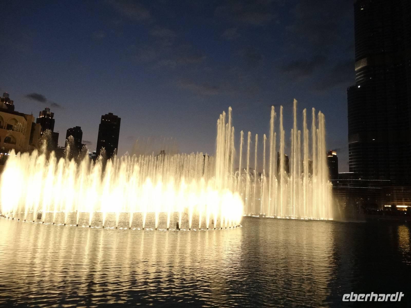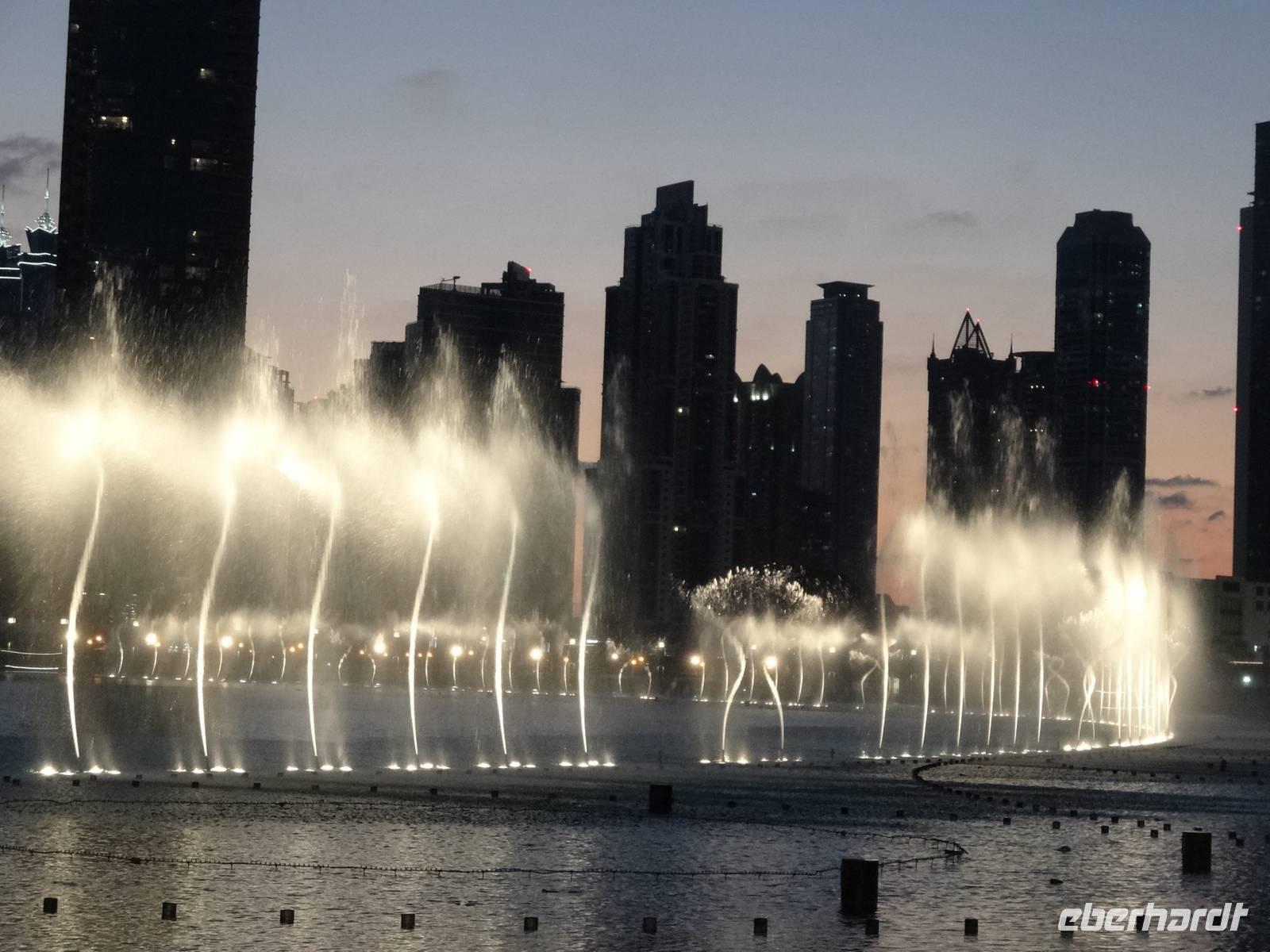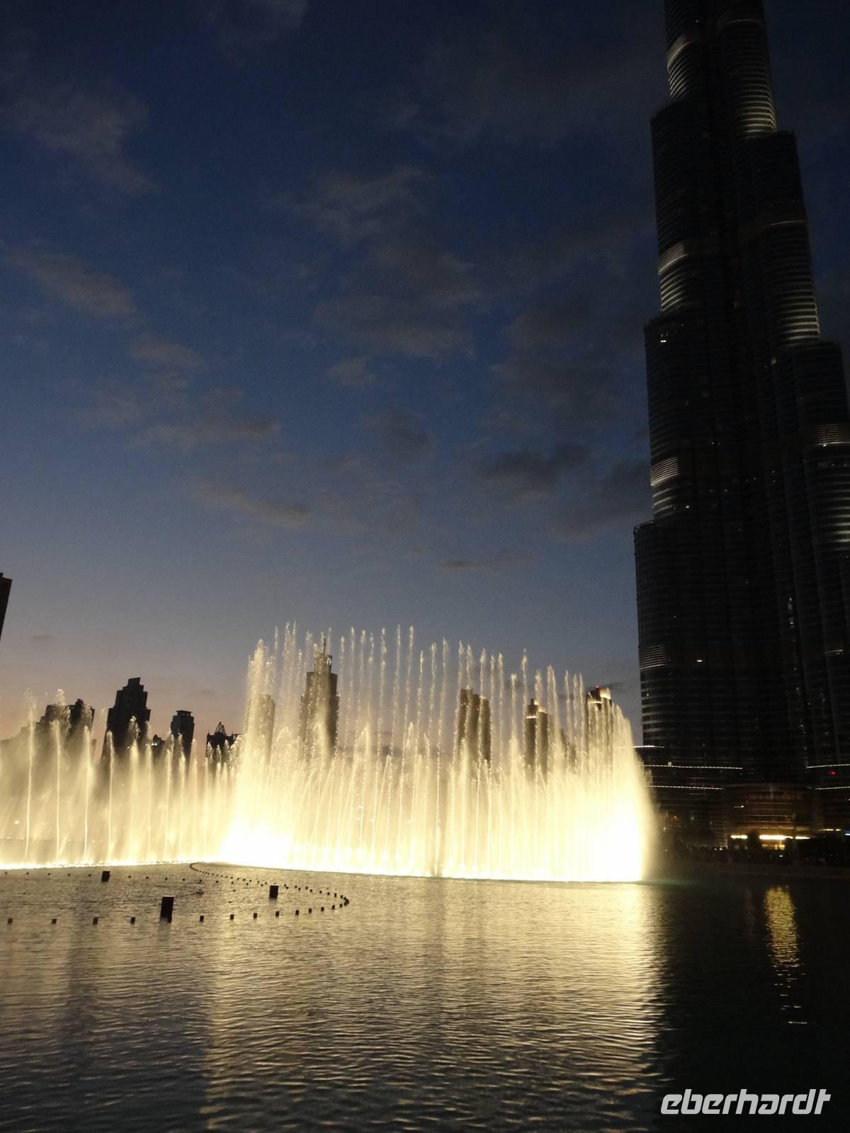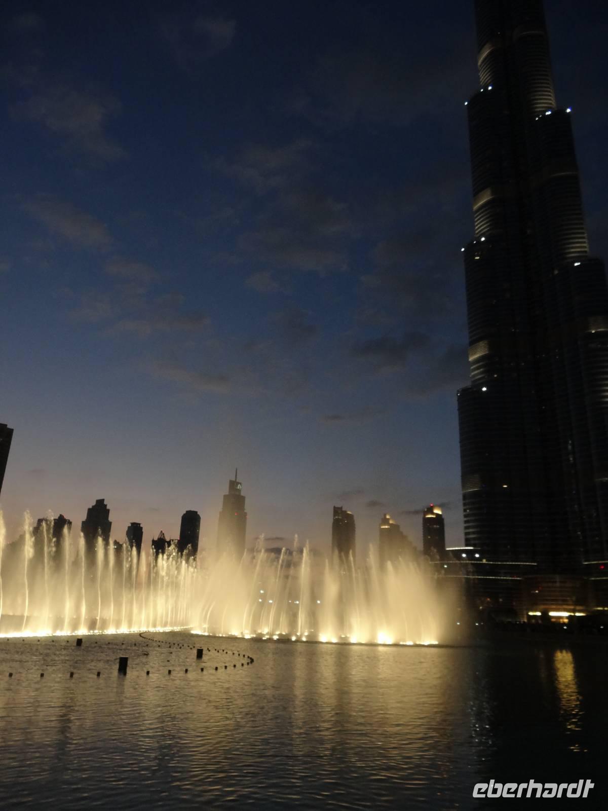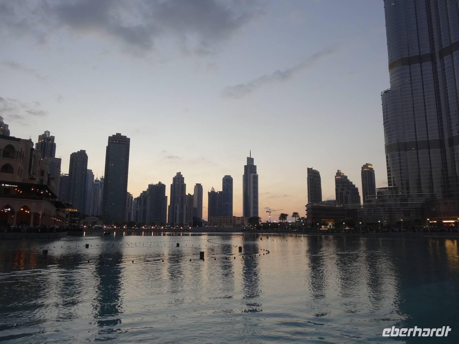 Pünktlich 18 Uhr erleben wir noch die ersten Wasserspiele des Tages vor dem Burj Khalifa, die nun im 30 Minuten-Rhythmus stattfinden. Zu orientalischen Klängen beobachten wir die verschiedenen und weltweit höchsten Wasserfontänen, während die untergehende Sonne alles in ein mystisches Licht taucht ...