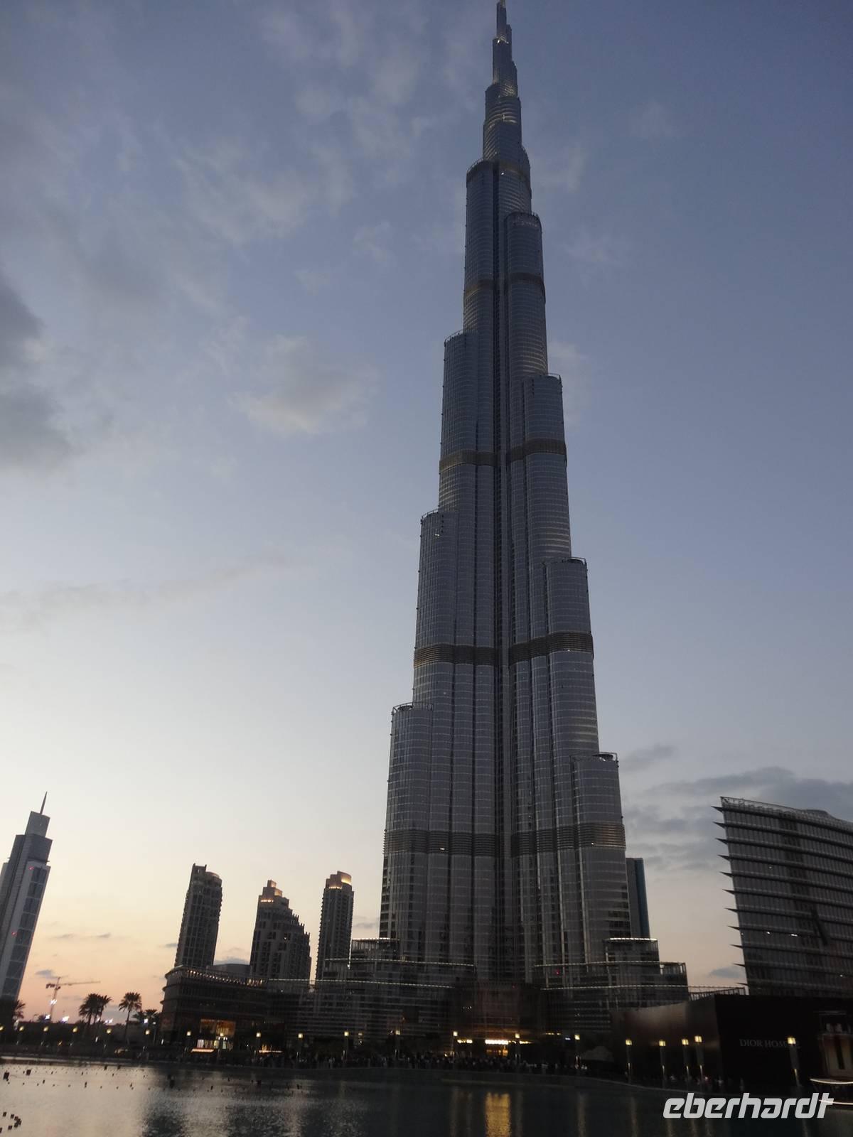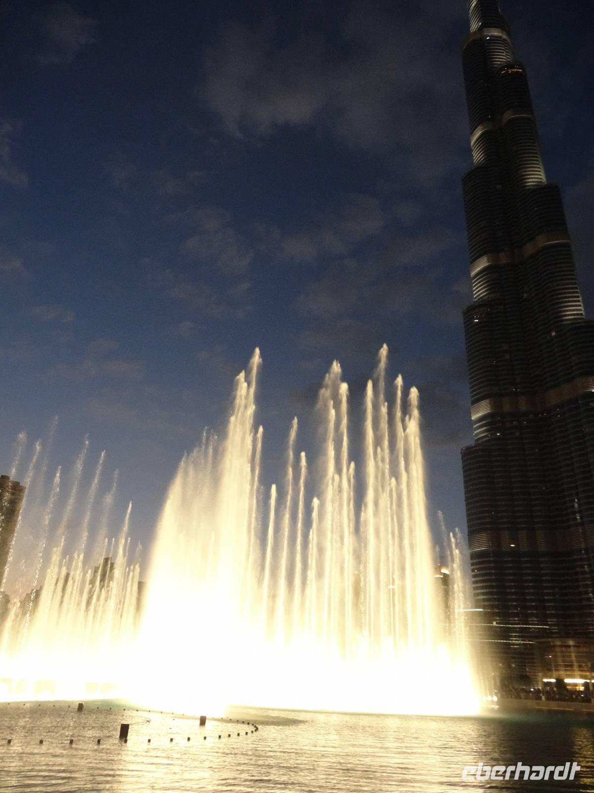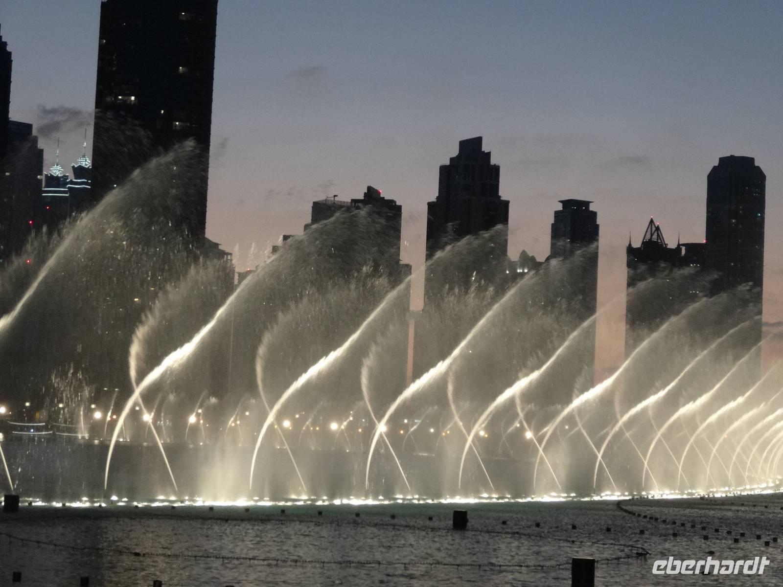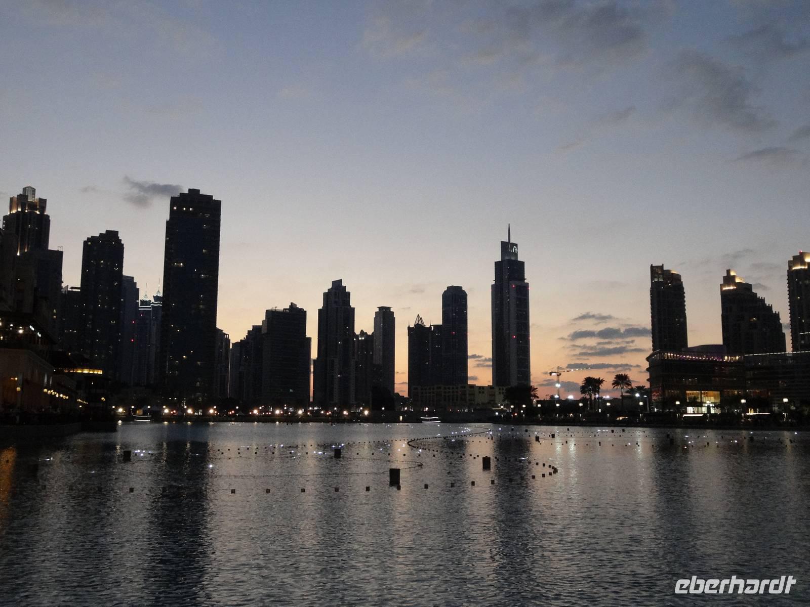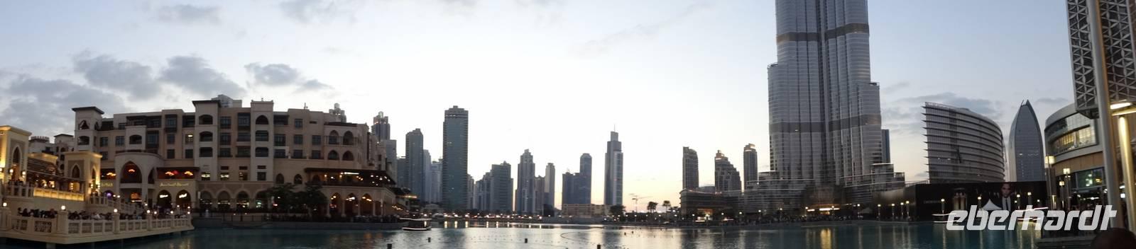 Pünktlich 18 Uhr erleben wir noch die ersten Wasserspiele des Tages vor dem Burj Khalifa, die nun im 30 Minuten-Rhythmus stattfinden. Zu orientalischen Klängen beobachten wir die verschiedenen und weltweit höchsten Wasserfontänen, während die untergehende Sonne alles in ein mystisches Licht taucht ...