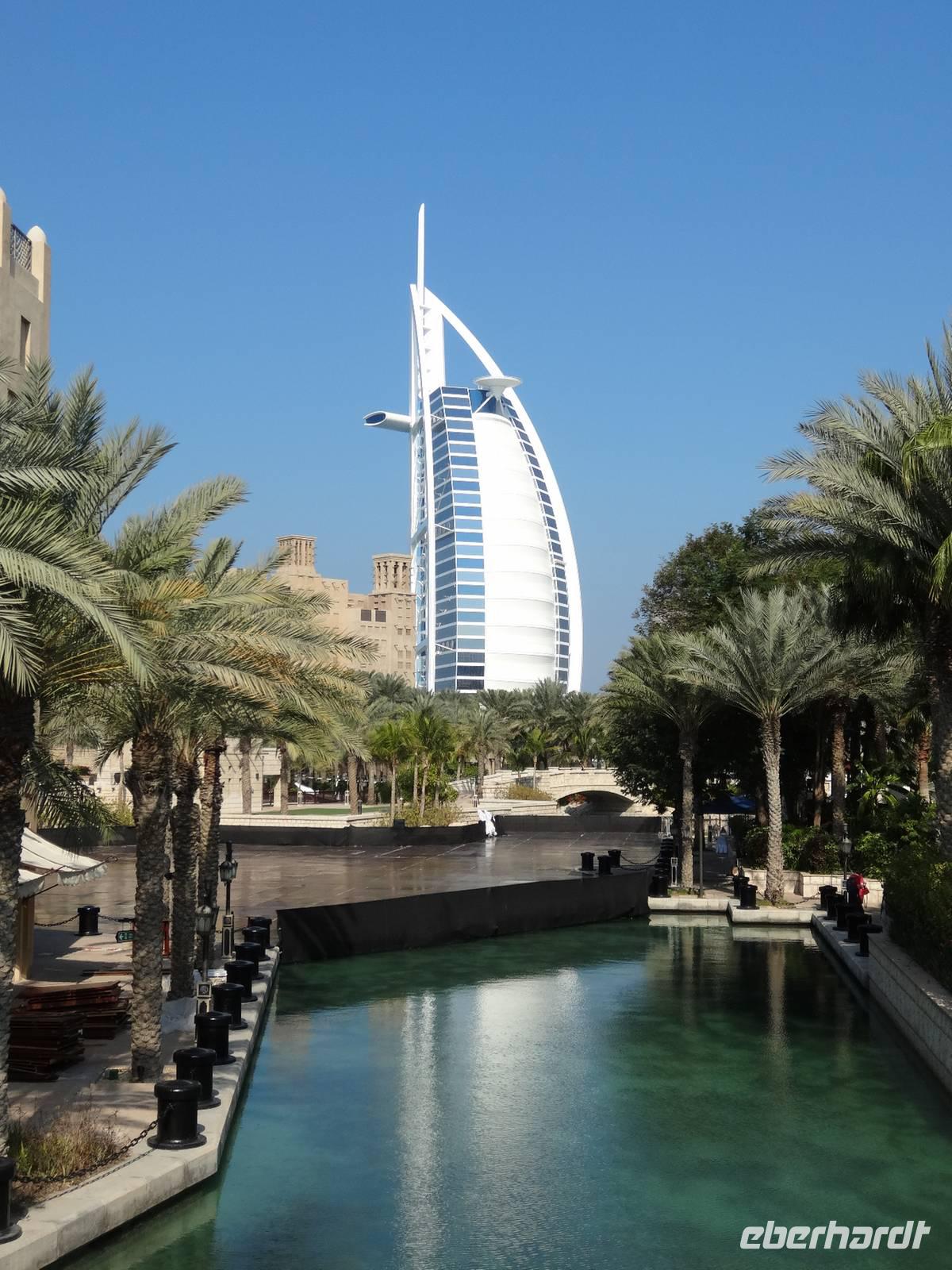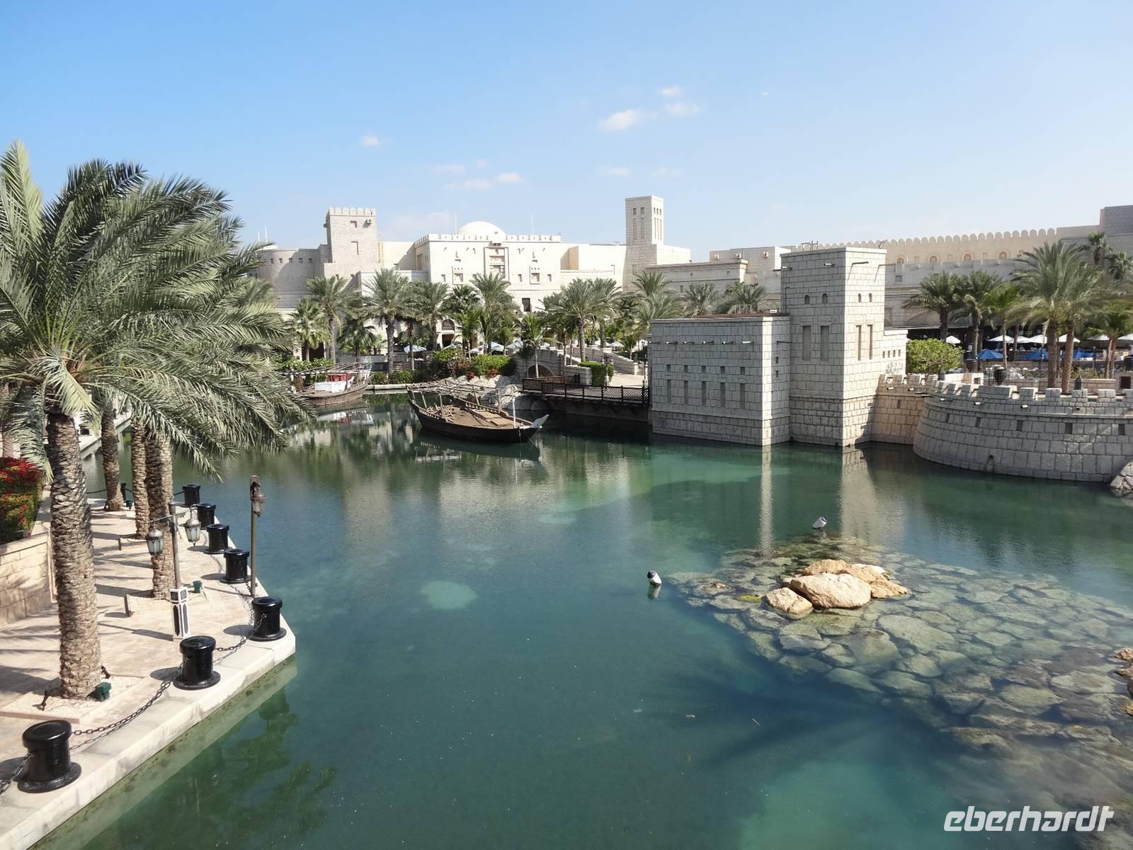 Unser Fahrer Baboo chauffiert uns in den Stadtteil Jumeirah und zunächst besuchen wir den Madinat Souk, der eingebettet in eine künstlich geschaffene Lagunenstadt im Stil alter orientalischer Paläste liegt und ein Stück Venedig nach Dubai zaubert. Wir nutzen den tollen Blick auf das benachbarte Burj Al Arab für ein Gruppenfoto und bummeln anschließend noch ein wenig durch die kleinen Kunsthandwerks- und Antiquitätengeschäfte.