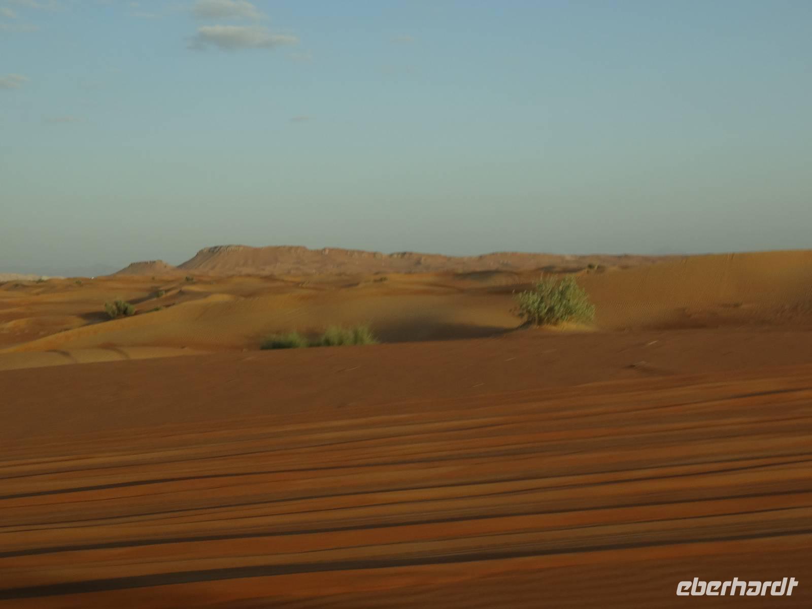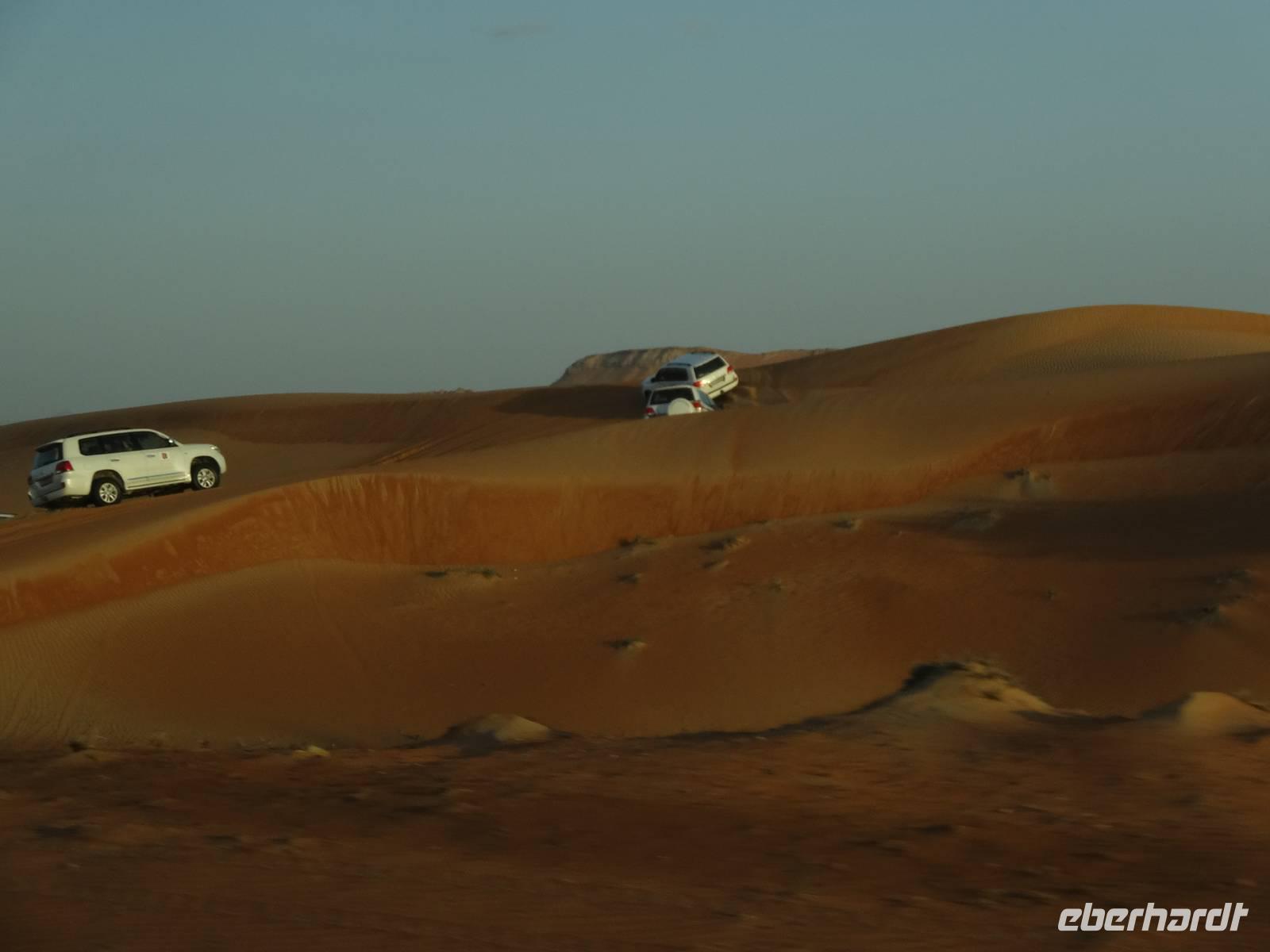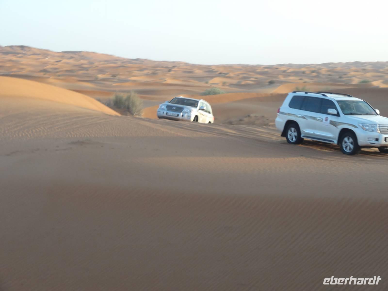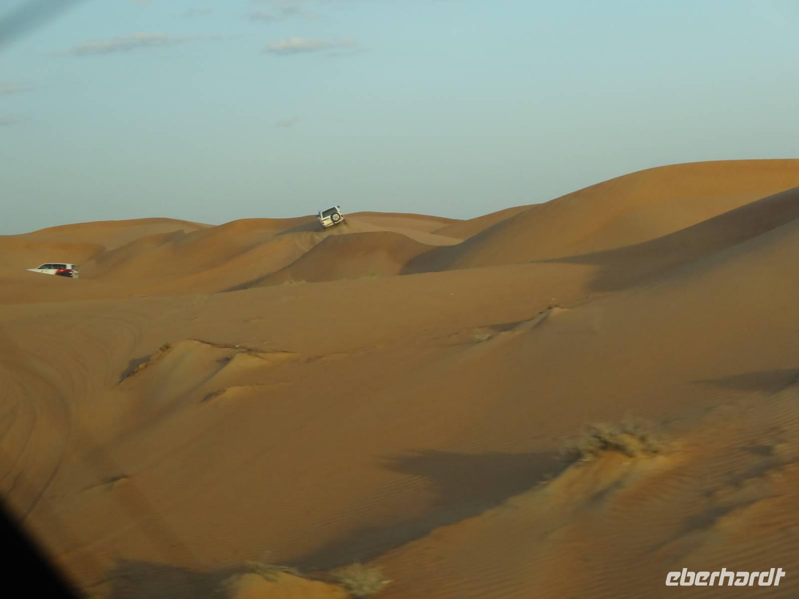 Eberhardt TRAVEL treibt seine Reisegäste nicht nur auf die Palme (Palm Jumeirah), sondern schickt sie auch noch in die Wüste . Deshalb stehen nach dem Mittagessen im Hotel schon unsere modernen Jeeps für die bevorstehende Wüstentour bereit. Die Fahrer haben die Autos bestens unter Kontrolle und zeigen uns natürlich ihre Fahrkünste. So lassen die mutigen Gruppen unter uns keine Düne aus und alle haben auf der Fahrt zum Wüstencamp jede Menge Spaß! Wir halten mitten in der Wüste und können dort einen herrlichen Sonnenuntergang erleben. Später im Wüstencamp sitzen wir gemütlich unter freiem Sternenhimmel, die Henna-Lady zaubert kleine Kunstwerke auf die Haut einiger Frauen und die Köche leisten auch sehr gute Arbeit. Das Barbecue schmeckt in dieser Atmosphäre natürlich umso besser! Ein Darwish-Tänzer und eine Bauchtänzerin runden den Abend bei orientalischen Klängen wunderschön ab. Mit den Jeeps geht es dann zurück nach Dubai und ins Hotel.