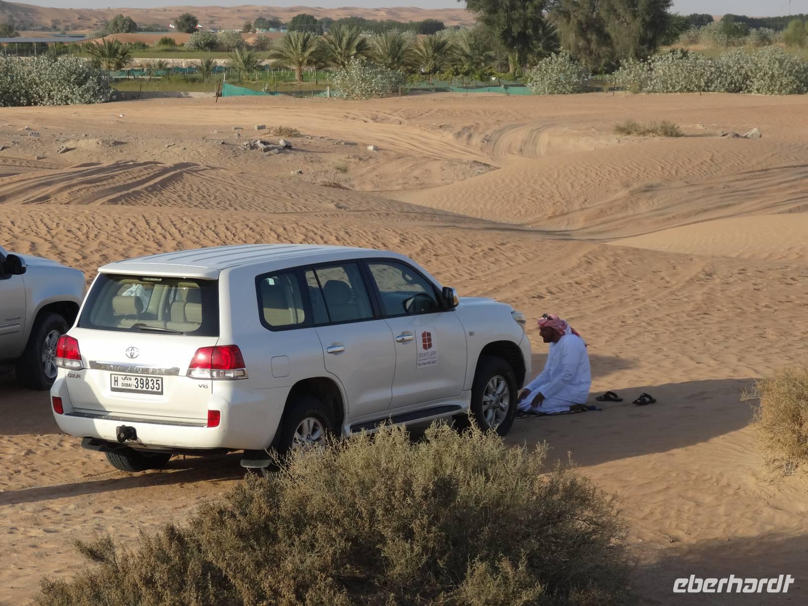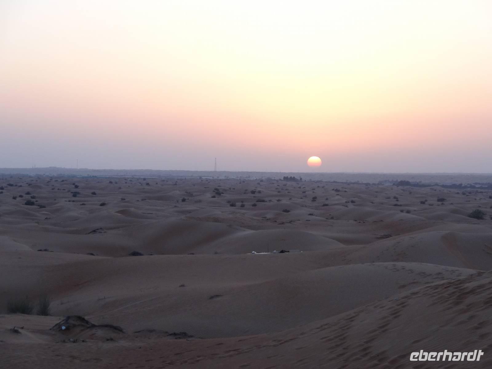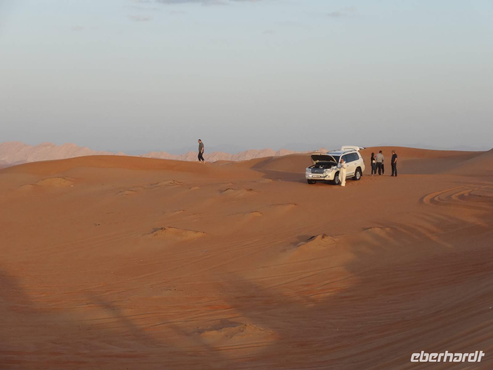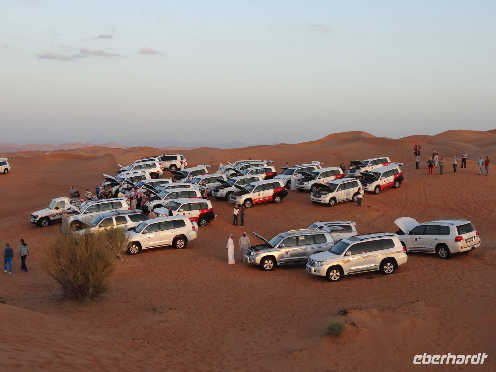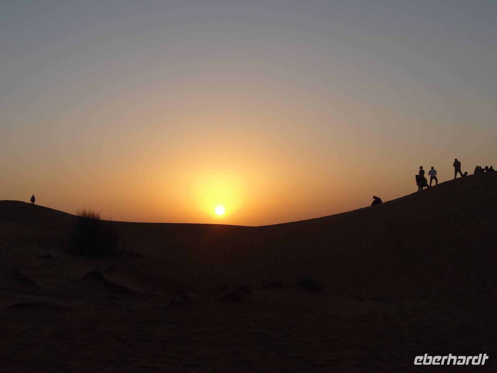 Eberhardt TRAVEL treibt seine Reisegäste nicht nur auf die Palme (Palm Jumeirah), sondern schickt sie auch noch in die Wüste . Deshalb stehen nach dem Mittagessen im Hotel schon unsere modernen Jeeps für die bevorstehende Wüstentour bereit. Die Fahrer haben die Autos bestens unter Kontrolle und zeigen uns natürlich ihre Fahrkünste. So lassen die mutigen Gruppen unter uns keine Düne aus und alle haben auf der Fahrt zum Wüstencamp jede Menge Spaß! Wir halten mitten in der Wüste und können dort einen herrlichen Sonnenuntergang erleben. Später im Wüstencamp sitzen wir gemütlich unter freiem Sternenhimmel, die Henna-Lady zaubert kleine Kunstwerke auf die Haut einiger Frauen und die Köche leisten auch sehr gute Arbeit. Das Barbecue schmeckt in dieser Atmosphäre natürlich umso besser! Ein Darwish-Tänzer und eine Bauchtänzerin runden den Abend bei orientalischen Klängen wunderschön ab. Mit den Jeeps geht es dann zurück nach Dubai und ins Hotel.