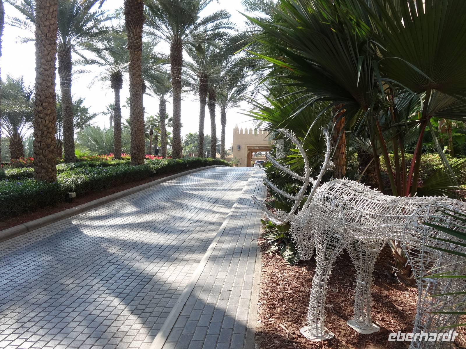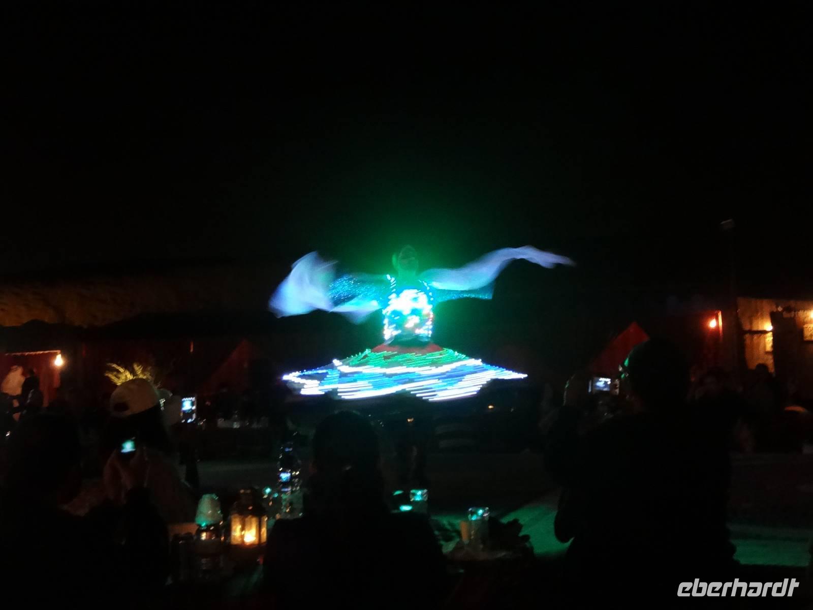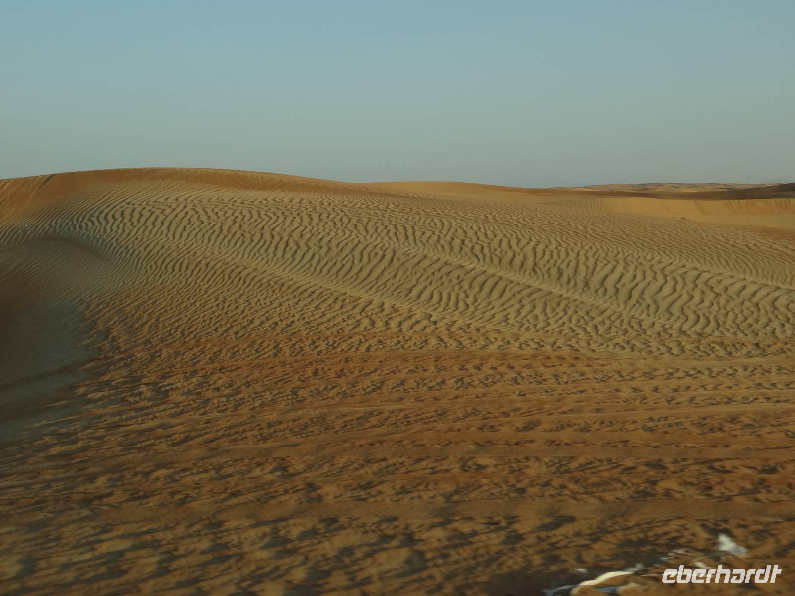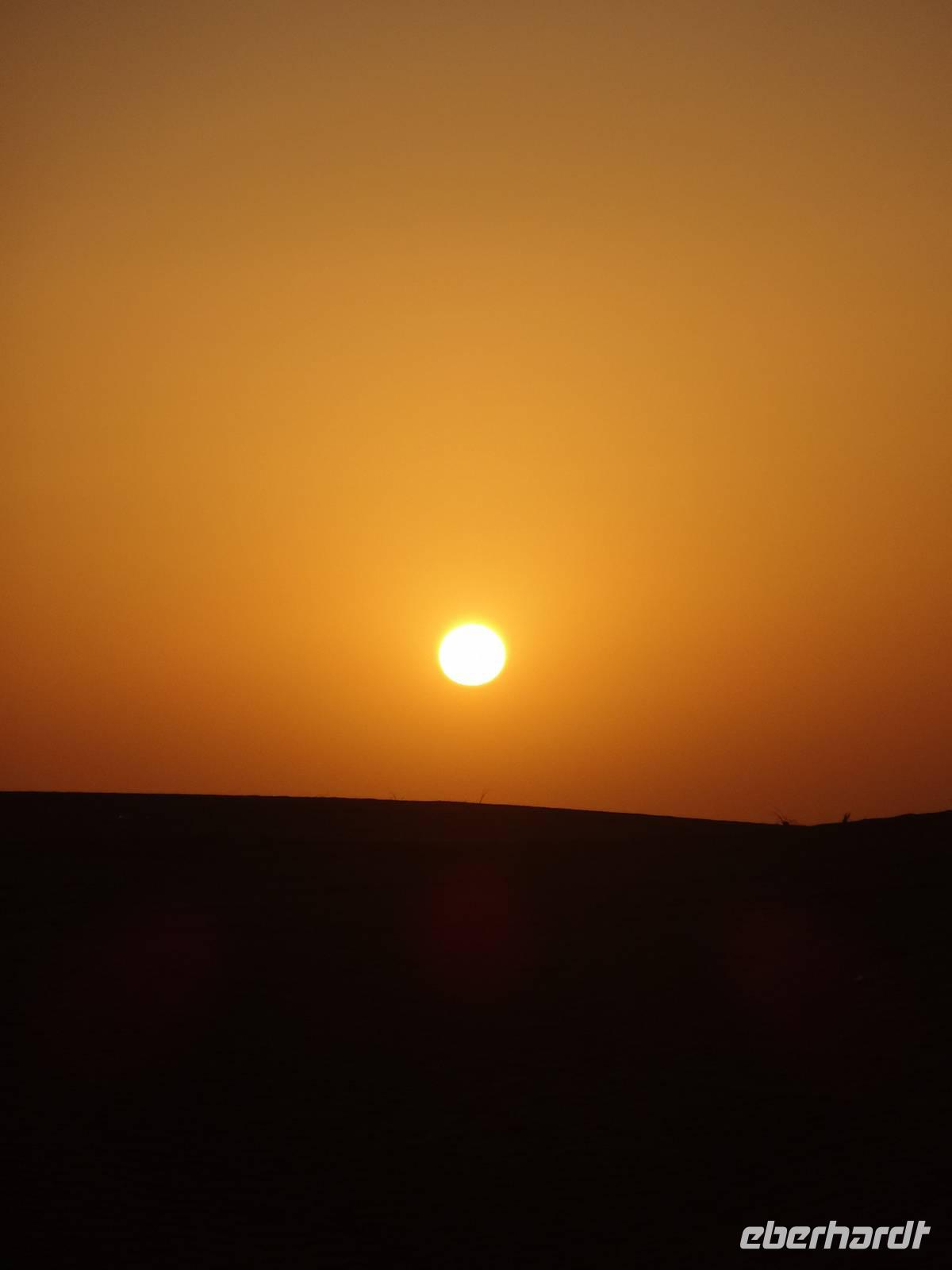 Eberhardt TRAVEL treibt seine Reisegäste nicht nur auf die Palme (Palm Jumeirah), sondern schickt sie auch noch in die Wüste . Deshalb stehen nach dem Mittagessen im Hotel schon unsere modernen Jeeps für die bevorstehende Wüstentour bereit. Die Fahrer haben die Autos bestens unter Kontrolle und zeigen uns natürlich ihre Fahrkünste. So lassen die mutigen Gruppen unter uns keine Düne aus und alle haben auf der Fahrt zum Wüstencamp jede Menge Spaß! Wir halten mitten in der Wüste und können dort einen herrlichen Sonnenuntergang erleben. Später im Wüstencamp sitzen wir gemütlich unter freiem Sternenhimmel, die Henna-Lady zaubert kleine Kunstwerke auf die Haut einiger Frauen und die Köche leisten auch sehr gute Arbeit. Das Barbecue schmeckt in dieser Atmosphäre natürlich umso besser! Ein Darwish-Tänzer und eine Bauchtänzerin runden den Abend bei orientalischen Klängen wunderschön ab. Mit den Jeeps geht es dann zurück nach Dubai und ins Hotel.
