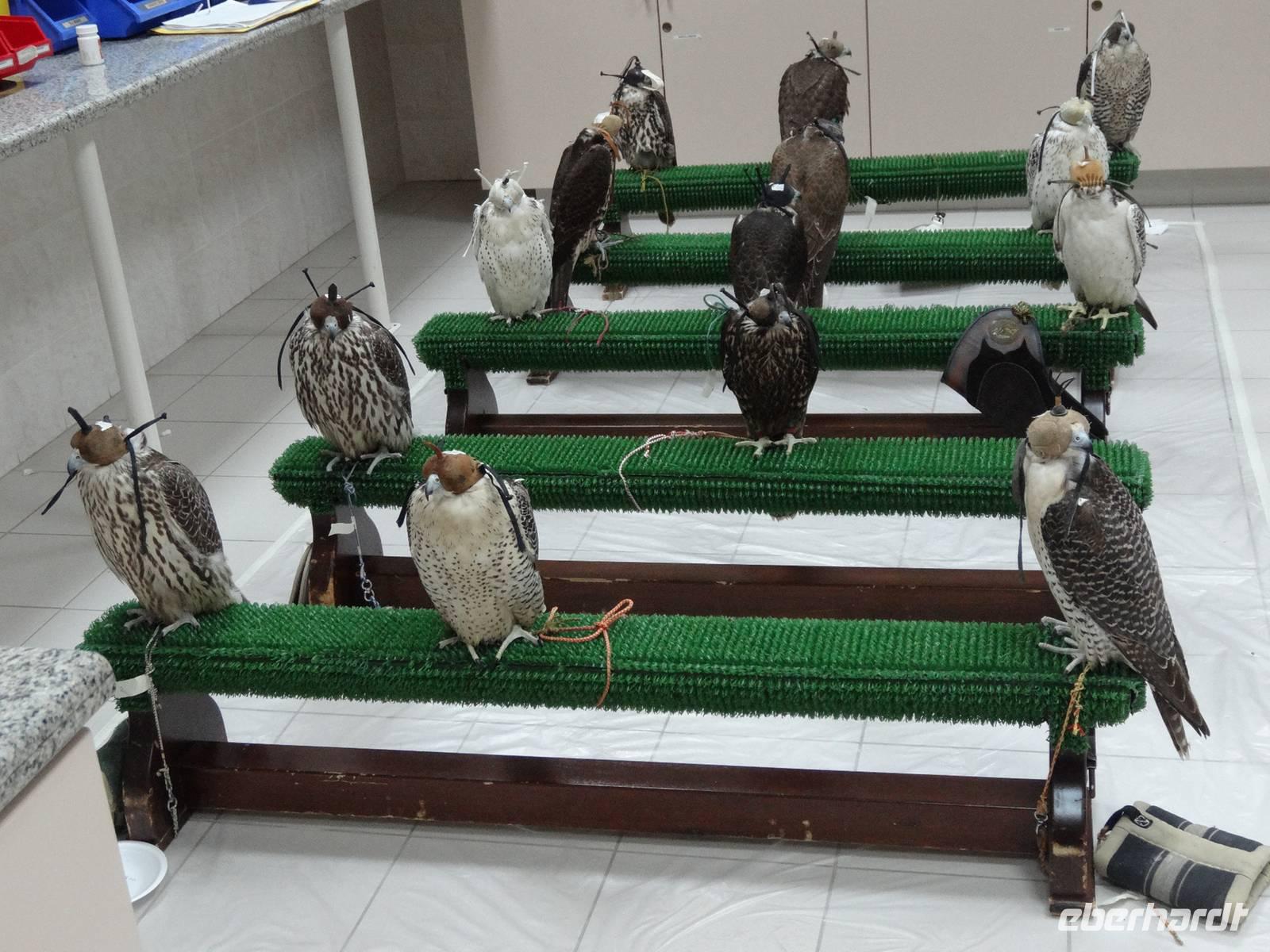 Heute fahren wir ins größte der sieben Emirate, nach Abu Dhabi, in die gleichnamige Hauptstadt! Es ist mit 80% Flächenanteil nicht nur das größte, sondern auch das reichste Emirat aufgrund des großen Ölvorkommens. Es ist auch das grünste Emirat, was wiederum auf Reichtum schließen lässt, denn in dieser eigentlich trockenen Wüstenregion müssen alle Bäume und Pflanzen künstlich angelegt werden. Nach mehr als 100 Kilometern Busfahrt fahren wir zunächst an Yas Island vorbei. Erster Stopp ist der Besuch des "Falcon Hospital". Hier sehen wir zahlreiche der Nationaltiere bei einer Führung durch die Falkenklinik. Wir sehen mit großem Interesse und mehr oder weniger Freude einer kompletten Behandlung der Tiere zu: Betäubung, Pediküre, Vitaminspritzen und Fütterung stehen auf dem Programm. Auch heute sind hier Falken zu sehen, deren Wert an die 100.000 € geht! Der Falke wird hier verehrt, gehegt und gepflegt - er ist einfach das liebste Haustier der Emiratis! Entgegen der sonstigen Natur sind hier die Weibchen das schönere, größere und somit teurere Geschlecht !