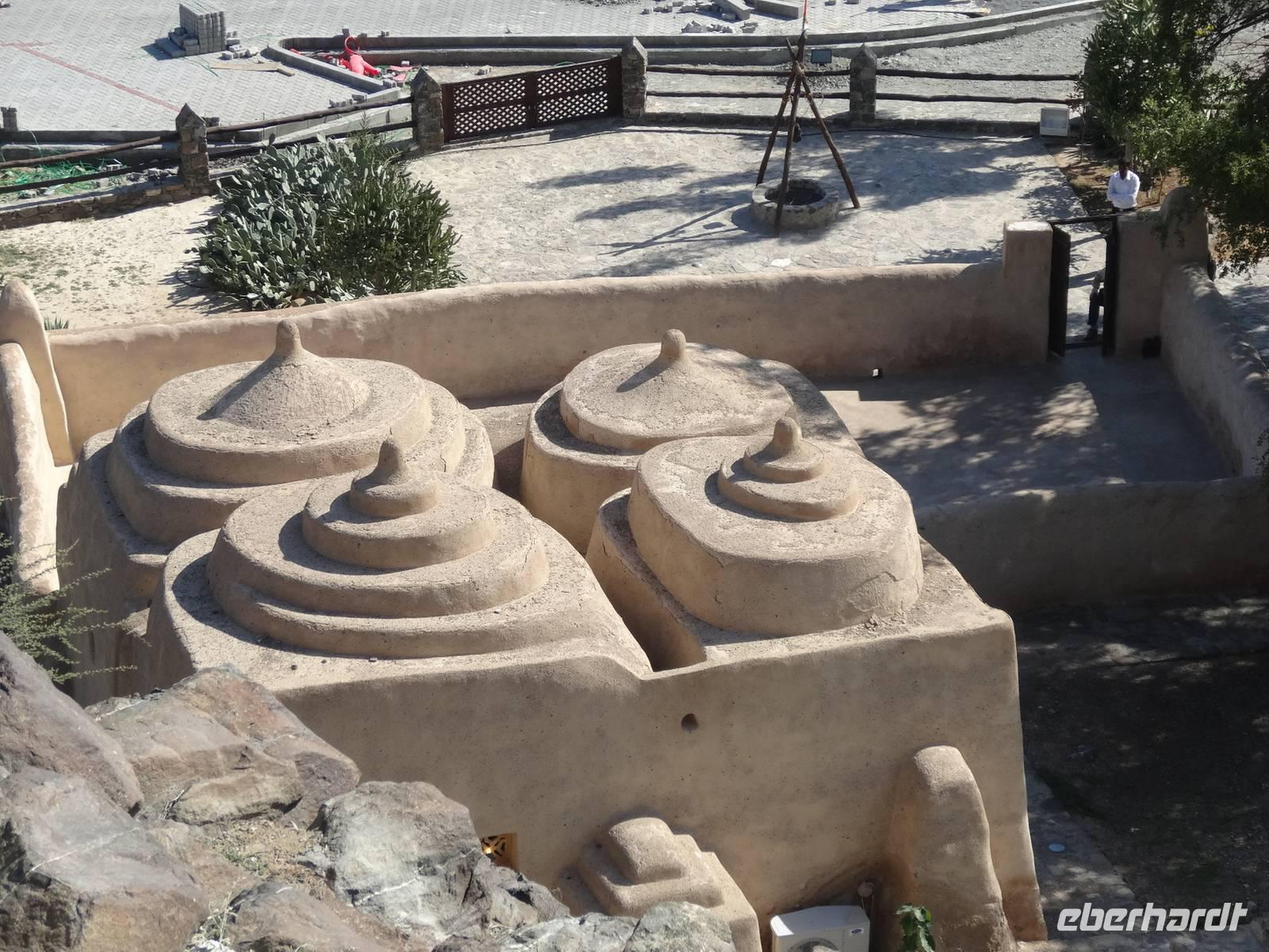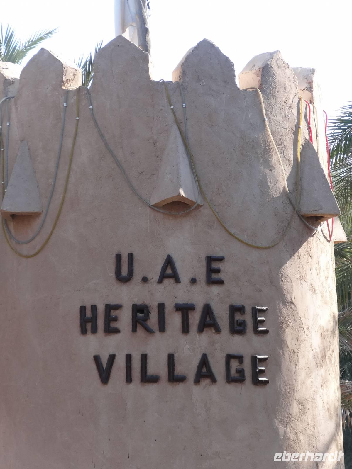 Wir besuchen zunächst das Heritage Village. Diese Anlage ist einem traditionellen Beduinendorf nachempfunden und bietet durch seine Lage einen genialen Blick auf die Skyline der Stadt auf der gegenüberliegenden Seite. Im Freilichtmuseum schauen wir Handwerkern bei ihrer Arbeit über die Schulter. Wir sehen Weber, Metallschläger, Töpfer und Schneider. Auf einem kleinen traditionellen Souk werden sehr schöne Souvenirs günstig verkauft.