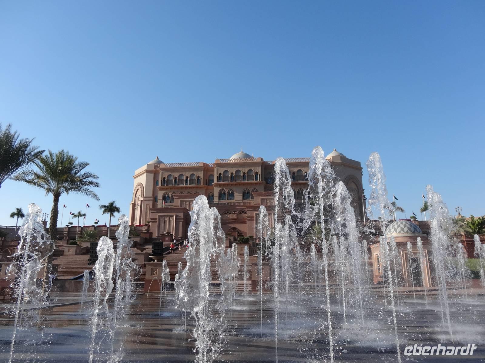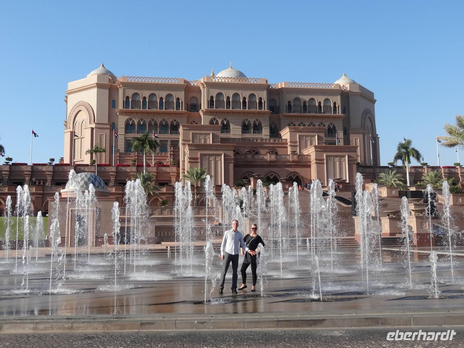 Nach einer kurzen Fahrt erreichen wir das 6-Sterne-Hotel Emirates Palace. Bereits aus der Ferne beeindruckt dieser riesige Palast mit seinen 114 orientalischen Türmchen und Kuppeln. Das von der Regierung finanzierte Gebäude der Luxusklasse sollte ursprünglich als Palastanlage für den Scheich Zayed bin Sultan Al Nahyan errichtet werden. Er war seit der Unabhängigkeit im Jahre 1971 der erste Präsident der Emirate, starb jedoch 2004. Nun ist das Emirates Palace ein Hotel der Luxusklasse! Wir genießen das orientalische Ambiente in diesem Luxushotel beim High Tea. Feinste kulinarische herzhafte und süße Köstlichkeiten genießen wir zum späten Mittag und dann kommt da plötzlich noch die "Chocolate Fountain" mit echtem, essbarem Blattgold dekoriert. Diesen Märchenpalast aus "1001 Nacht" durchweht der Atem vun Luxus und Reichtum bis in jede Ecke. Hier ist wirklich alles Gold was glänzt! Schön, wenn man für einige Momente mitgenießen darf ...