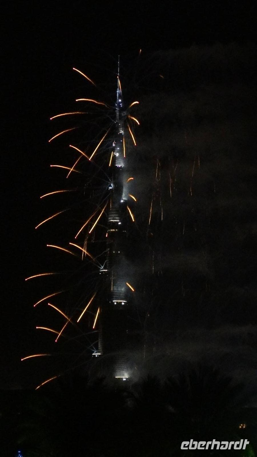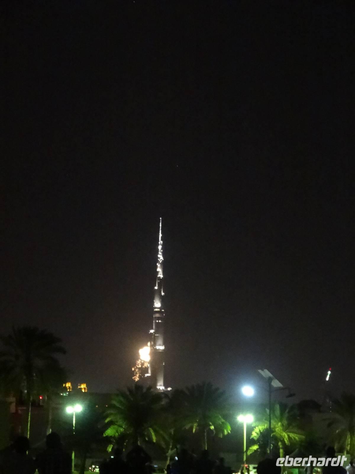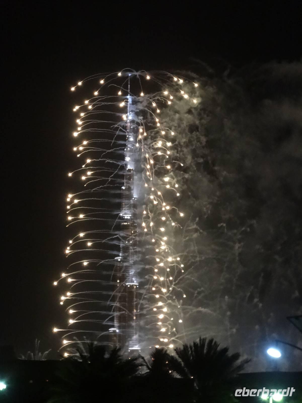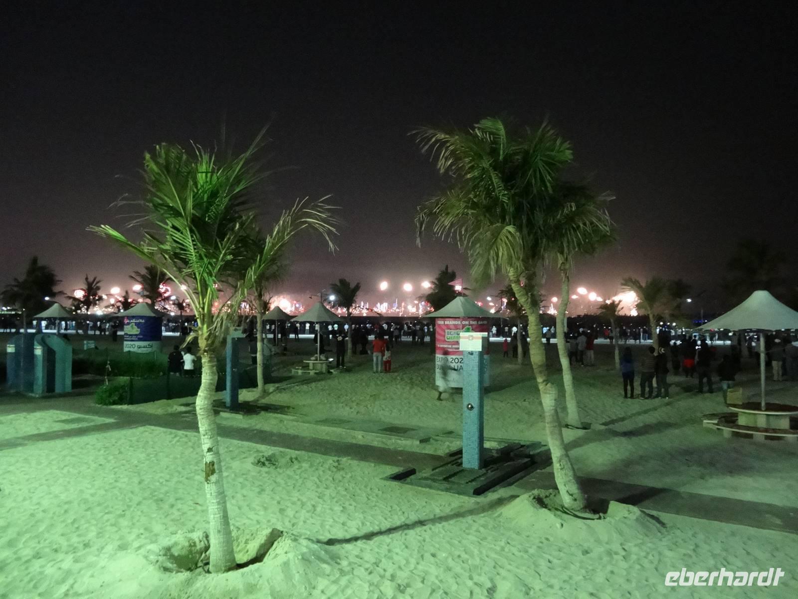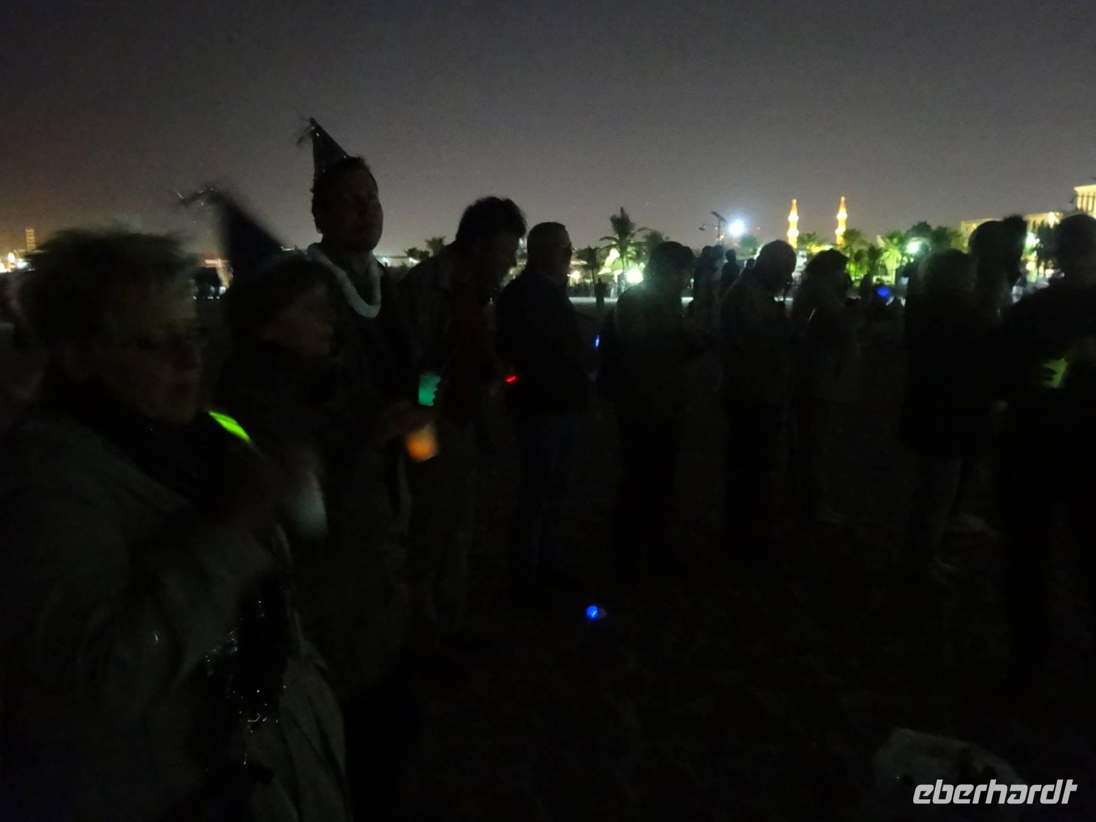 Gegen 22 Uhr wartet unser Fahrer Baboo vor dem Hotel und der Großteil der Gruppe wagt sich ins „Abenteuer Feuerwerk", denn keiner weiß, was uns wirklich erwarten wird und ob wir eventuell nur auf den überfüllten Straßen im Stau feststecken werden ... Doch wir sind nach einer Stunde Fahrt am geplanten Punkt am Jumeirah Beach und verabschieden uns für dieses Jahr von Baboo - er darf uns dann in zwei Stunden 2014 wieder abholen .Wir laufen an den Strand und scheinen nicht die einzigen mit dieser Idee zu sein. Viele Einheimische treffen wir hier. Somit hatte unsere Reiseleiterin Anja scheinbar das richtige Gefühl ... Kurz vor Mitternacht stoßen wir das erste Mal mit unserem mitgebrachten alkoholfreien Sekt und den neonfarbenen Trinkröhrchen an. Gleich ist es so weit! 3, 2, 1 ... Happy New Year! Und wir werden nicht enttäuscht! Wir sehen ein gigantisches Feuerwerk am Burj Khalifa aufsteigen auf einer Höhe von bis zu 800 Metern - unglaublich! Anschließend bestaunen wir aus der Ferne das Feuerwerk auf der Palm-Insel. Äußerst zufrieden machen wir uns auf den Rückweg zum Bus. Doch plötzlich geht ein großen Raunen und Staunen durch die Menschenmengen und ein Feuerwerk entlang der gesamten Küste soweit das Auge reicht erhellt den Himmel und den Strand für mehrere Minuten! So etwas haben wir alle noch nie gesehen! Nun noch die knallharten Daten und Fakten : Bei diesem Rekordfeuerwerk wurden mehr als eine halbe Million Feuerwerkskörper durch 200 Techniker für etwa 4,4 Millionen Euro auf einer Länge von insgesamt über 96 Kilometer abgefeuert! Einige Tage später erfahren wir, dass Dubai mit diesem Feuerwerk wirklich ins Guiness-Buch der Rekorde eingeht.