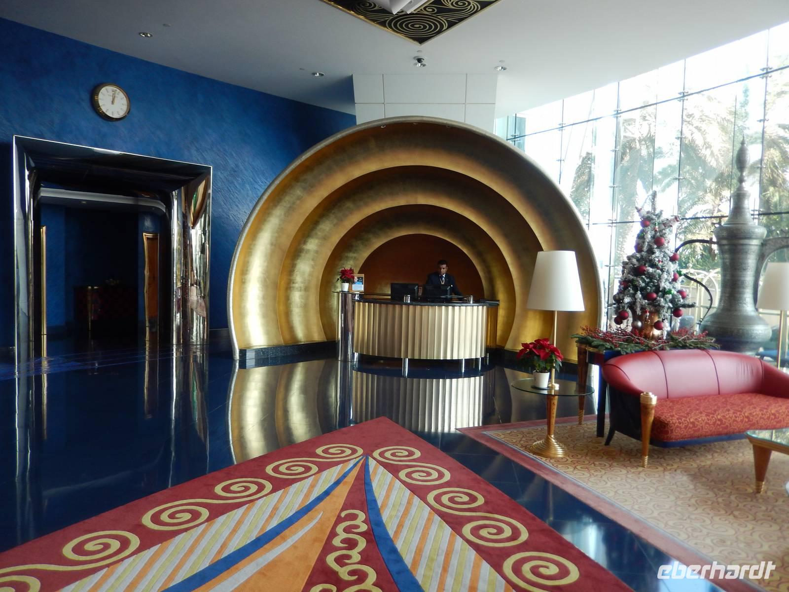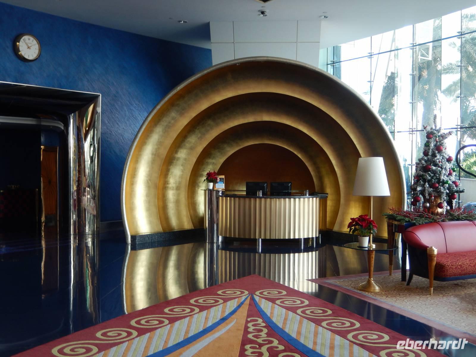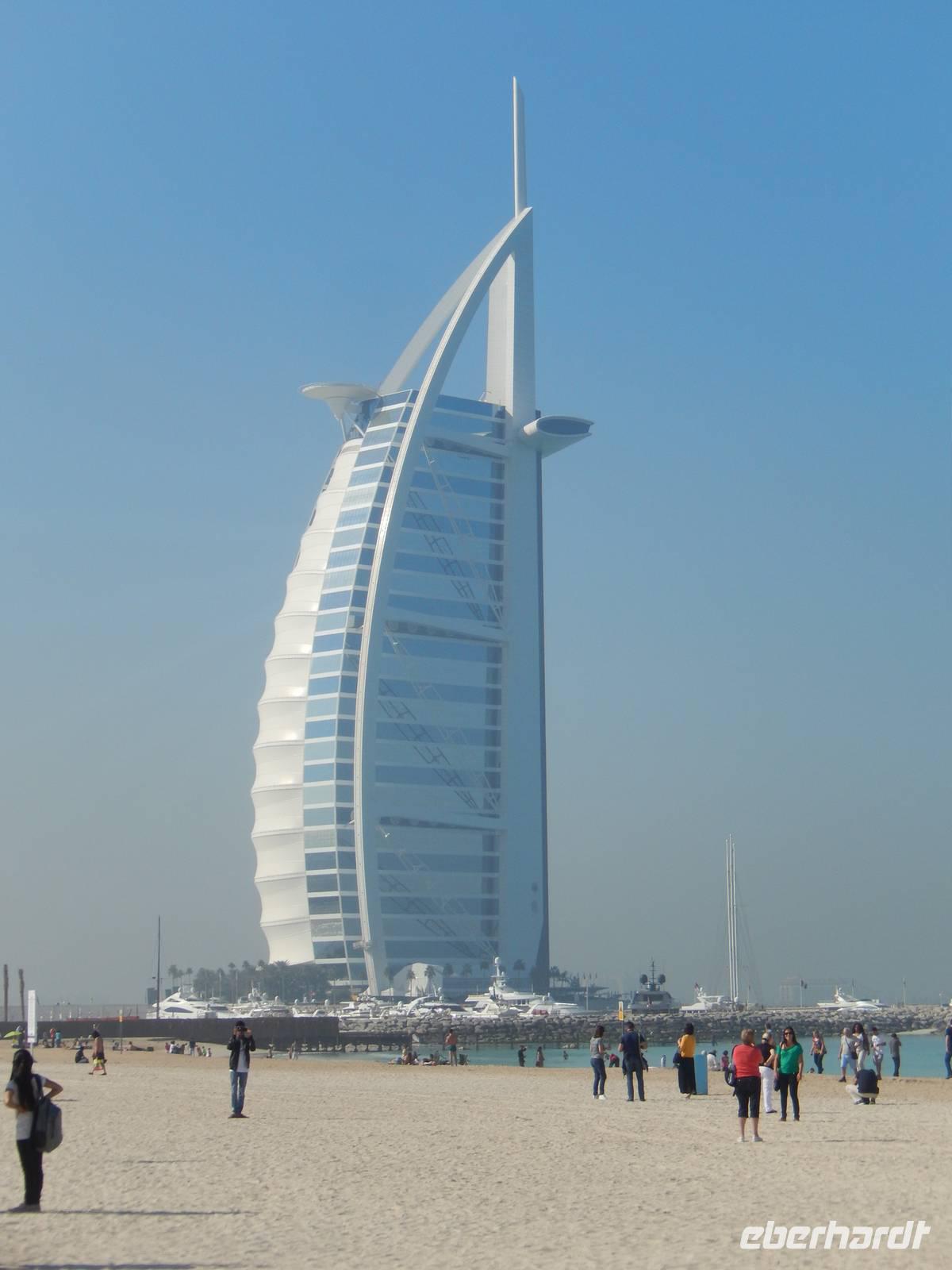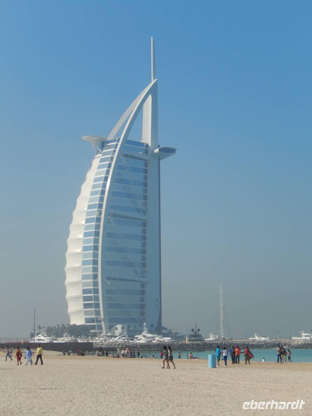 Unser Vormittag steht uns heute zur freien Verfügung. So nutzen wir die Möglichkeit um uns ein wenig in unserem Stadtteil umzusehen, ein paar Einkäufe zu erledigen, am Creek zu spazieren oder einfach am Hotelpool zu entspannen.Geschniegelt und gestriegelt, wie frisch aus dem Ei gepellt, machen wir uns am Neujahrstag auf zum Symbol des modern-futuristischen Dubai. 321 Meter ragt der Arabische Turm in den Himmel - die spektakulärste und bereits kurz nach der Eröffnung im Jahr 2000 wohl berühmteste Luxushotel der Welt. Das neue Wahrzeichen Dubais ließ sich das kleine Scheichtum sagenhafte 1,5 Milliarden Euro kosten. An Superlativen herrscht kein Mangel: Das höchste Hotel der Welt, ein Denkmal des Luxus, der Garten Allahs auf Erden. Auf einer eigens geschaffenen künstlichen Insel 300 Meter vor dem Jumeirah-Strand von Dubai erbaut, reckt sich das Burj al Arab in die Höhe wie das geblähte Segel einer altarabischen Dhau. Bevor wir heute in diesem Hotel zum Mittagessen eingeladen sind, besuchen wir den wunderschönen Madinat Souk. Für uns gehörte der Souk zu den schönsten, die wir gesehen haben. Der exquisite Souk besticht vor allem durch seinen arabischen Stil , beste Restaurants, niedliche Cafés und Bars. Von hier aus hat man außerdem einen wunderschönen Blick auf das Burj al Arab. Man kommt sich ein bisschen vor wie in Venedig. Auch ein Gruppenbild darf hier natürlich nicht fehlen.Nach unserer freien Zeit im Souk fahren wir gemeinsam zum Burj al Arab. Im Inneren trauen wir unseren Augen kaum. Die Lobby ist ein Dom aus Licht und Gold. Aus vollständig mit 0,001 Milimeter dünnem Blattgold überzogenen Säulen ranken sich goldenen Baldachine hervor. Die Wasserfontäne des Brunnens schießt 50 Meter in die Höhe. Wir erfahren, dass eine Nacht in der 780 Quadratmeter großen Royal Suite 8500 Euro kostet - ohne Frühstück aber zumindest mit Butler. Ein bisschen fühlen wir uns schon wie im Traum. Nachdem wir uns ein wenig umgesehen haben, öffnet sich für uns das arbaische Restaurant auf der ersten Etage des Hotels. Wir plazieren uns ganz sorgfältig und bestellen uns einige Getränke. Unserem Geldbeutel tut das nicht sonderlich gut, aber wir essen ja auch nur einmal im Burj al Arab! Kurze Zeit später probieren wir allerlei Köstlichkeiten wie Austern, Hummer, Sushi oder Garnelen. Nach diesem Festmahl schlenderten wir noch ein wenig im Hotel herum und schossen unsere letzten Fotos. Am Abend genießen wir ein letztes Abschiedsessen und bedanken uns herzlich bei dem Personal des Restaurants sowie bei dem der Rezeption und des Services. Sie haben uns immer tolle Organisation, leckere Mahlzeiten und exzellenten Service geboten. Ein wenig traurig sind wir schon, dass unsere Reise sich nun langsam dem Ende neigt.