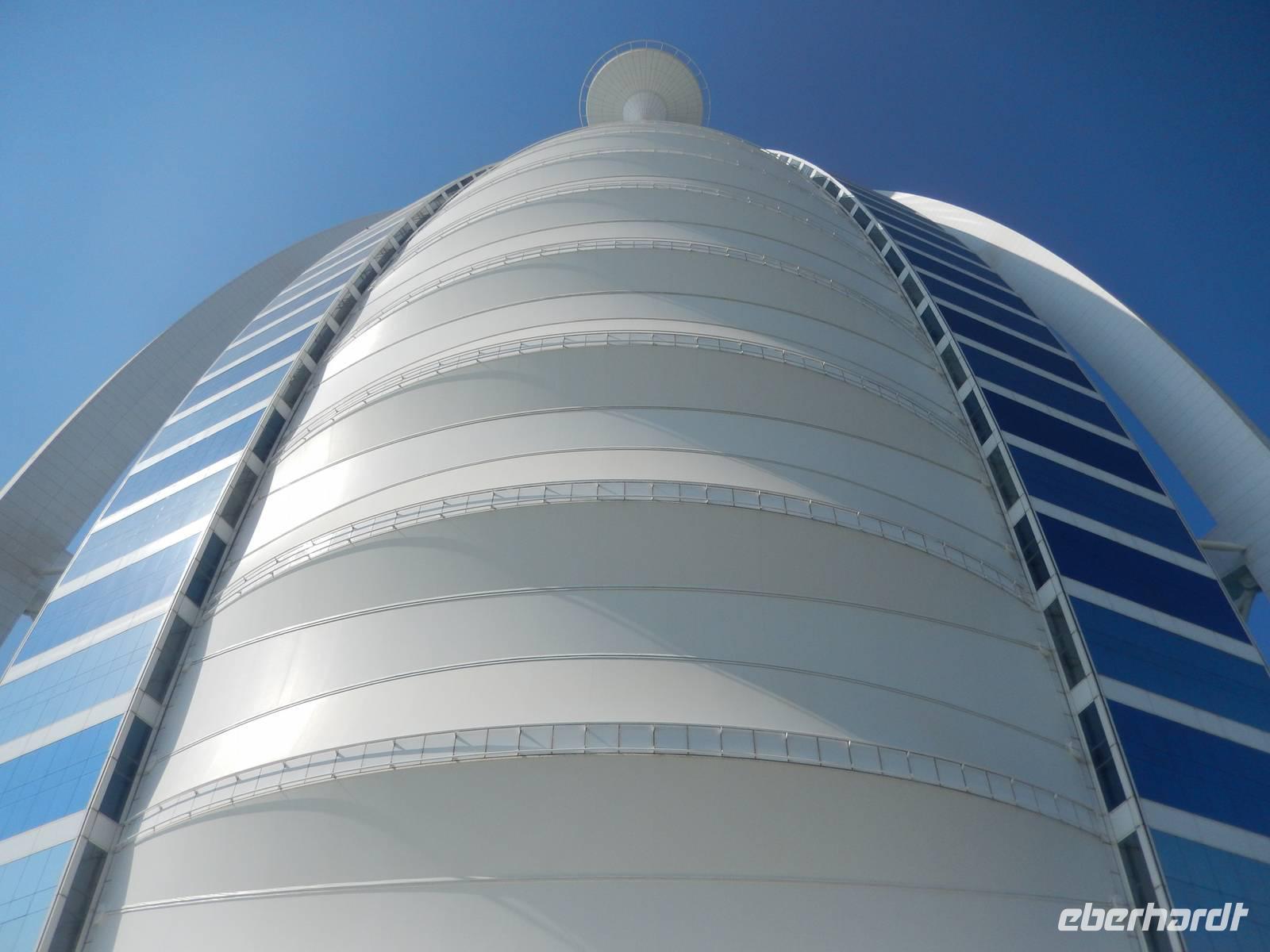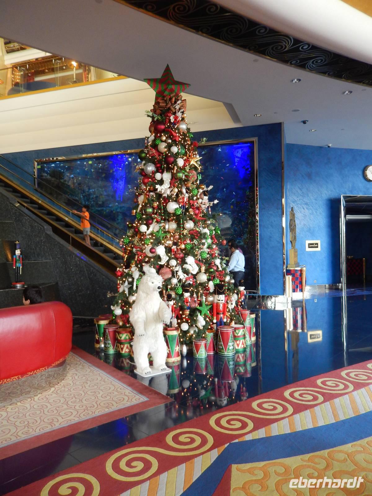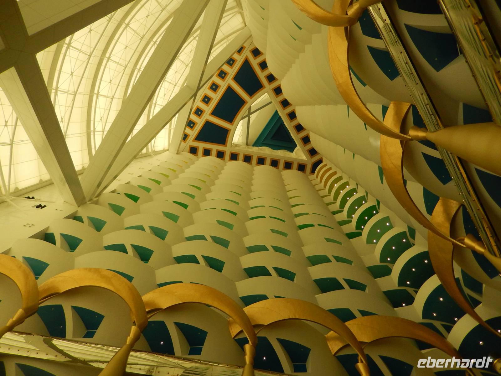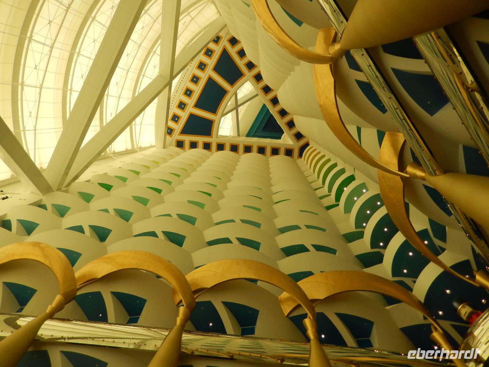 Unser Vormittag steht uns heute zur freien Verfügung. So nutzen wir die Möglichkeit um uns ein wenig in unserem Stadtteil umzusehen, ein paar Einkäufe zu erledigen, am Creek zu spazieren oder einfach am Hotelpool zu entspannen.Geschniegelt und gestriegelt, wie frisch aus dem Ei gepellt, machen wir uns am Neujahrstag auf zum Symbol des modern-futuristischen Dubai. 321 Meter ragt der Arabische Turm in den Himmel - die spektakulärste und bereits kurz nach der Eröffnung im Jahr 2000 wohl berühmteste Luxushotel der Welt. Das neue Wahrzeichen Dubais ließ sich das kleine Scheichtum sagenhafte 1,5 Milliarden Euro kosten. An Superlativen herrscht kein Mangel: Das höchste Hotel der Welt, ein Denkmal des Luxus, der Garten Allahs auf Erden. Auf einer eigens geschaffenen künstlichen Insel 300 Meter vor dem Jumeirah-Strand von Dubai erbaut, reckt sich das Burj al Arab in die Höhe wie das geblähte Segel einer altarabischen Dhau. Bevor wir heute in diesem Hotel zum Mittagessen eingeladen sind, besuchen wir den wunderschönen Madinat Souk. Für uns gehörte der Souk zu den schönsten, die wir gesehen haben. Der exquisite Souk besticht vor allem durch seinen arabischen Stil , beste Restaurants, niedliche Cafés und Bars. Von hier aus hat man außerdem einen wunderschönen Blick auf das Burj al Arab. Man kommt sich ein bisschen vor wie in Venedig. Auch ein Gruppenbild darf hier natürlich nicht fehlen.Nach unserer freien Zeit im Souk fahren wir gemeinsam zum Burj al Arab. Im Inneren trauen wir unseren Augen kaum. Die Lobby ist ein Dom aus Licht und Gold. Aus vollständig mit 0,001 Milimeter dünnem Blattgold überzogenen Säulen ranken sich goldenen Baldachine hervor. Die Wasserfontäne des Brunnens schießt 50 Meter in die Höhe. Wir erfahren, dass eine Nacht in der 780 Quadratmeter großen Royal Suite 8500 Euro kostet - ohne Frühstück aber zumindest mit Butler. Ein bisschen fühlen wir uns schon wie im Traum. Nachdem wir uns ein wenig umgesehen haben, öffnet sich für uns das arbaische Restaurant auf der ersten Etage des Hotels. Wir plazieren uns ganz sorgfältig und bestellen uns einige Getränke. Unserem Geldbeutel tut das nicht sonderlich gut, aber wir essen ja auch nur einmal im Burj al Arab! Kurze Zeit später probieren wir allerlei Köstlichkeiten wie Austern, Hummer, Sushi oder Garnelen. Nach diesem Festmahl schlenderten wir noch ein wenig im Hotel herum und schossen unsere letzten Fotos. Am Abend genießen wir ein letztes Abschiedsessen und bedanken uns herzlich bei dem Personal des Restaurants sowie bei dem der Rezeption und des Services. Sie haben uns immer tolle Organisation, leckere Mahlzeiten und exzellenten Service geboten. Ein wenig traurig sind wir schon, dass unsere Reise sich nun langsam dem Ende neigt.