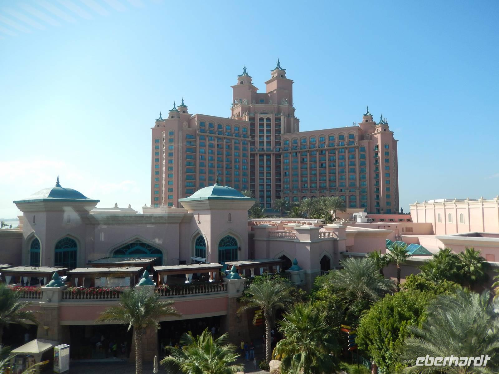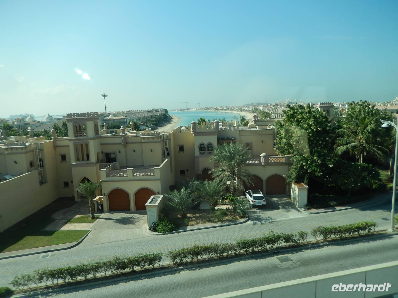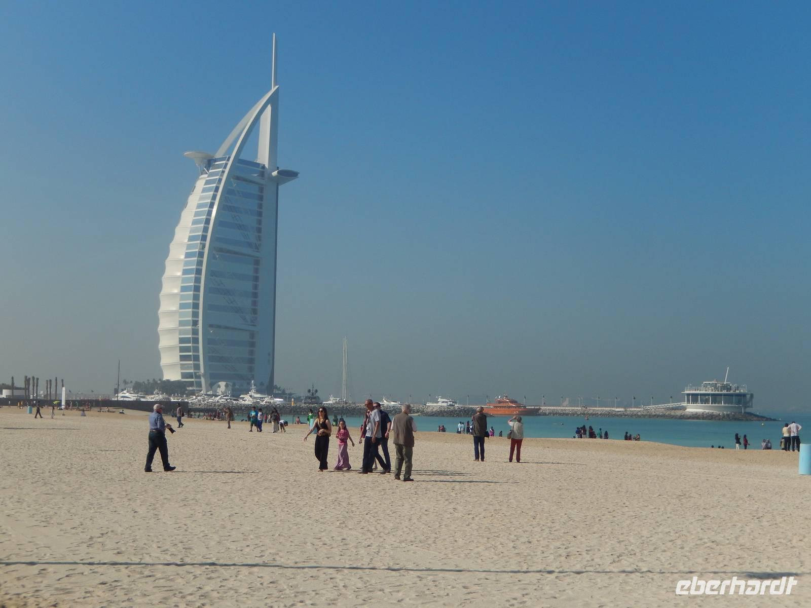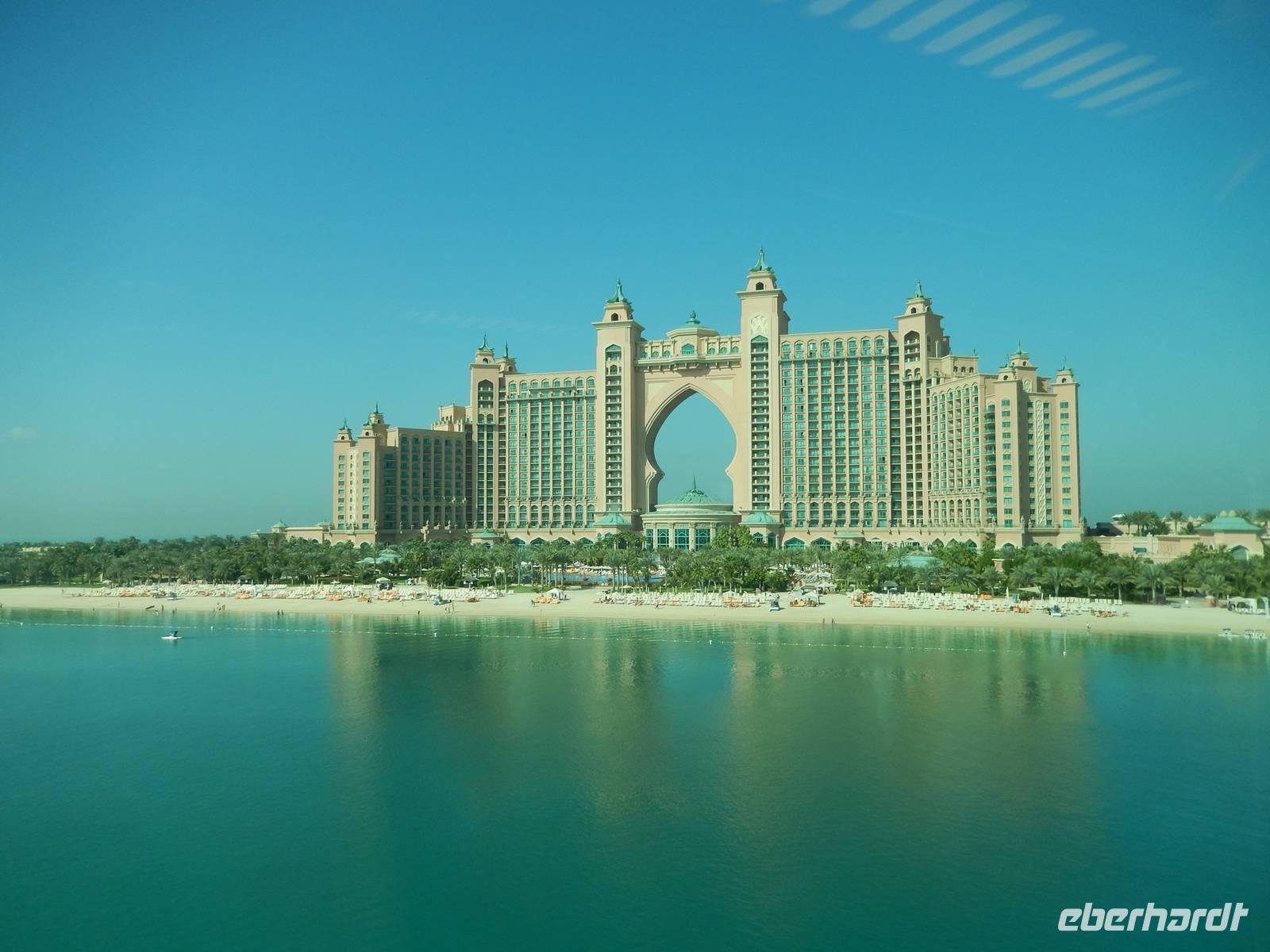 Unser Vormittag steht im Zeichen des Modernen Dubai. Zunächst halten wir für einen Fotostopp am Burj al Arab Hotel. Viele testen mit den Zehenspitzen die Wassertemperatur und empfinden diese als angenehm. Ein Höhepunkt jagt den nächsten und so erwartet uns The Palm Jumeirah - die Palme. An der Küste von Jumeirah erstreckt Sie sich 4,5 Kilometer ins Meer und ist die Erste von mehreren künstlichen Inseln, die fertiggestellt wurde. Über eine Brücke gelangt man auf den Stamm der Insel. Auf den insgesamt 16 Wedeln stehen ziemlich dicht nebeneinander Häuser und Villen, die zu den begehrtesten Immobilien des Emirats gehören. Anja erzählt uns, dass noch nicht alle der Häuser und Villen verkauft sind, so dass man diese teilweise zu sehr guten Preisen erwerben kann. Ein beinahe kreisförmiges, 150 Meter kreisförmiges Riff aus Sand und Steinen soll die Insel vor dem zerstörerischen Einfluss eines ungebremst anbrandenden Meeres schützen. Wir sehen, dass die Palme weitestgehend fertig gestellt ist, aber einige Baustellen doch noch zu bewältigen sind. Neben dieser Palme sollen noch zwei weitere geschaffen werden. Allerdings wurden diese Pläne aufgrund der Wirtschaftskrise erst einmal auf Eis gelegt. Am Scheitelpunkt der Palme sieht man das spektakuläre Themenhotel Atlantis. Ein gewaltiger rosfarbener Palast, der mit seiner Gestaltung Assoziationen an versunkene Unterwasserwelten wecken will. Leider haben Nicht-Hotelgäste keinen Zutritt aber Anja und Vicky haben sich schon etwas überlegt. So laden wir alle unseren lieben Gäste zu einer Fahrt mit der Monorail ein. Das Besondere daran ist, dass wir so zumindest in den Eingangsbereich des Hotels gelangen und dort einen Eindruck gewinnen wie es wohl ganz innen aussehen muss. So besorgen Anja und ich die Ticktes für die Monorail. Wir spazieren zusammen zu unserer Abfahrtsstation und genießen eine herrliche Fahrt mit dieser Schwebebahn über die Palme. So gewinnen wir auch wieder andere Perspektive vom Atlantis Hotel und der Palme mit ihren Wedeln als von unserem Bus aus.